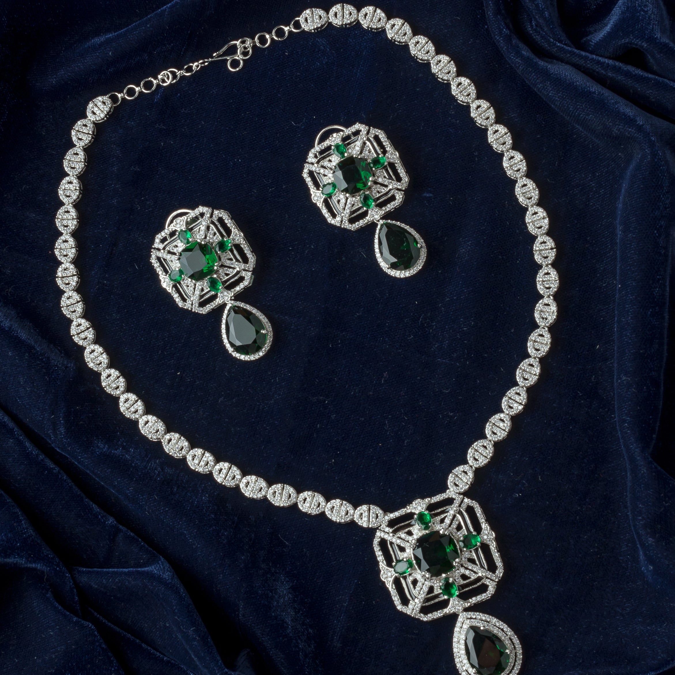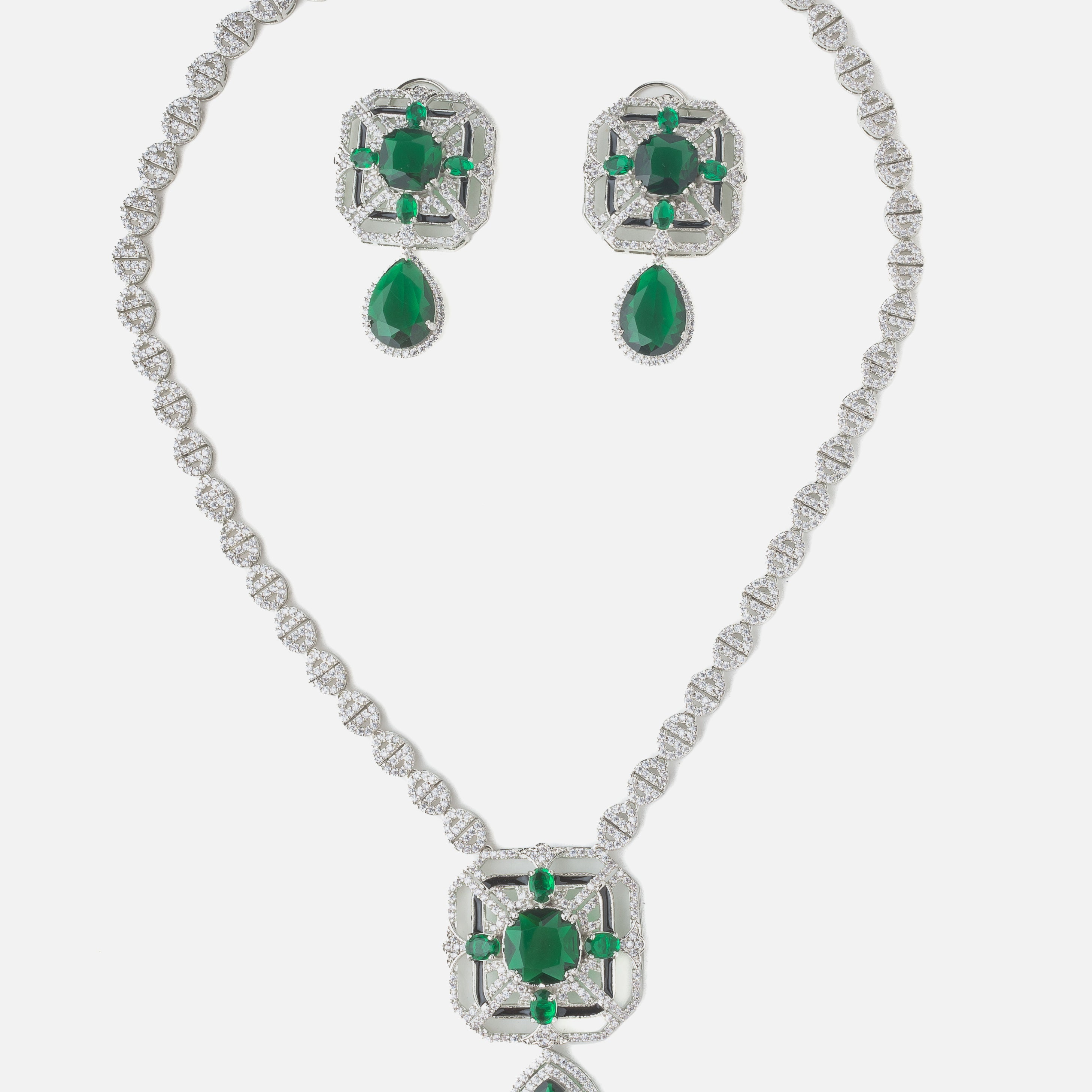 Zia Silver Plated Green Womens Emerald Synthetic Zircon Necklace Set with Pair of earrings