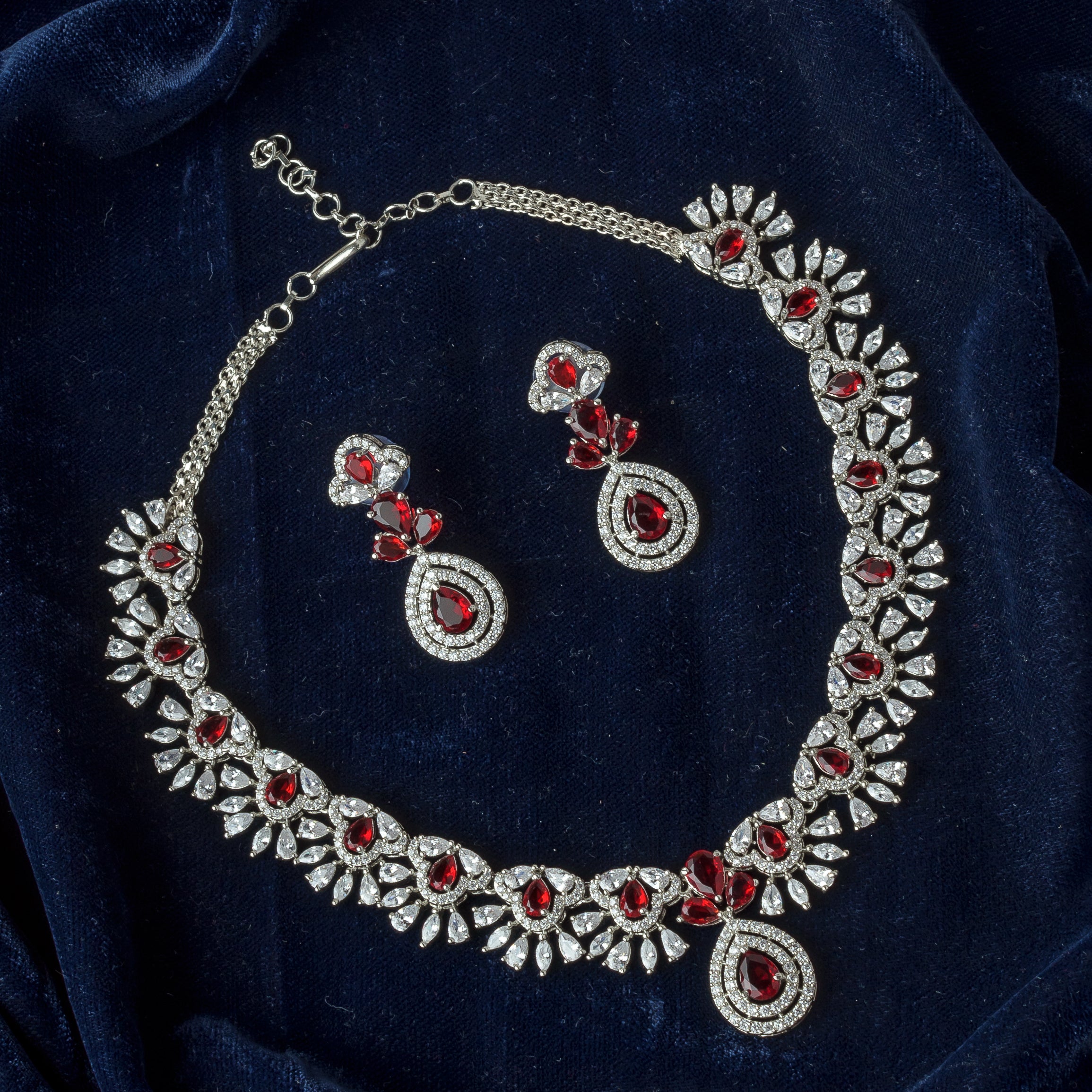 Zia Silver Plated Red Womens Ruby Synthetic Zircon Necklace Set with Pair of earrings