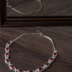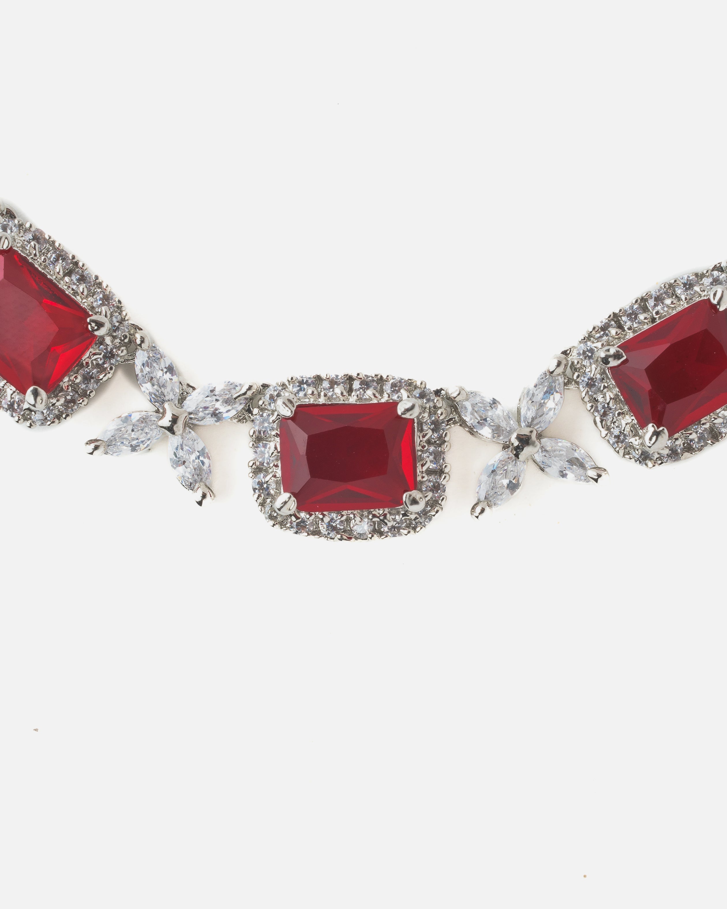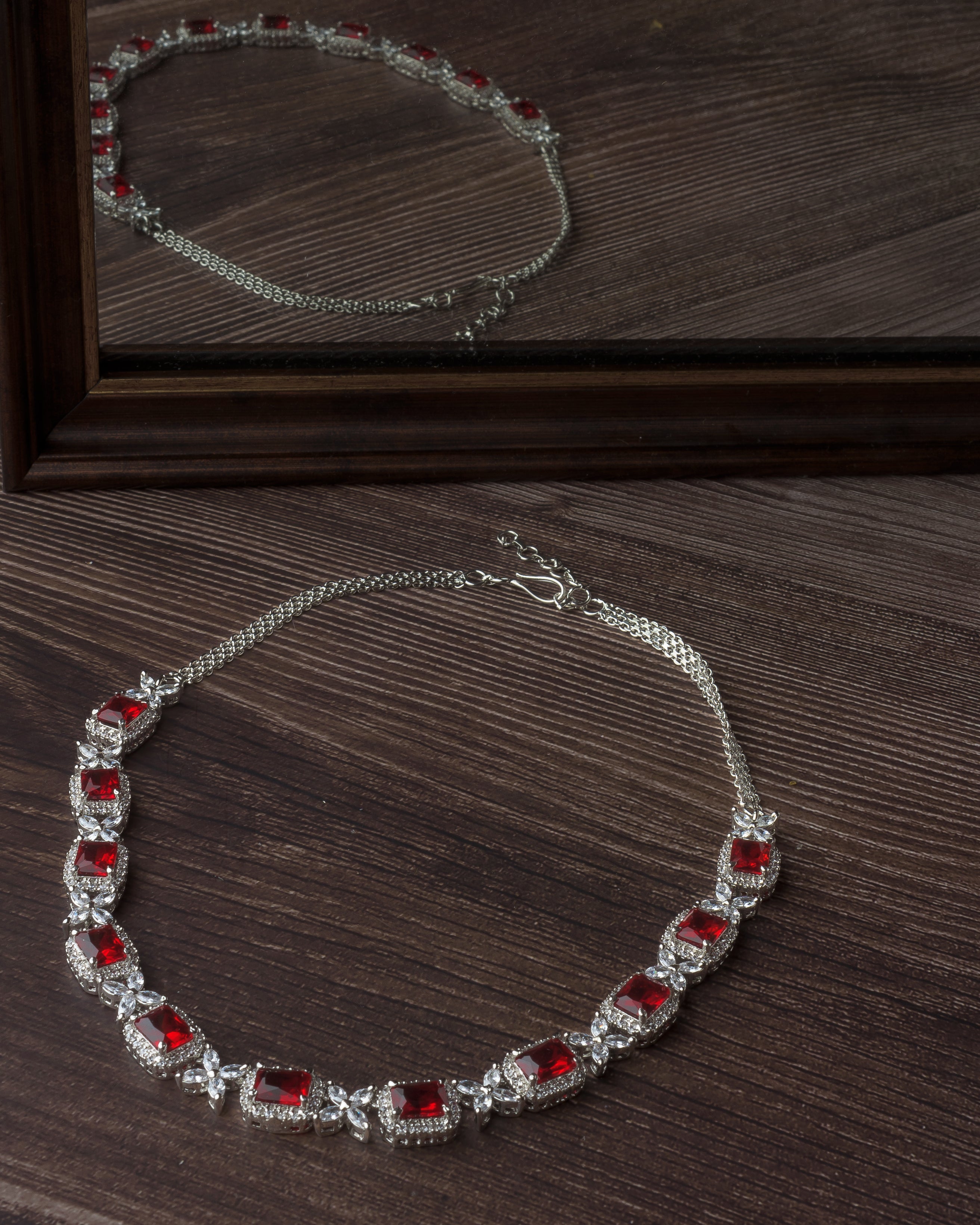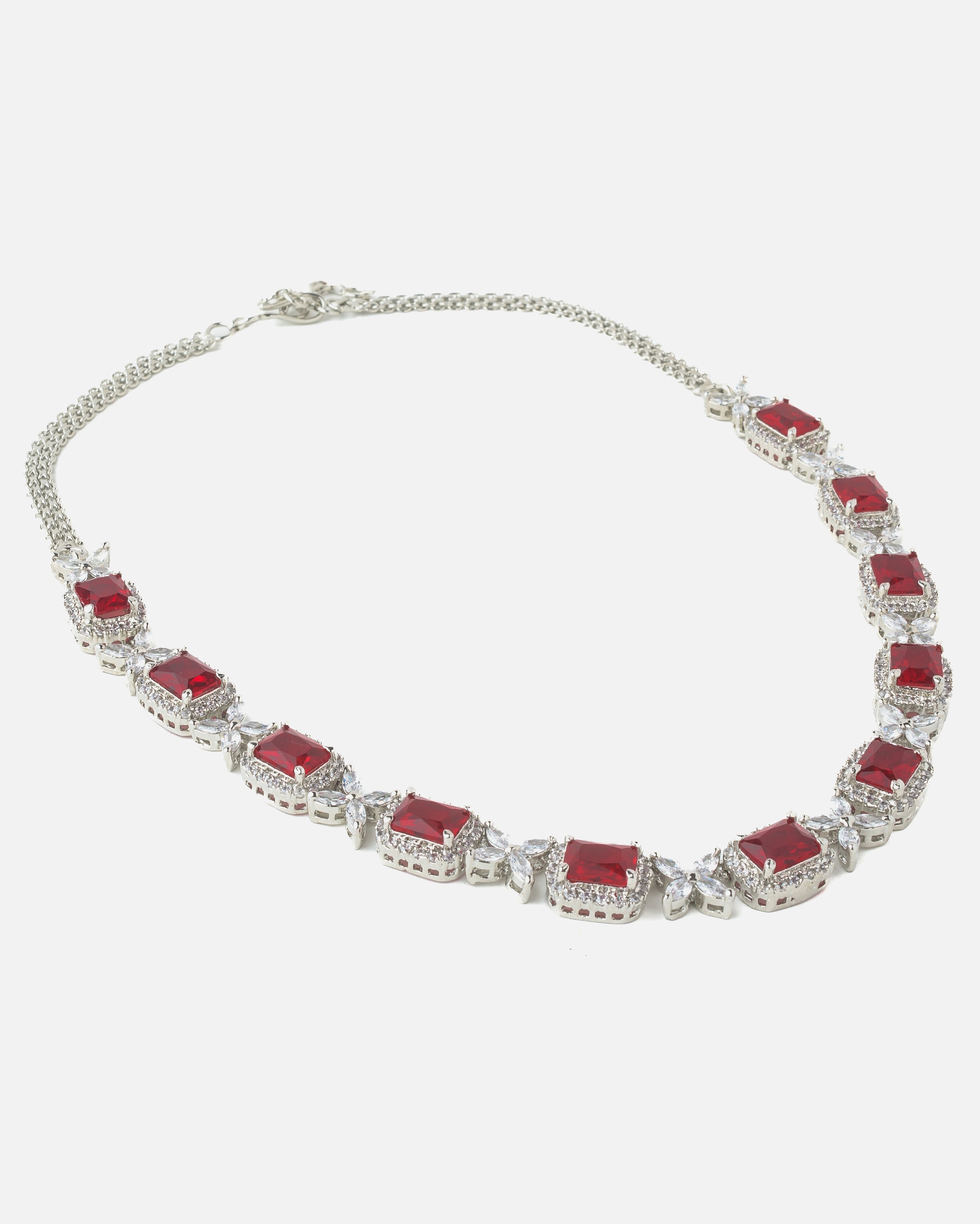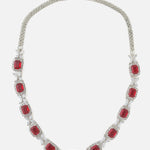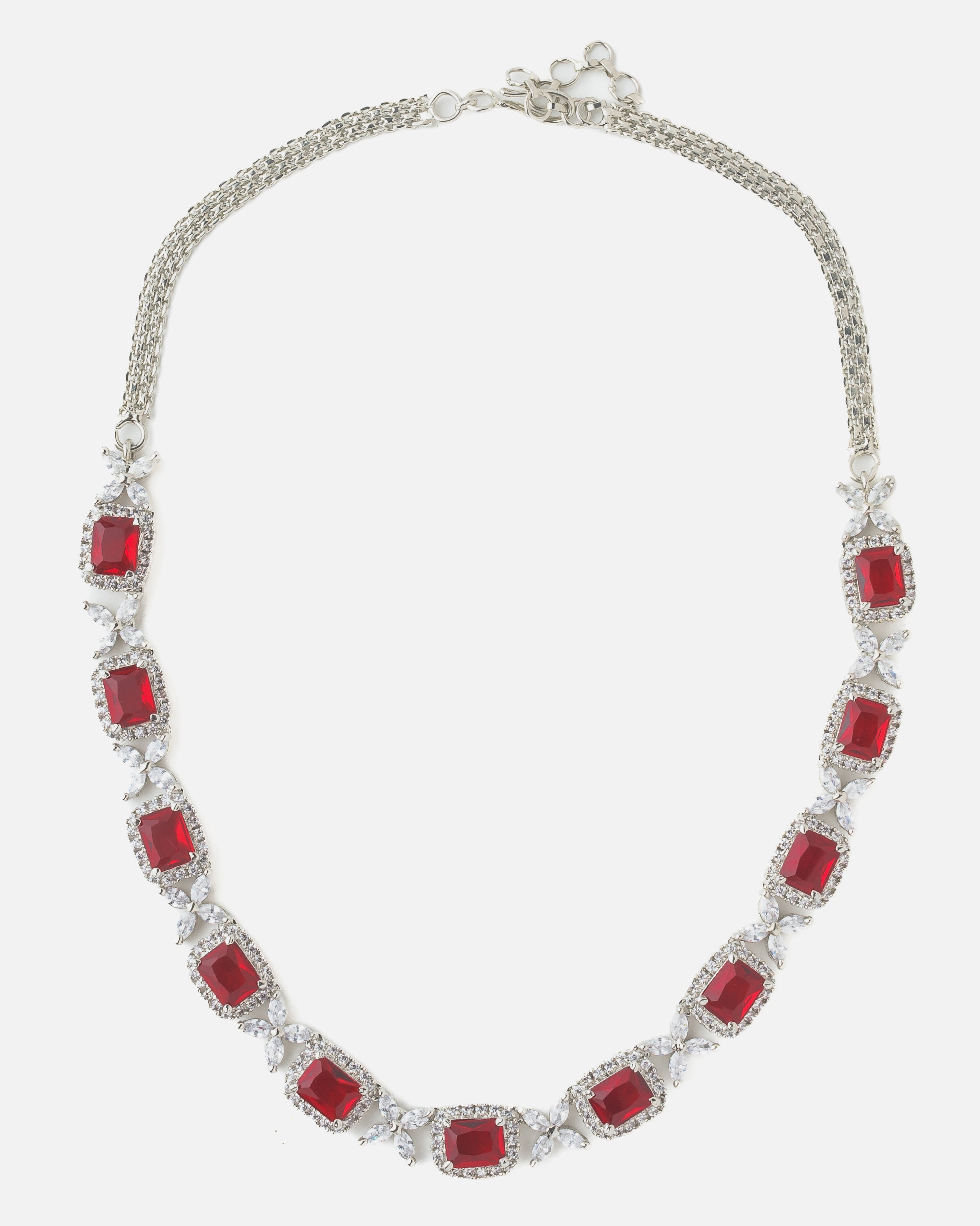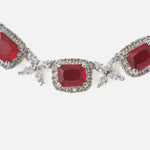 Elevate your style with this elegant silver-toned necklace, featuring vivid red rectangular stones surrounded by shimmering white crystals. Perfect for festive occasions and evening parties, it exudes timeless charm.