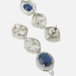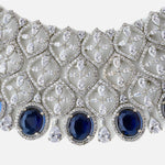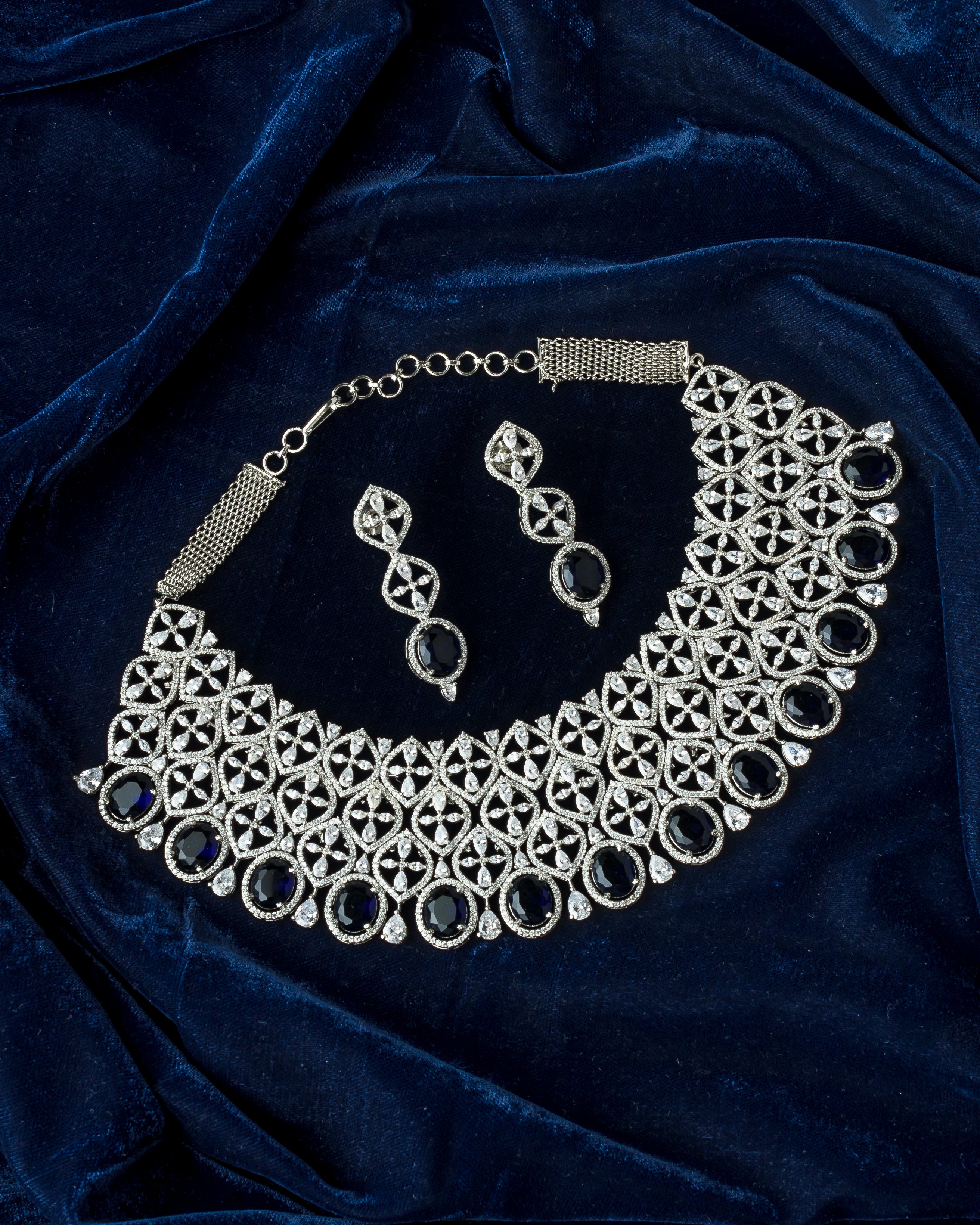 Elevate your elegance with this dazzling silver-toned necklace set, featuring intricate floral motifs, deep navy blue stones, and sparkling crystals. Includes matching earrings for a complete festive look.