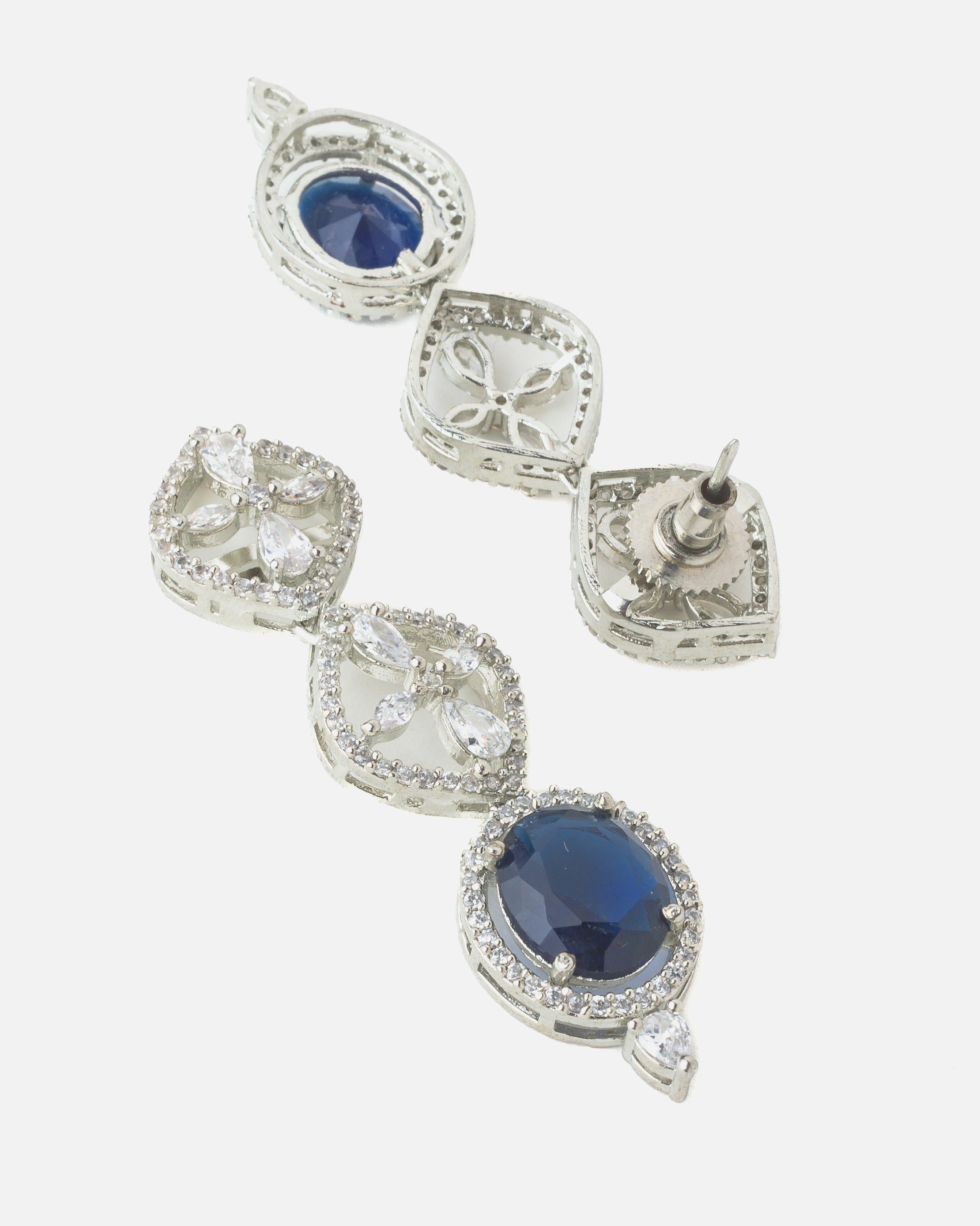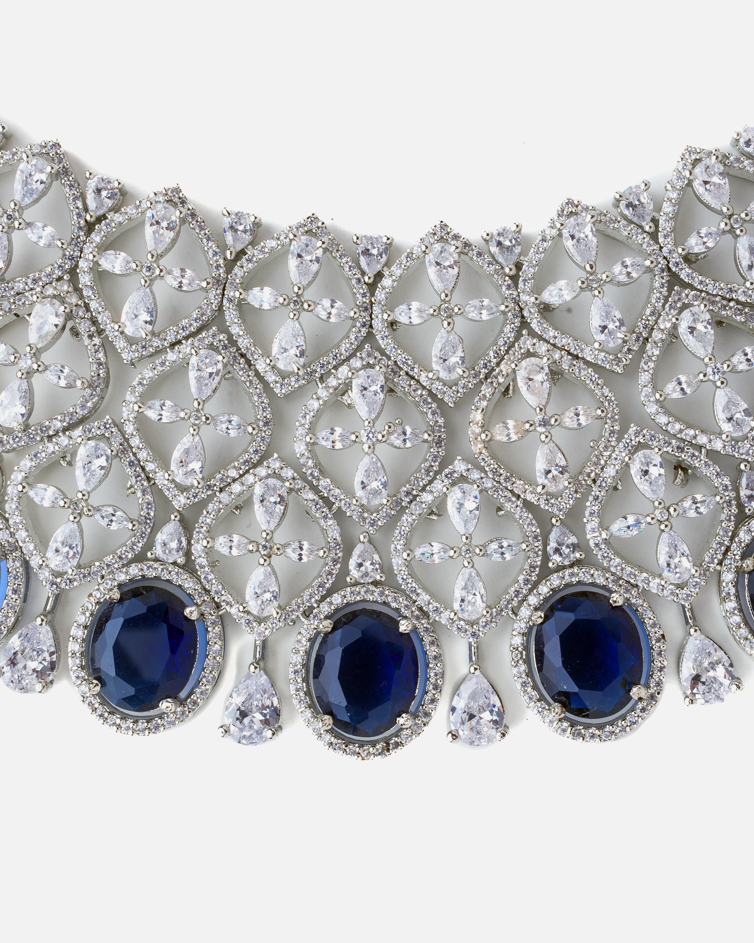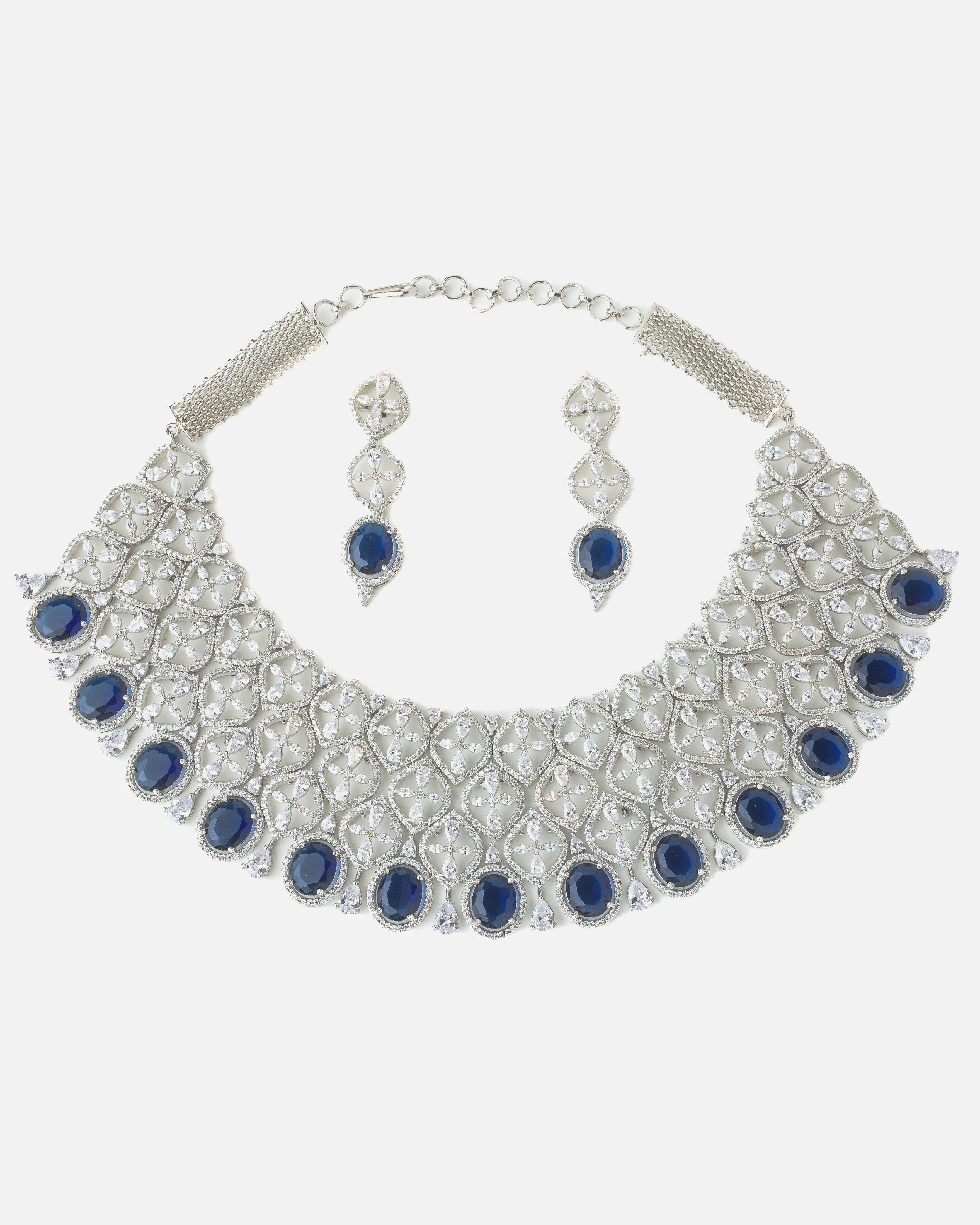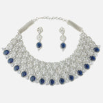 Silver Plated Blue Womens Zircon Choker Necklace Set with Pair of Earrings