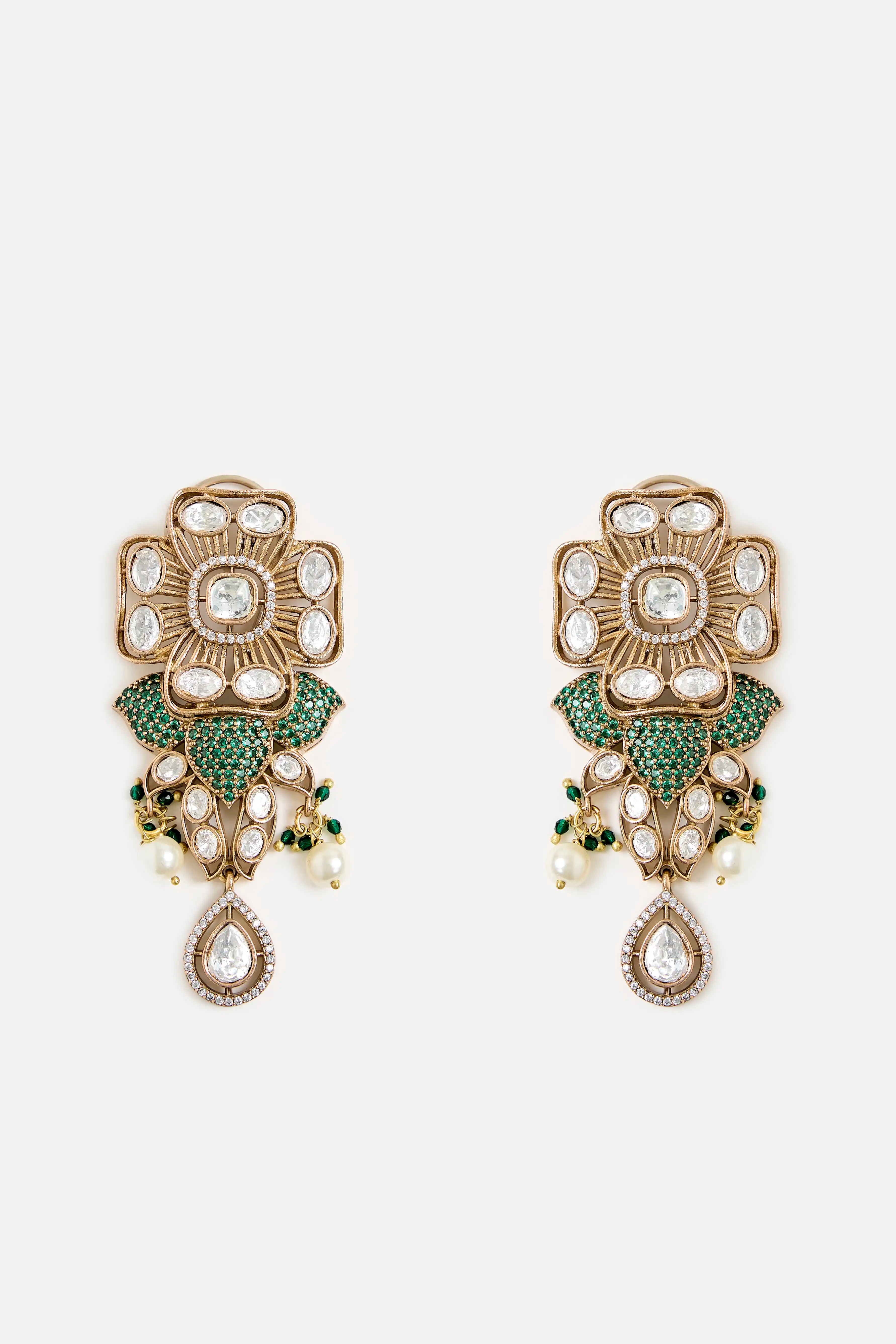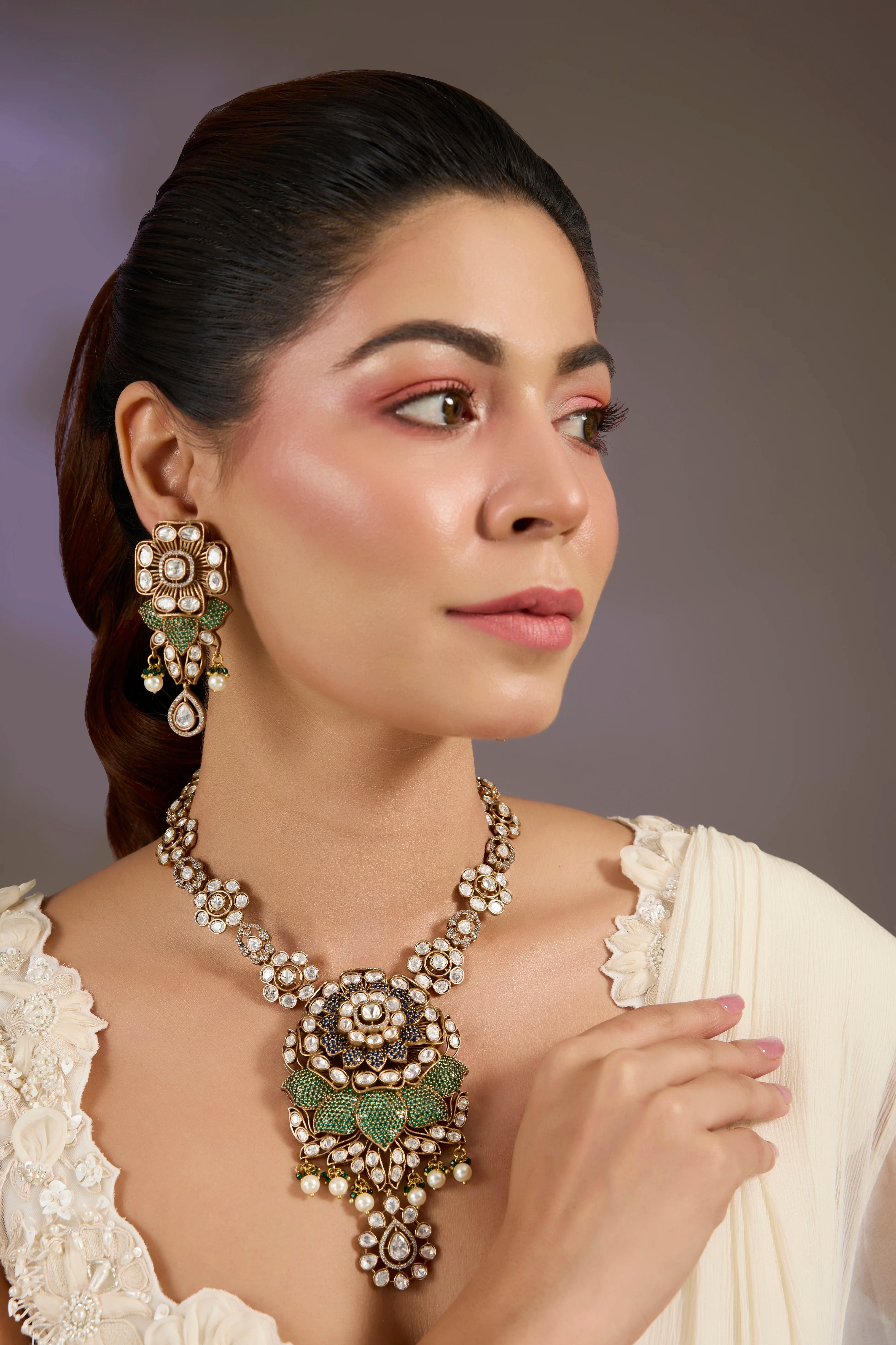 Stunning kundan & emerald statement necklace set with intricate floral motifs, pearl drops, and matching earrings. A regal piece, perfect for weddings, festive occasions, and traditional wear.