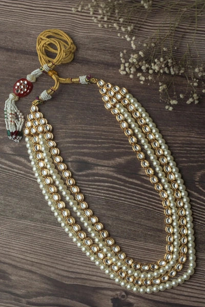 Elegant multi-layered pearl and kundan necklace featuring ivory pearls paired with gold-toned kundan stones. Adjustable thread closure makes it perfect for weddings, festive, or traditional occasions.