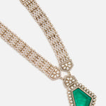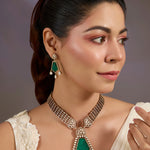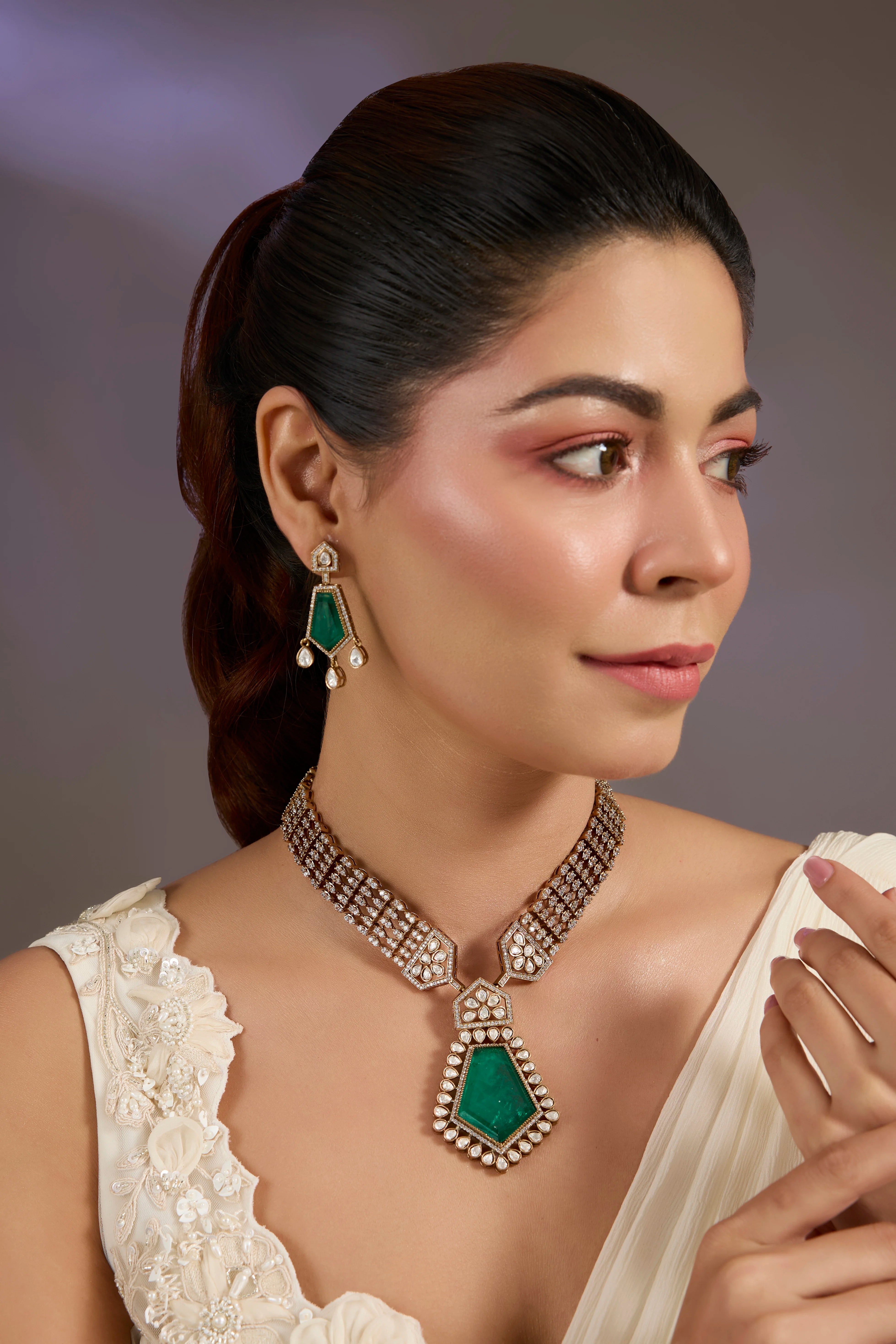 Elevate your look with this Emerald Drop Kundan Necklace Set, crafted with uncut kundan stones, pearl drops, and a striking emerald pendant. Perfect for weddings, festive, and regal occasions.