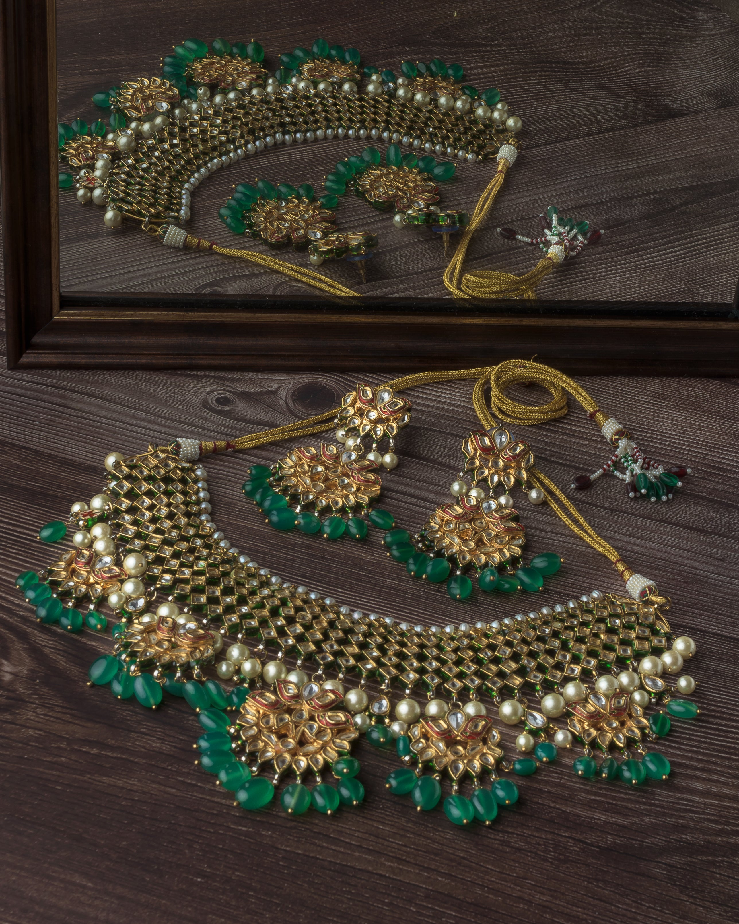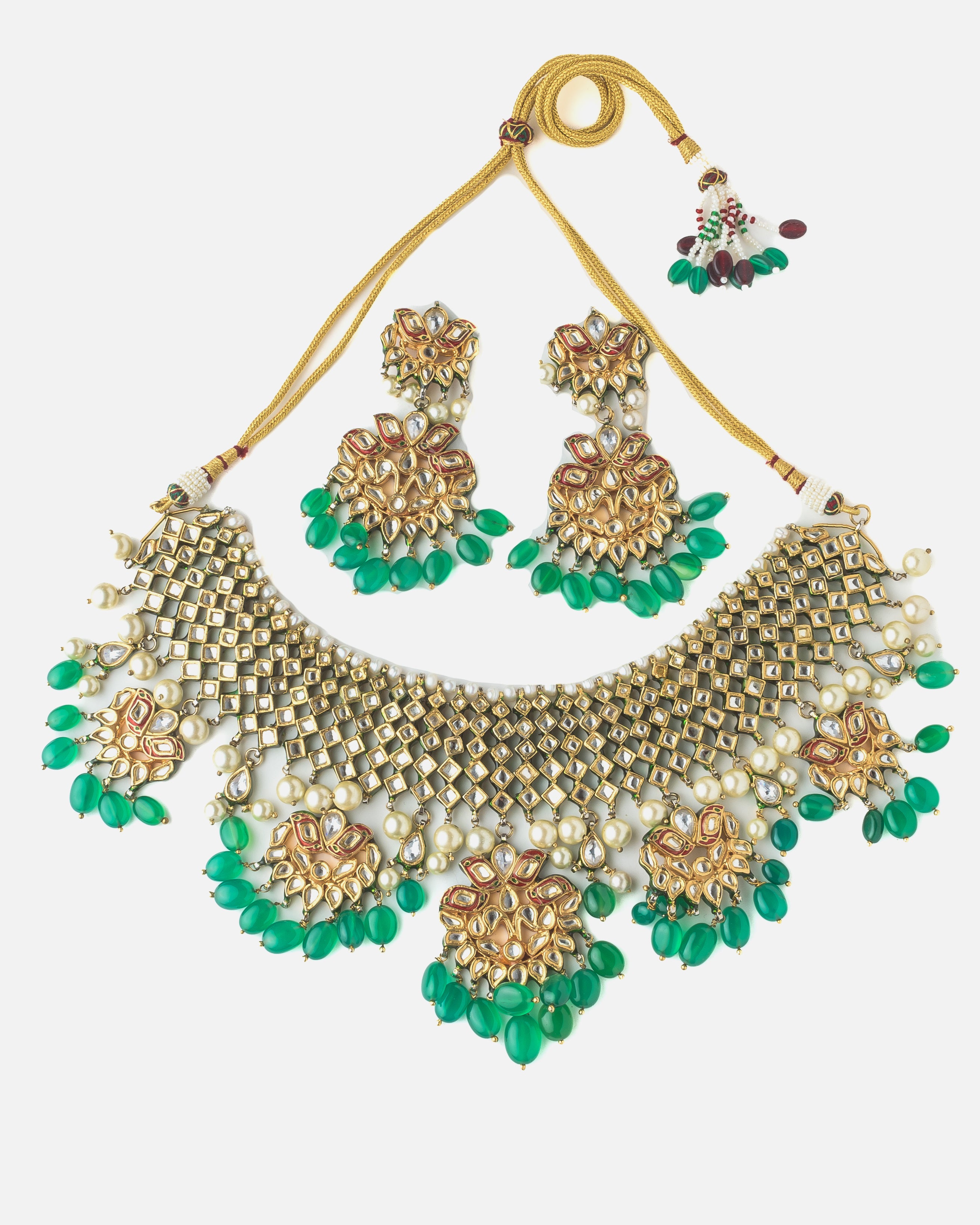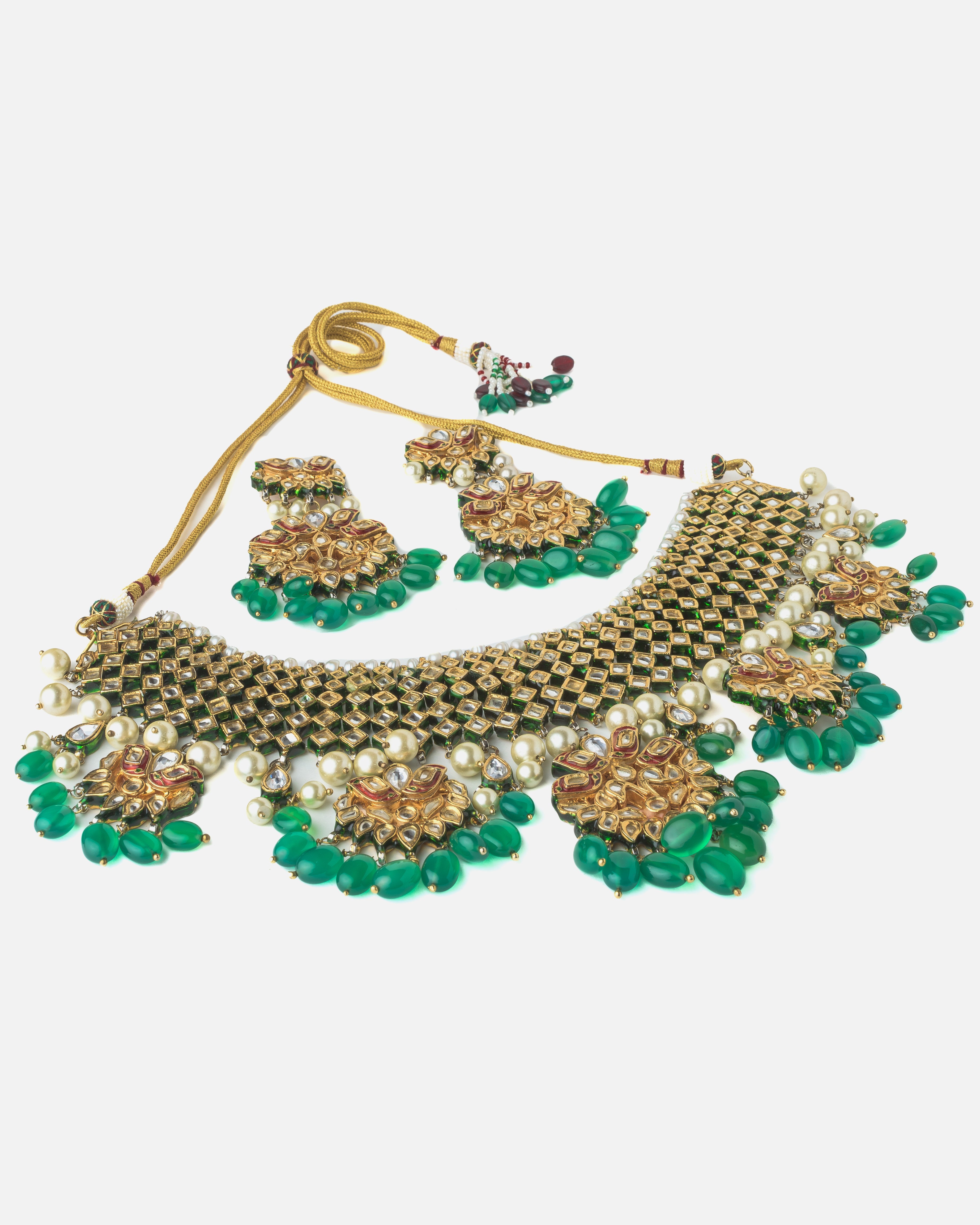 • Design: Features an intricate mesh choker-style necklace with rich green beads, classic Kundan stones, and traditional floral motifs.