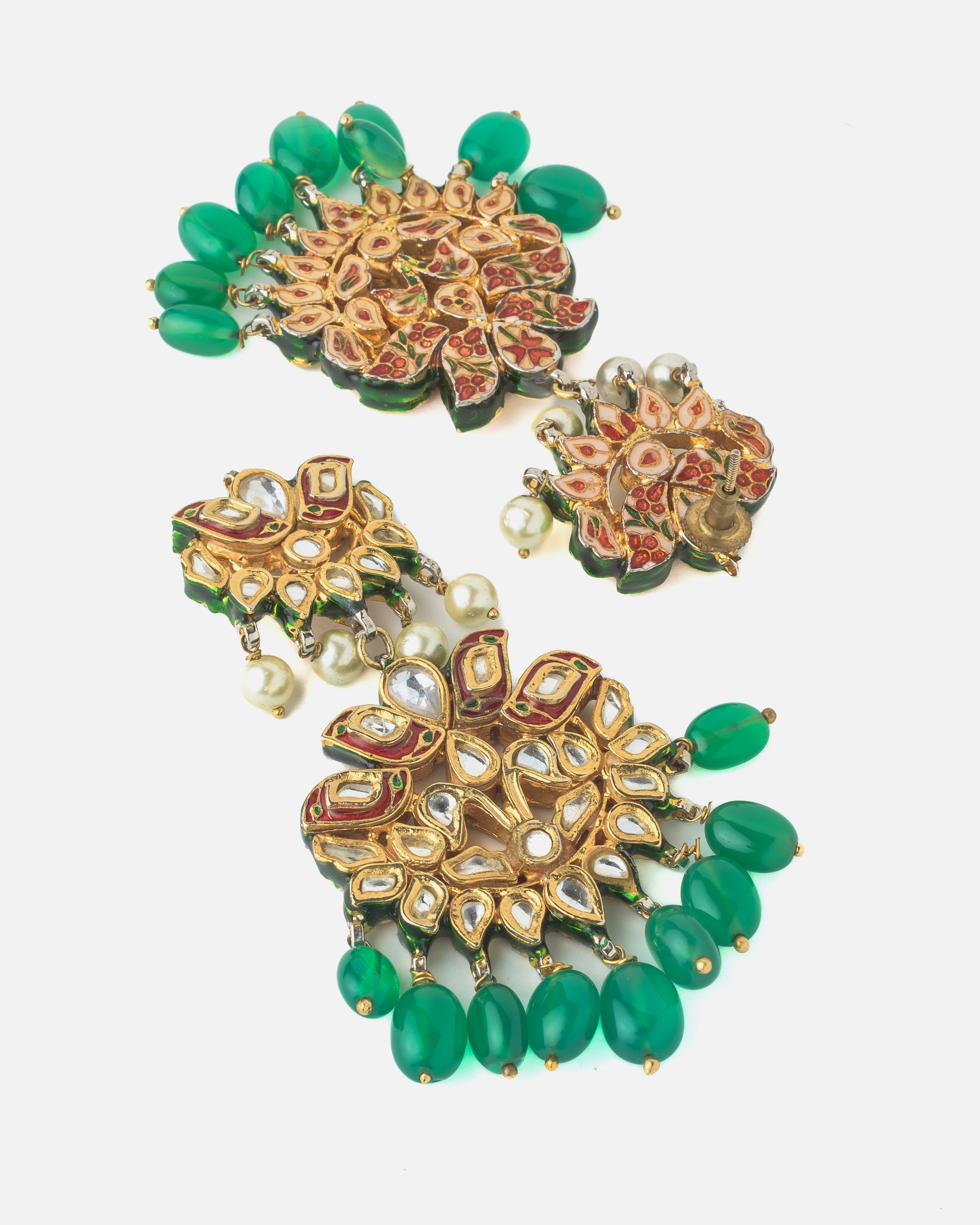 • Materials: Made with high-quality Kundan, lustrous pearls, and green beads, set in a golden metal base.