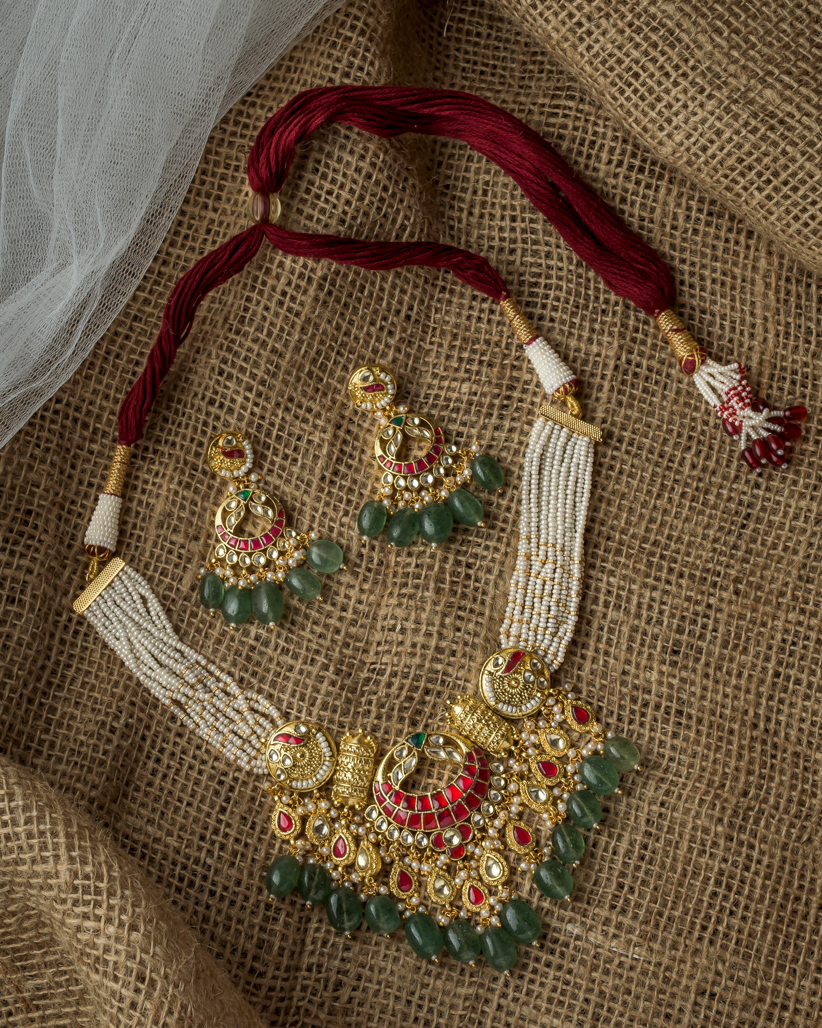 Stunning Kundan necklace set with pearl strands, green and red gemstones, and intricate gold-tone detailing. Paired with matching earrings, perfect for weddings and festive occasions.