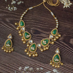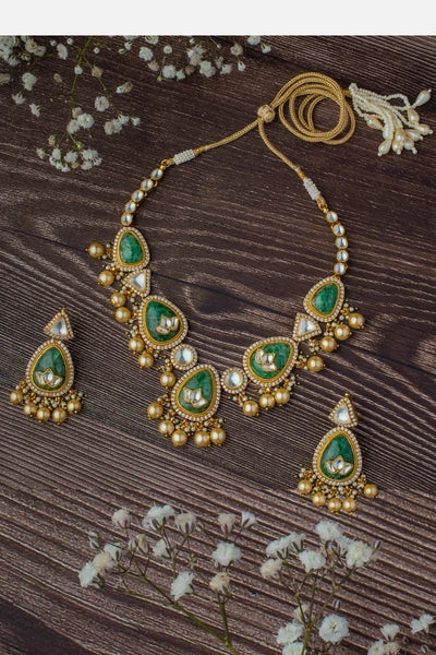 These elegant gold-tone necklaces feature intricate green stone detailing with lotus motifs, pearl embellishments, and a traditional design, perfect for weddings and festive occasions.
