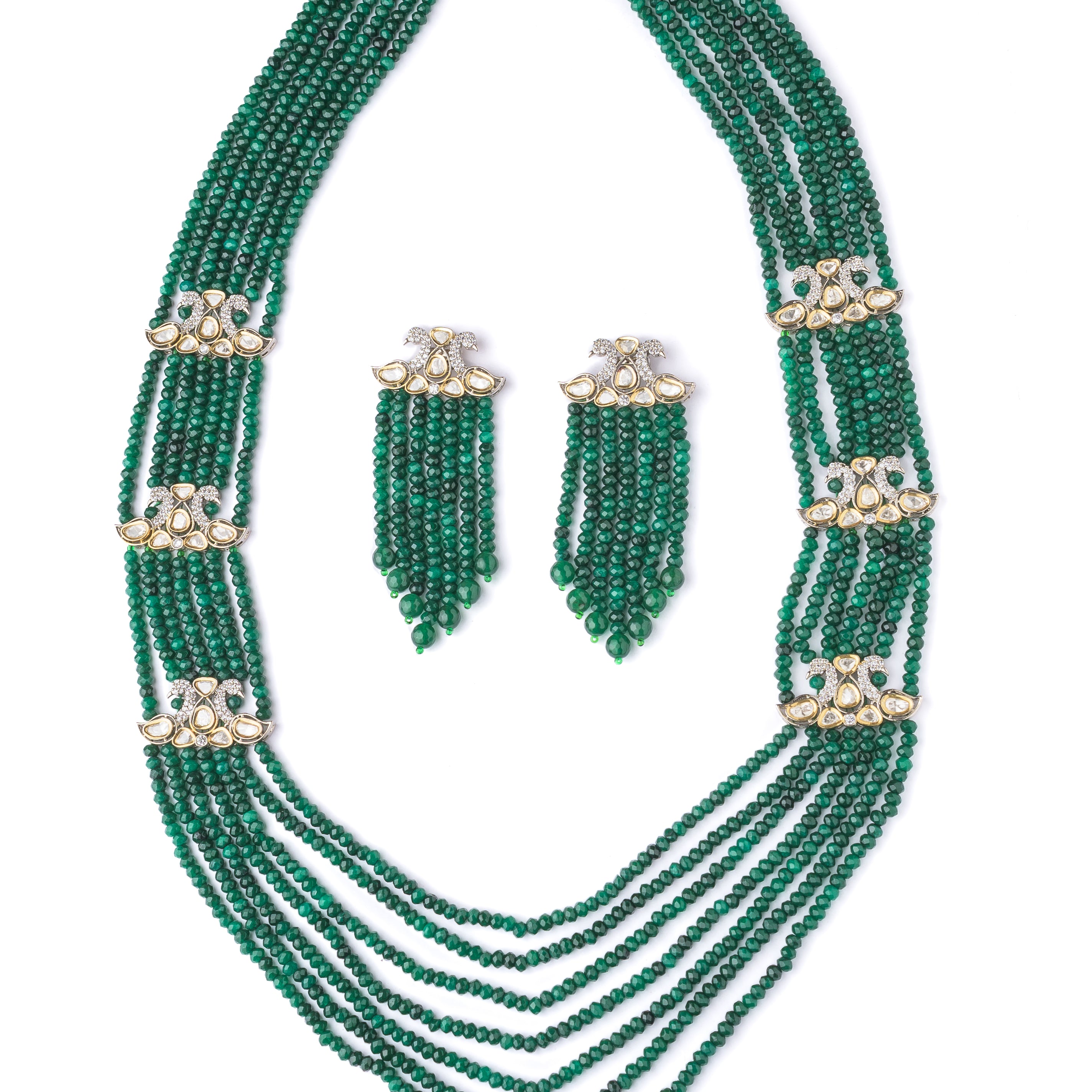 Gold Plated Green Womens Long Necklace Set with Pair of Earrings