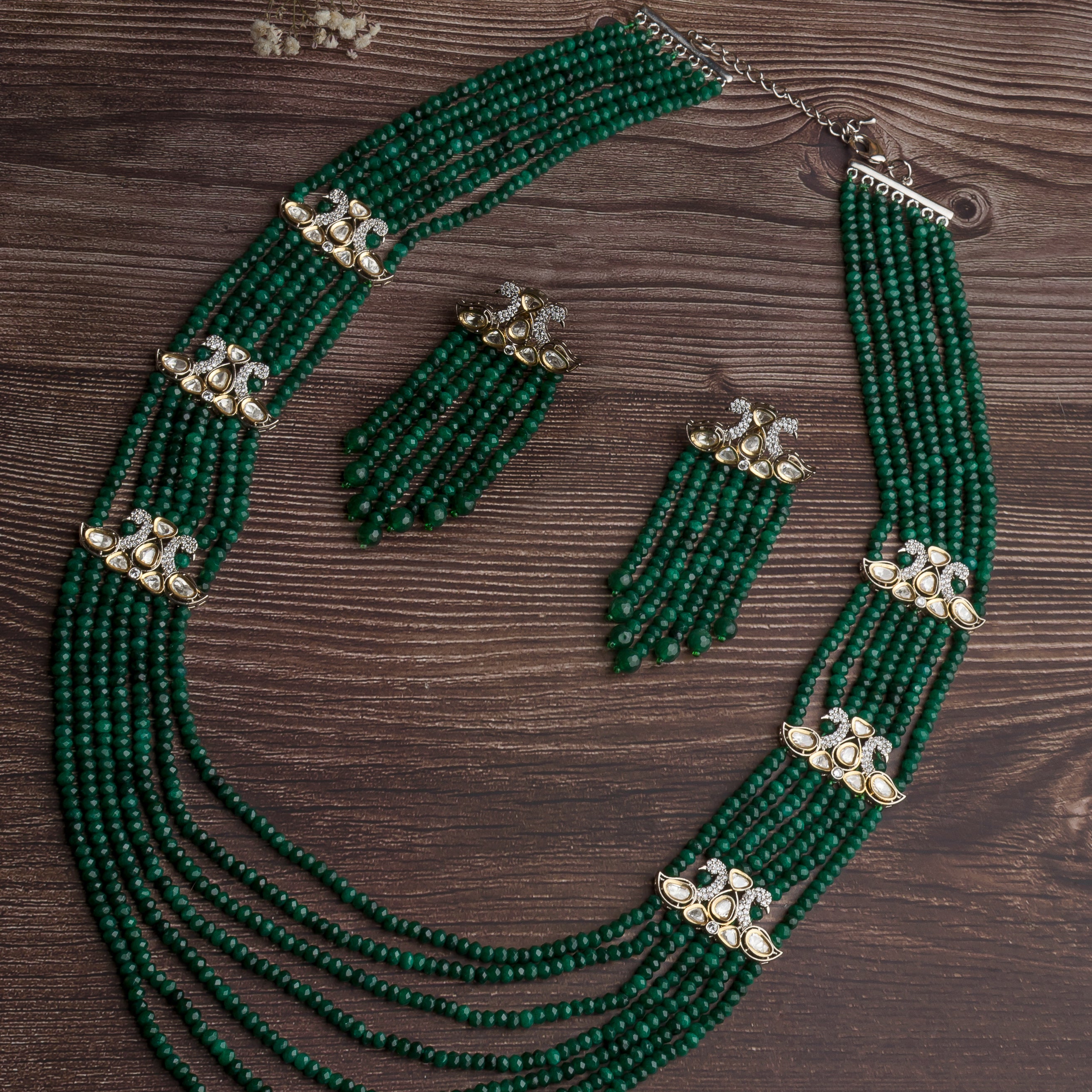 Zia Silver Plated Green Womens Zircon Long Necklace Set with Pair of Earrings (Freesize)