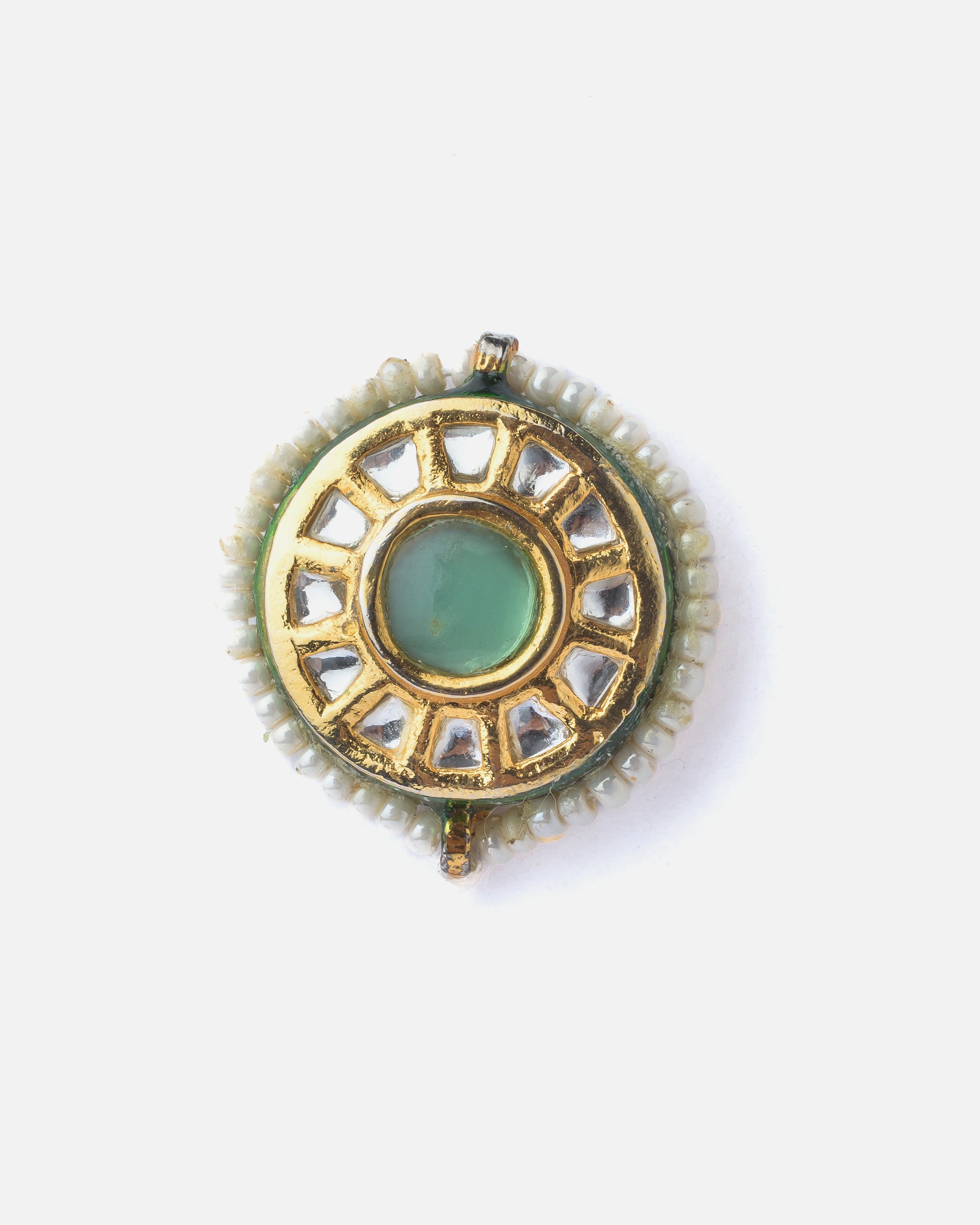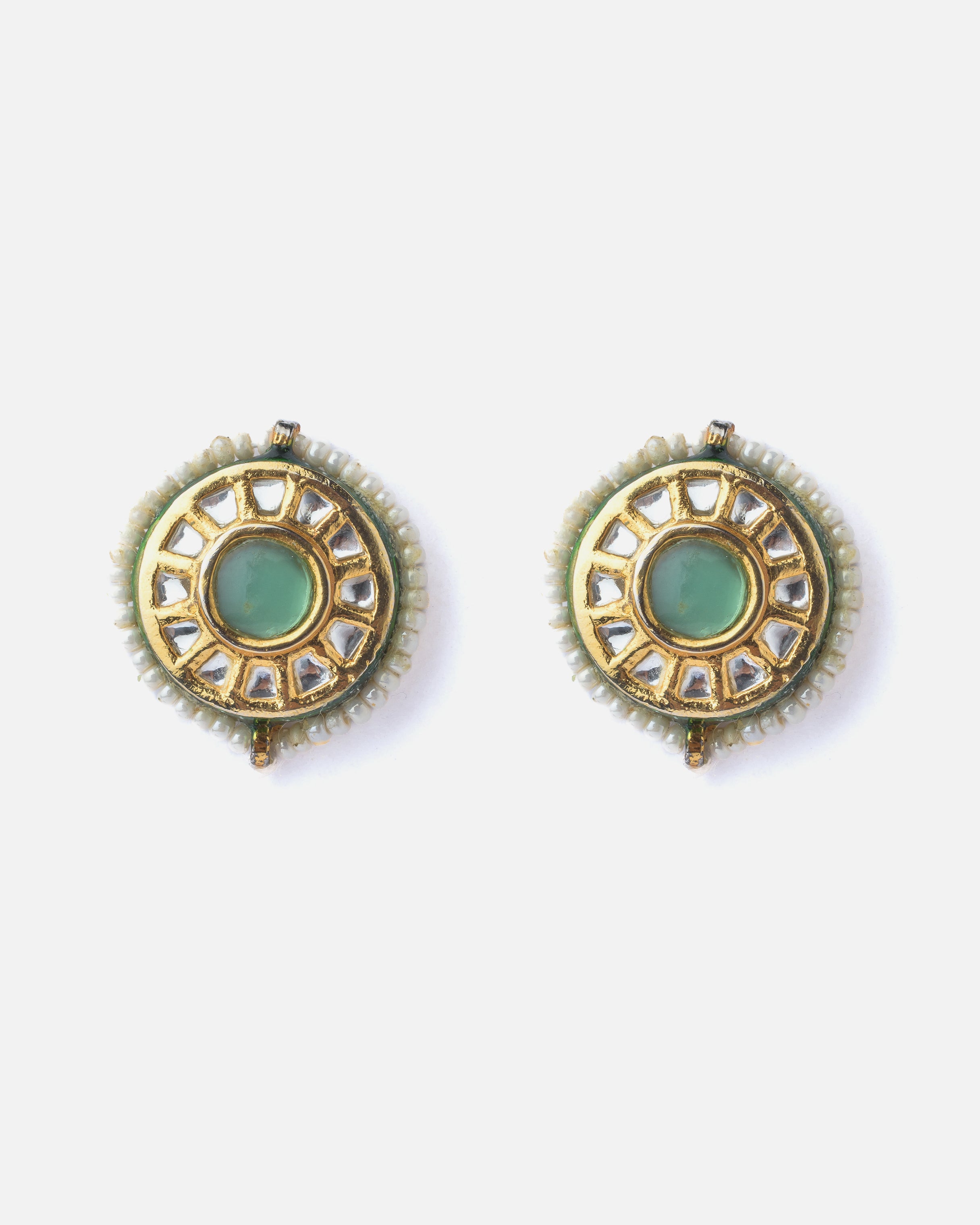 Elegant round stud earrings featuring a central green stone, surrounded by sparkling white stones and a gold-toned frame with pearl detailing. Perfect for adding a traditional touch to any outfit.
