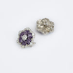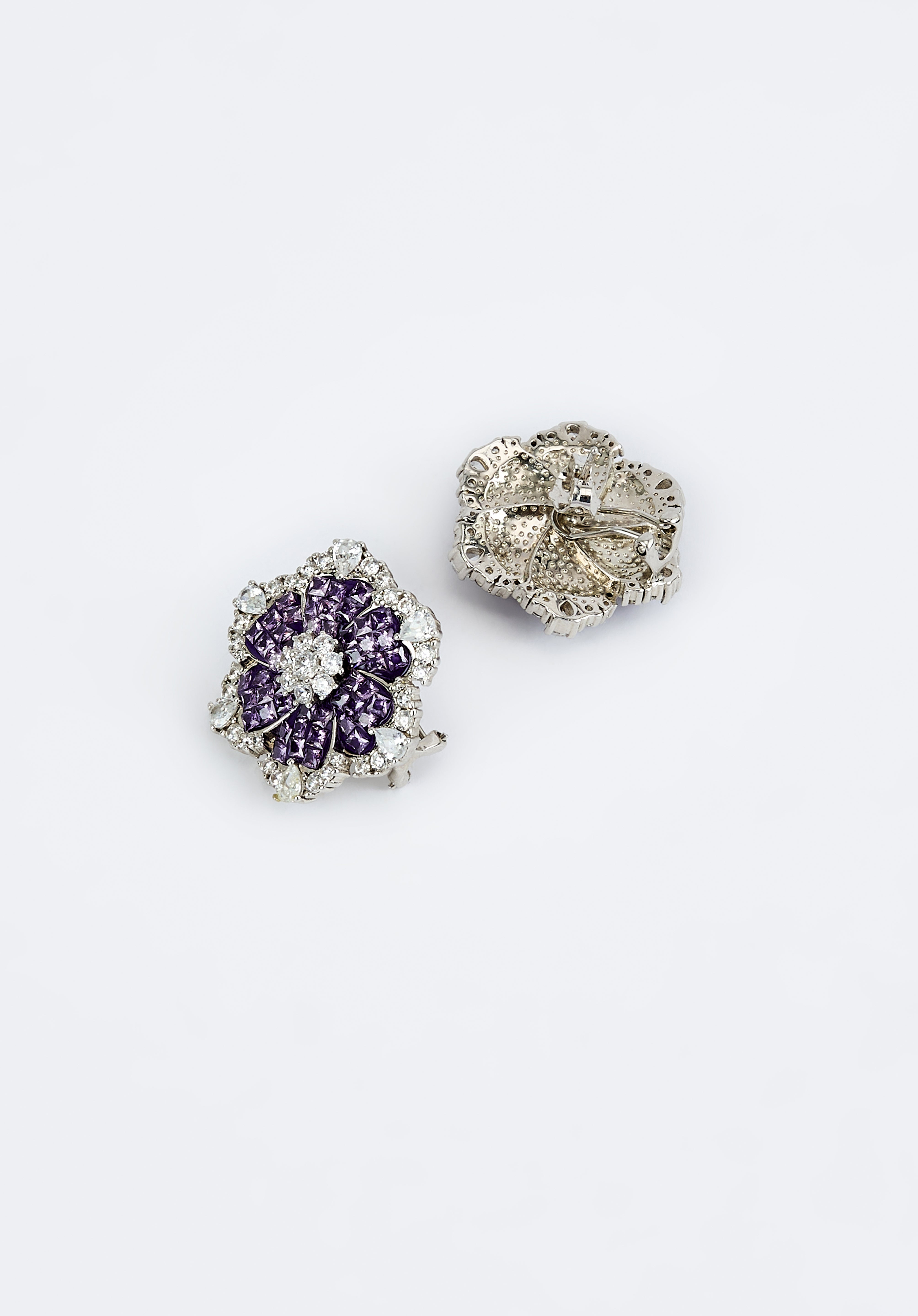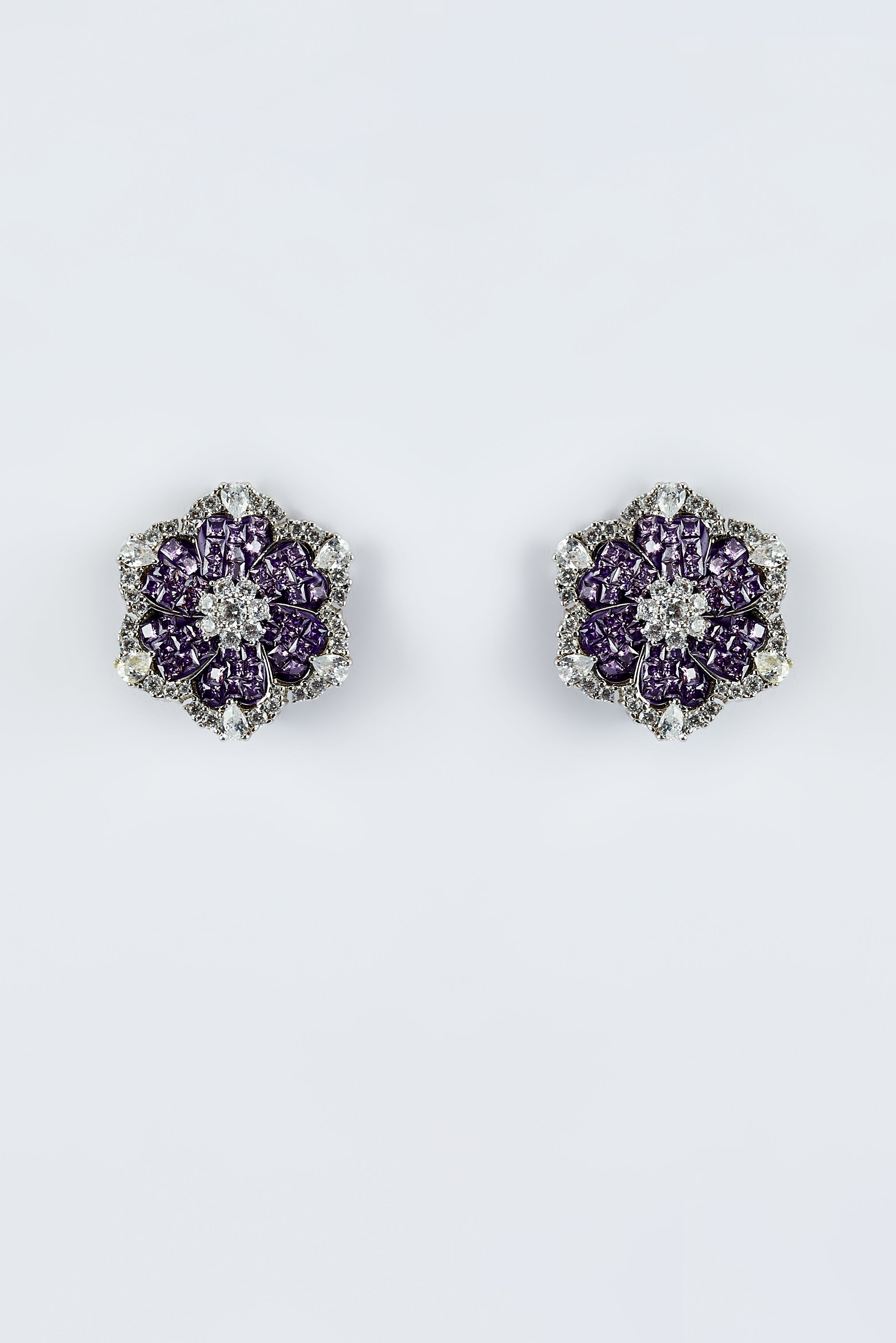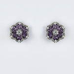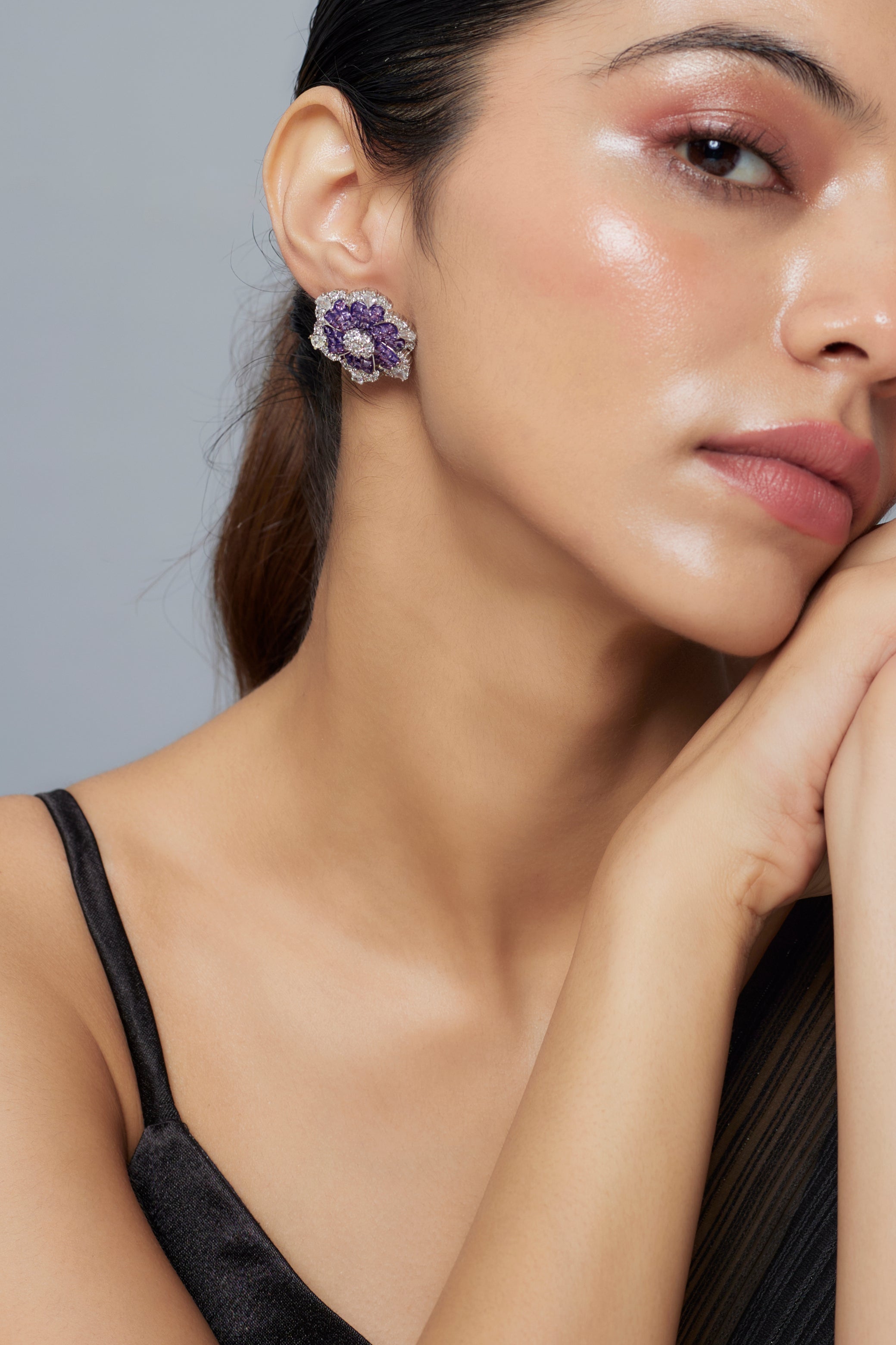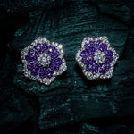 Adorn yourself with these stunning statement earrings, designed with intricate floral detailing and sparkling violet stones. Perfect for elevating any outfit with elegance and sophistication.