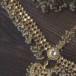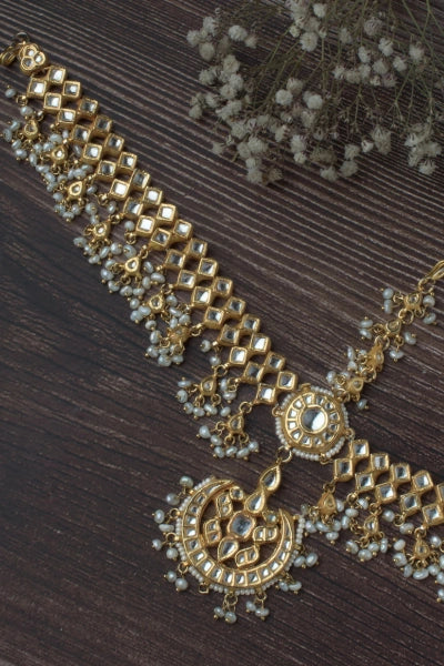 This traditional mangtika and mathapatti set features intricate gold-toned lattice work with pearl and stone embellishments, offering a regal and elegant touch for weddings and festive occasions.