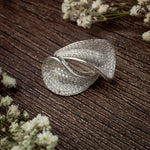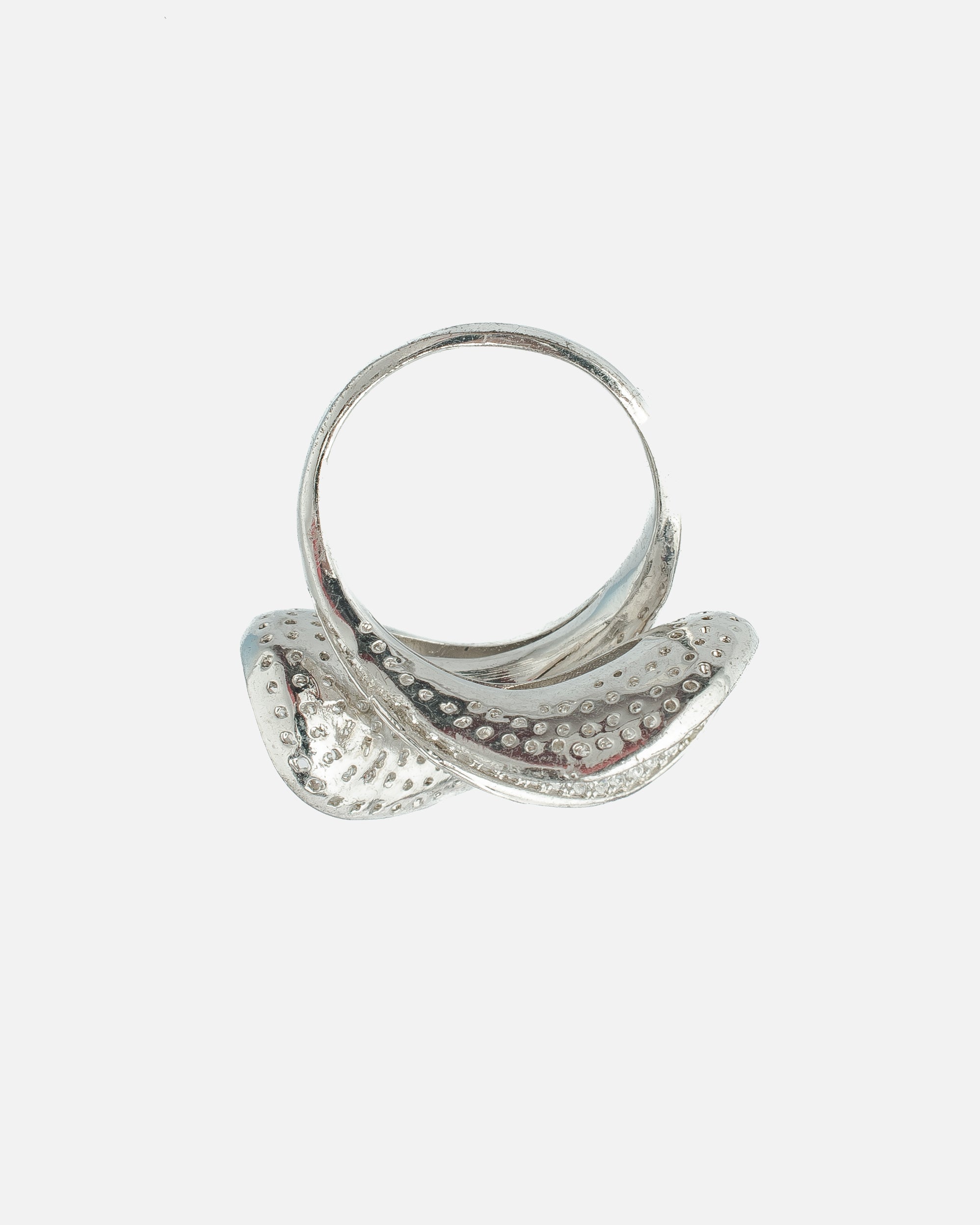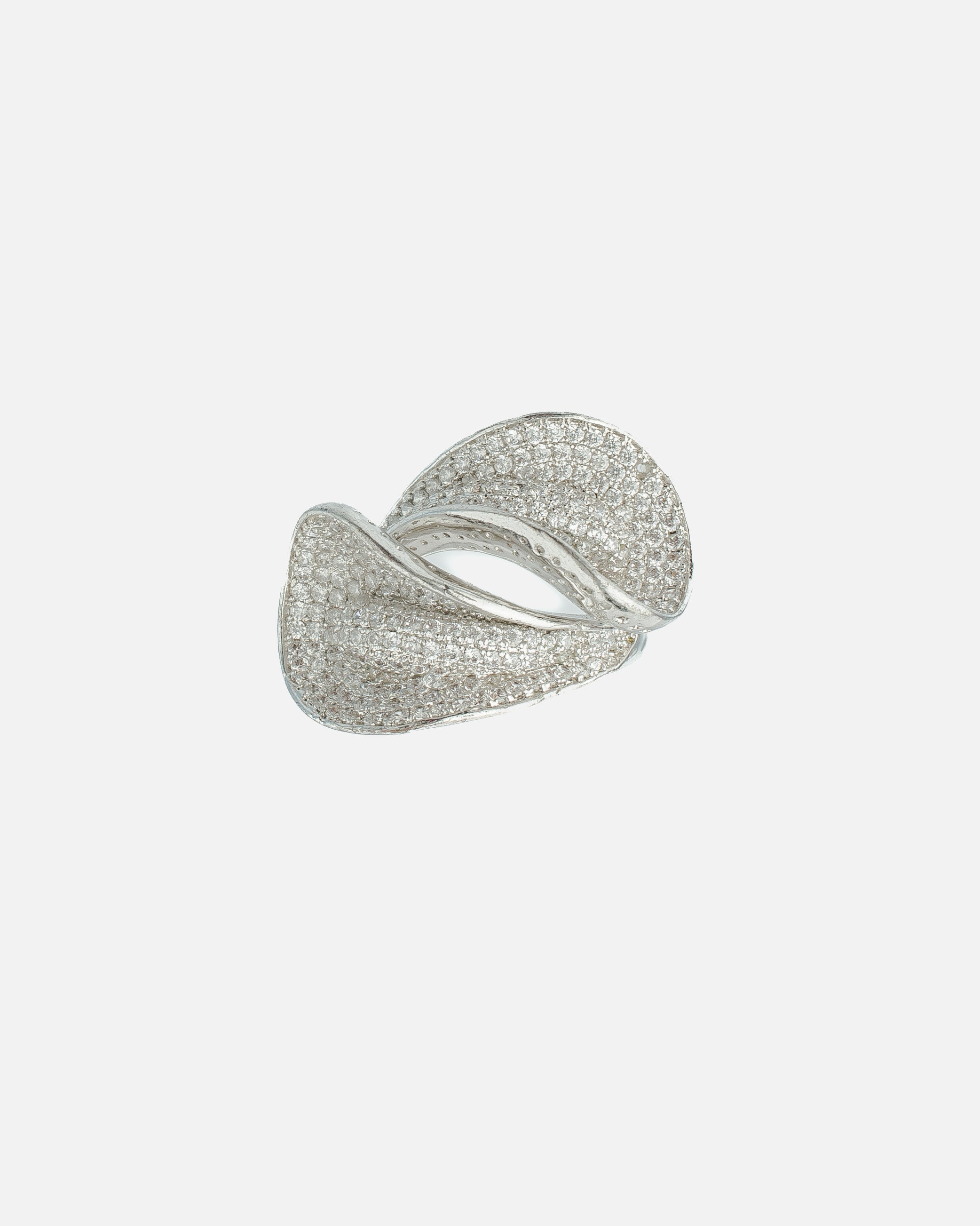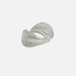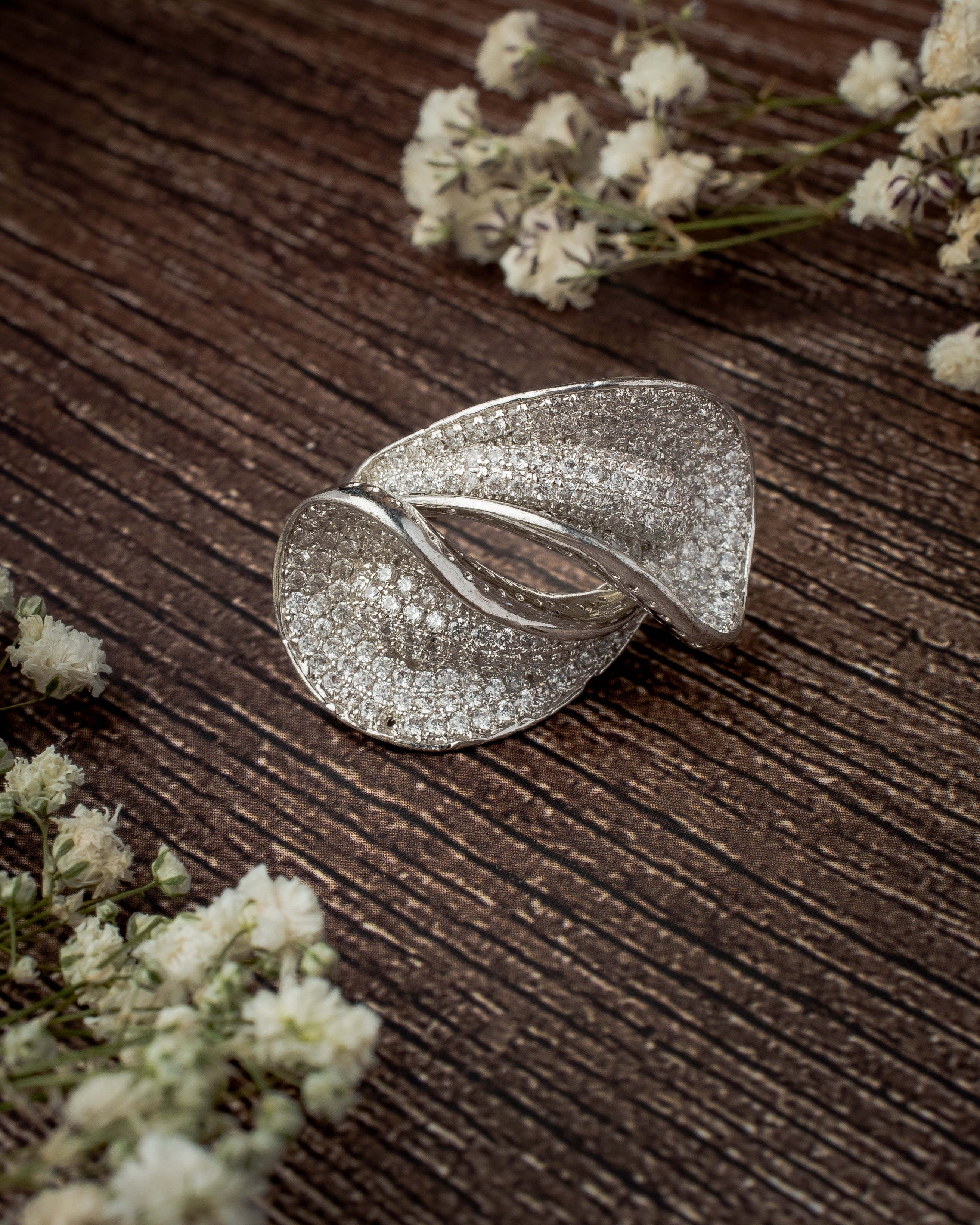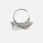 This stunning silver-tone ring features a unique wave-inspired design adorned with shimmering stones for an exquisite sparkle. Perfect for adding elegance to any outfit, it makes statement piece.
