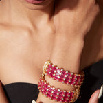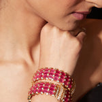 Elegant ruby-red and gold bangles embellished with dazzling white stones. A perfect blend of tradition and luxury, these intricately crafted bracelets add charm and sophistication to any festive or formal look.