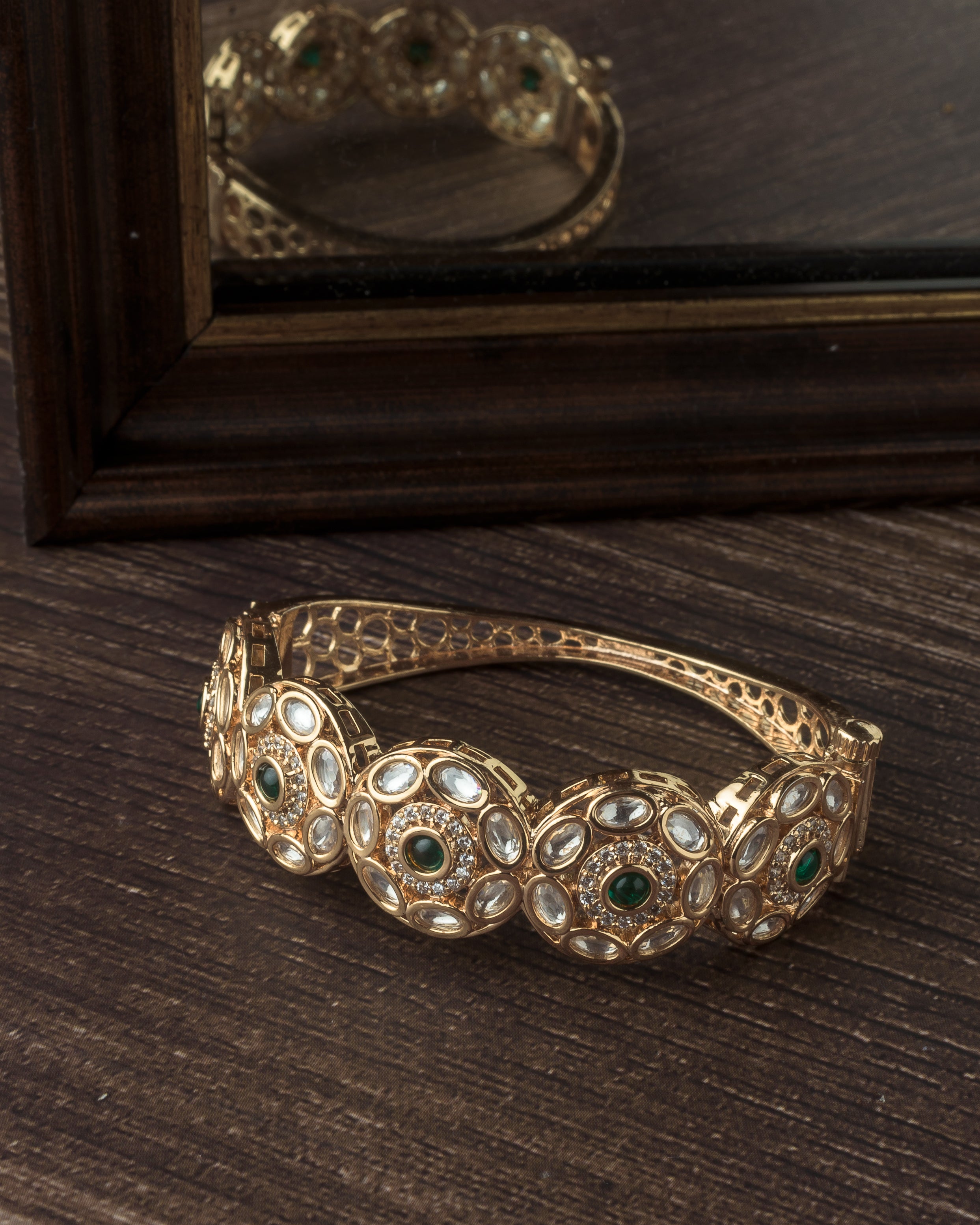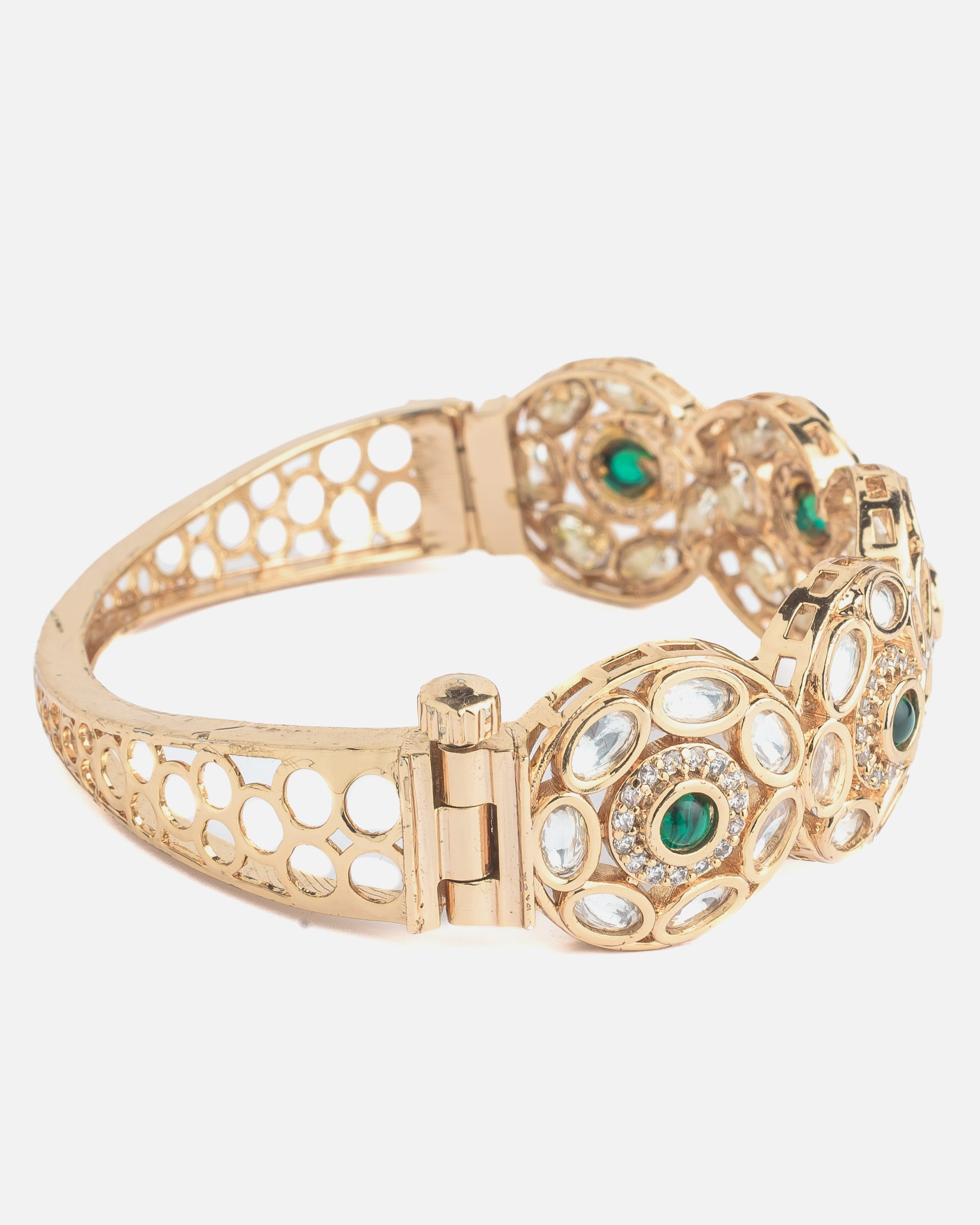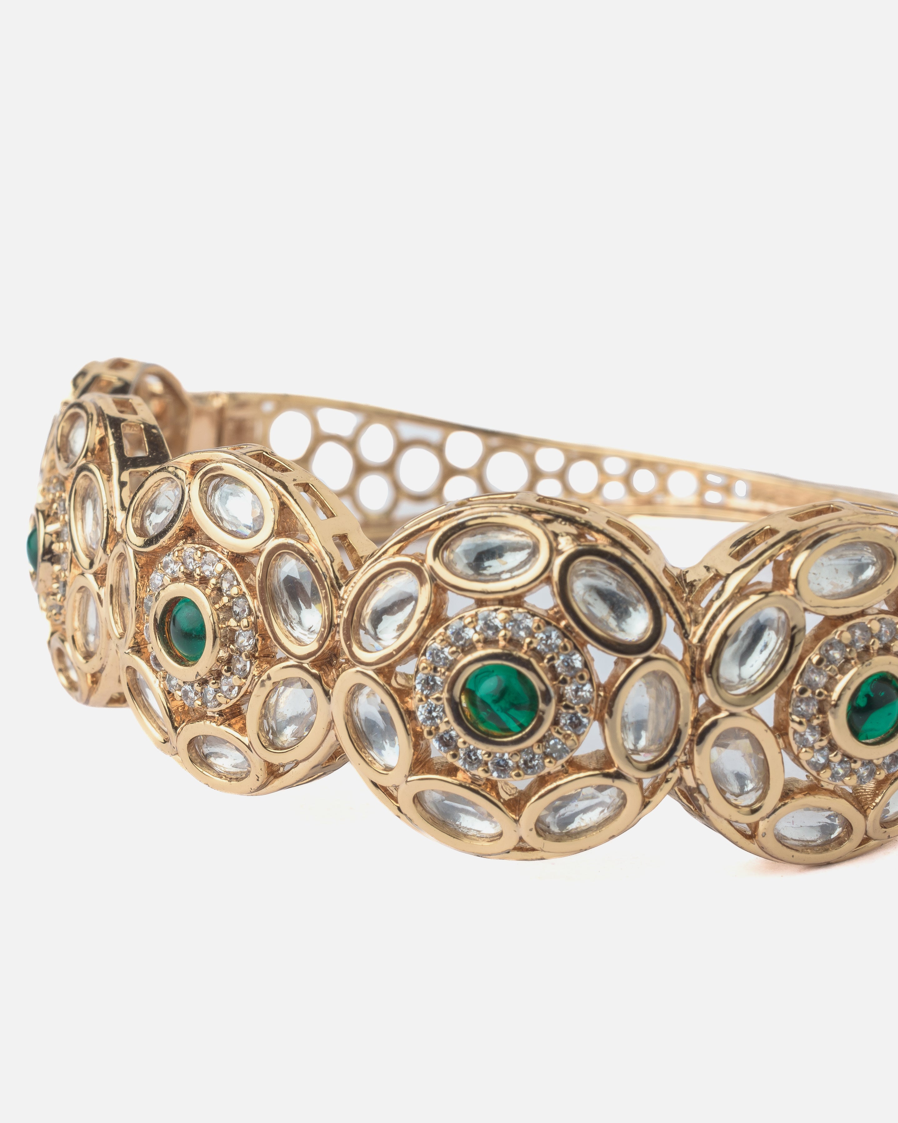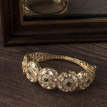 Regal gold-toned bangle featuring intricate circular motifs, embellished with clear kundan-style stones and vibrant green center gems. A luxurious accessory perfect for weddings and traditional events.