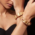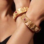 Elegant gold bangles with intricate detailing and embedded gemstones, offering a perfect blend of tradition and luxury. A stunning accessory for weddings, festivals, and special occasions, adding timeless charm.