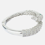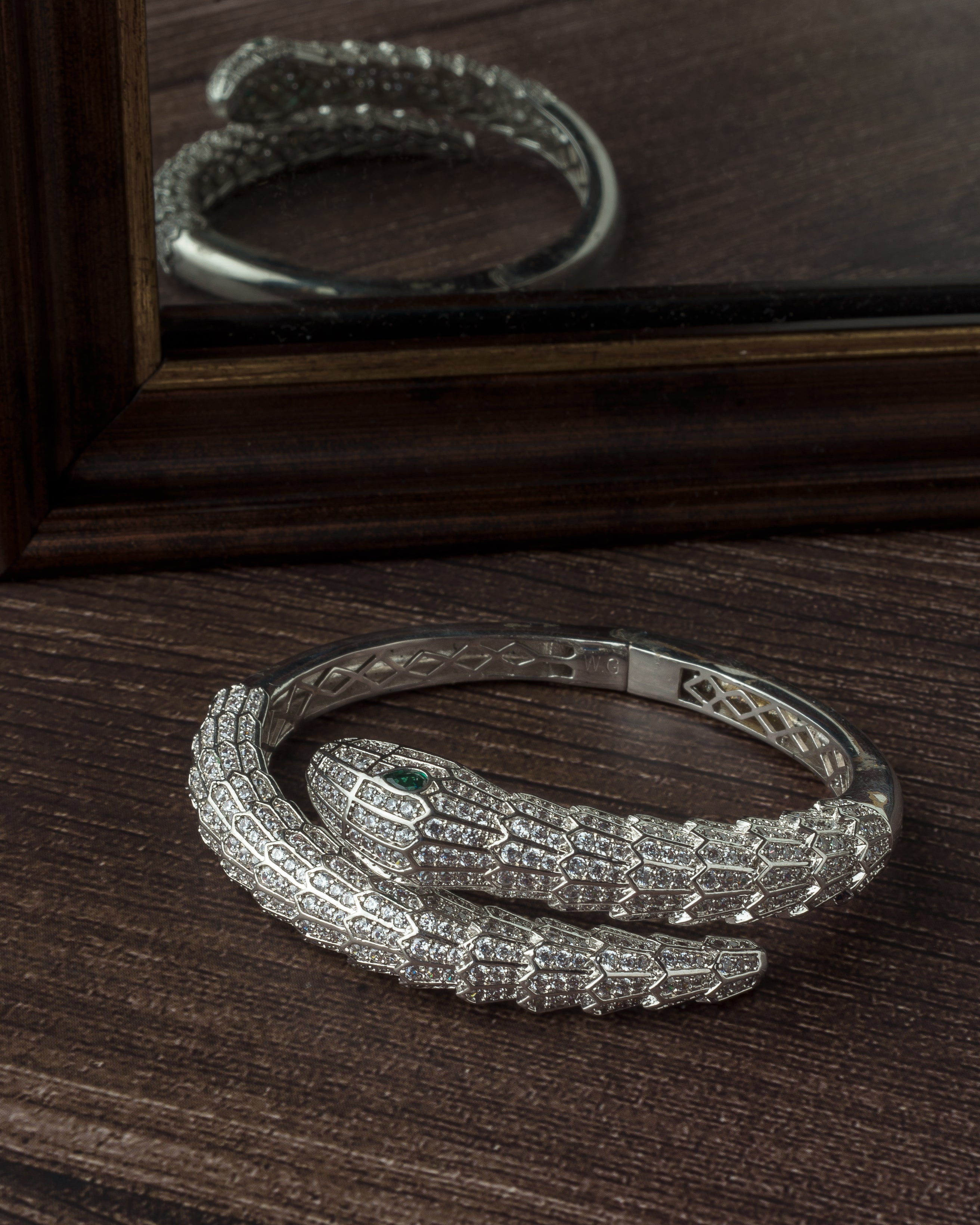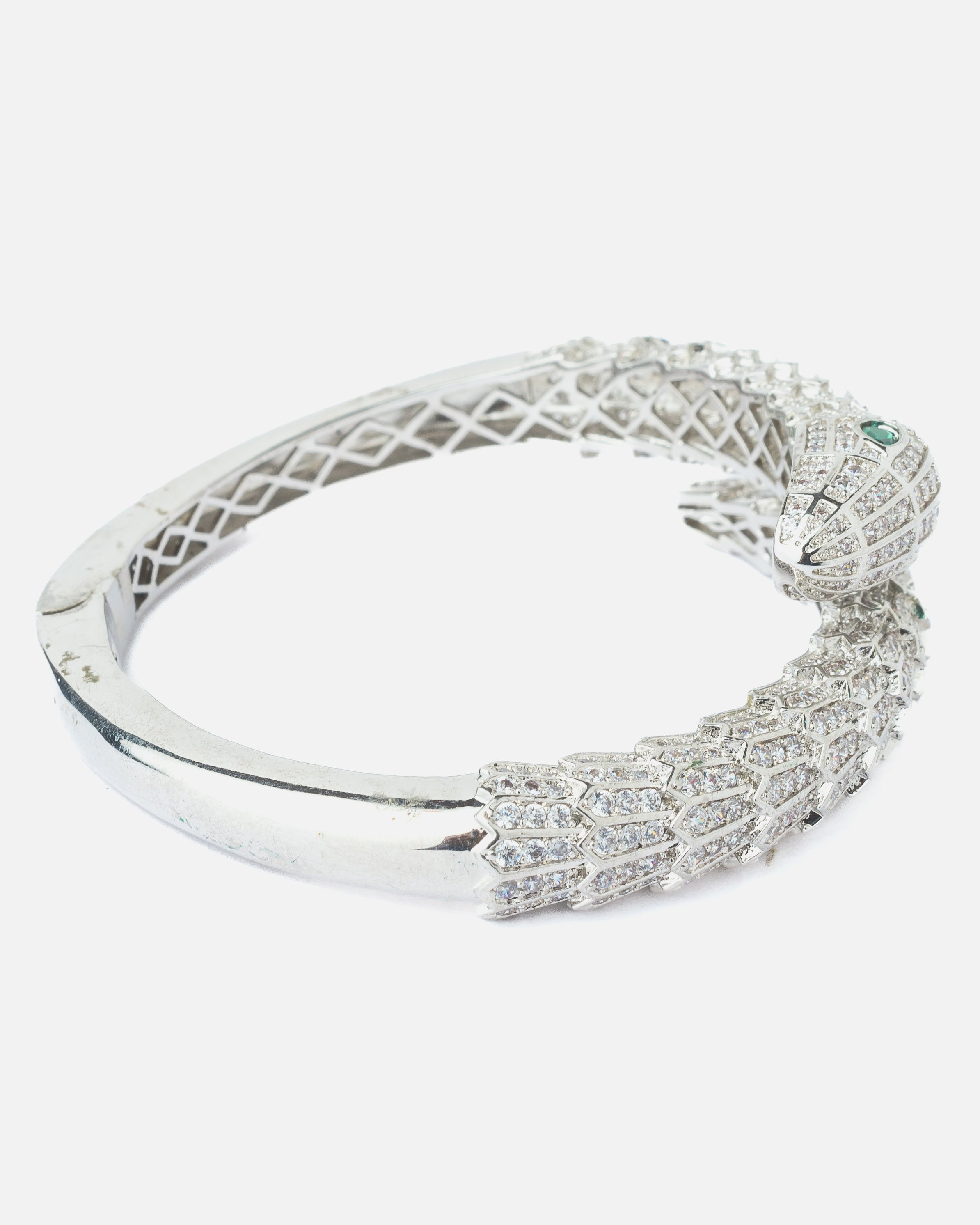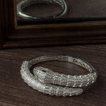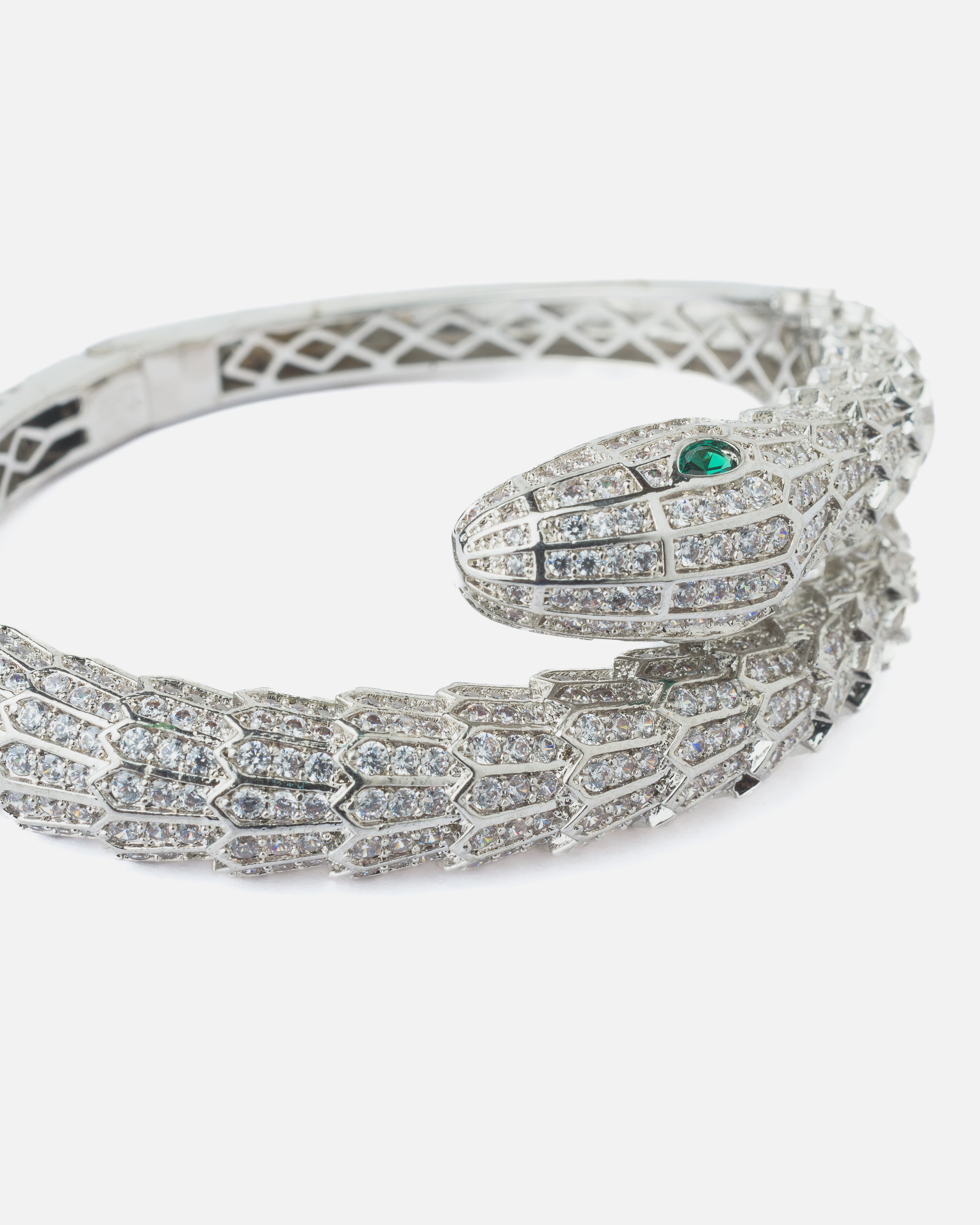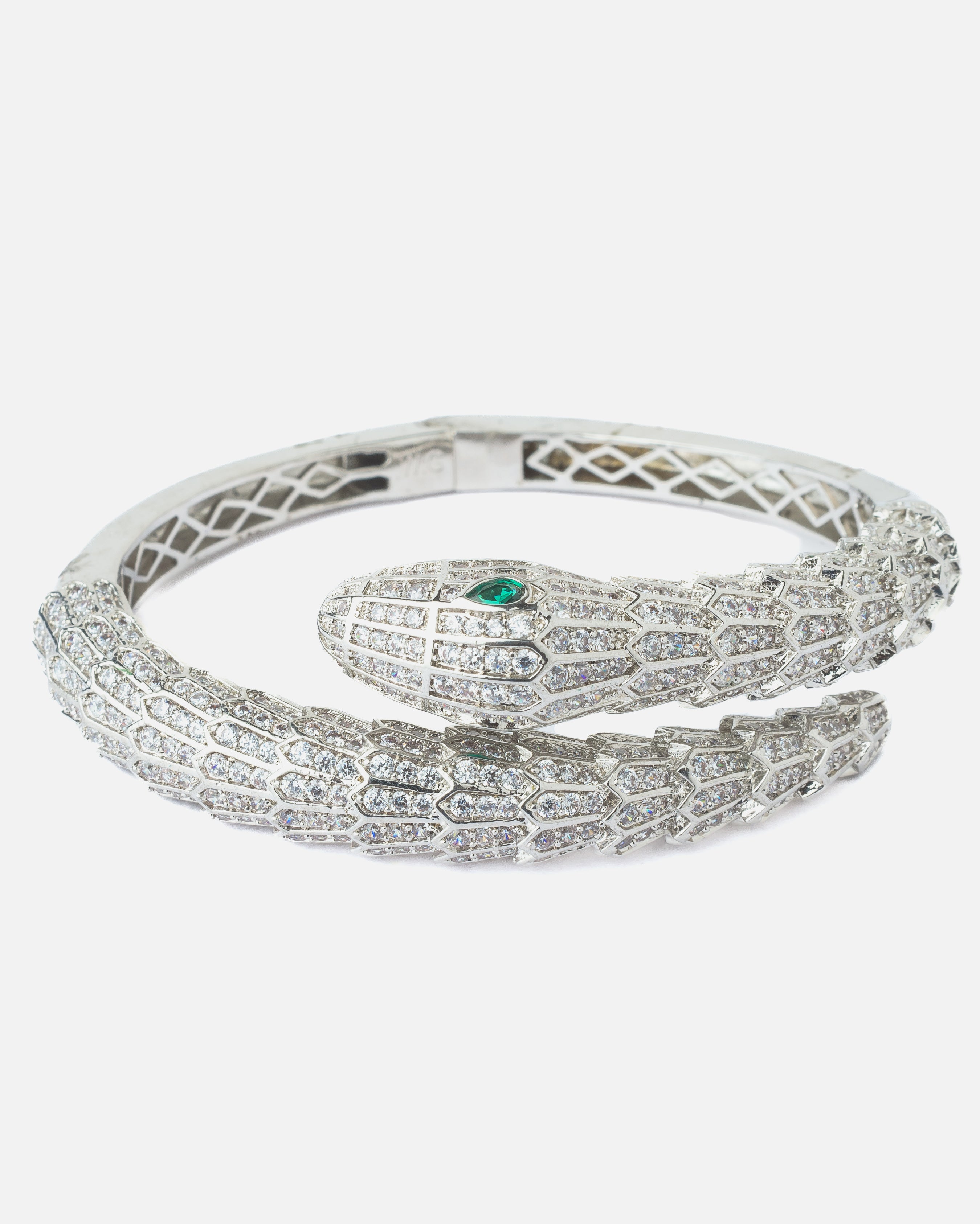 Striking snake-design bangle crafted in silver-tone metal with detailed scale texture and sparkling stones. Features green gemstone eyes for a bold, luxurious look—perfect for statement styling.