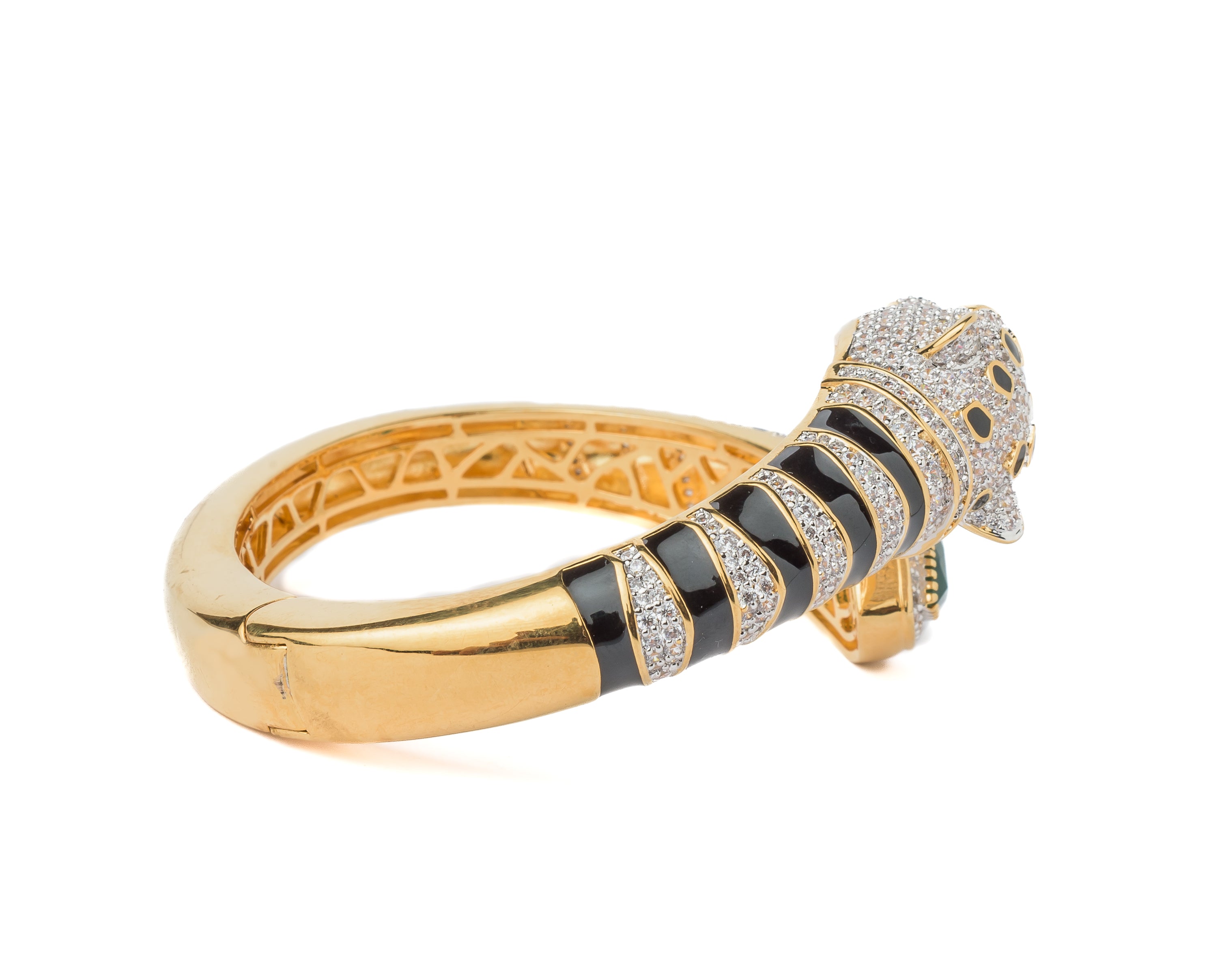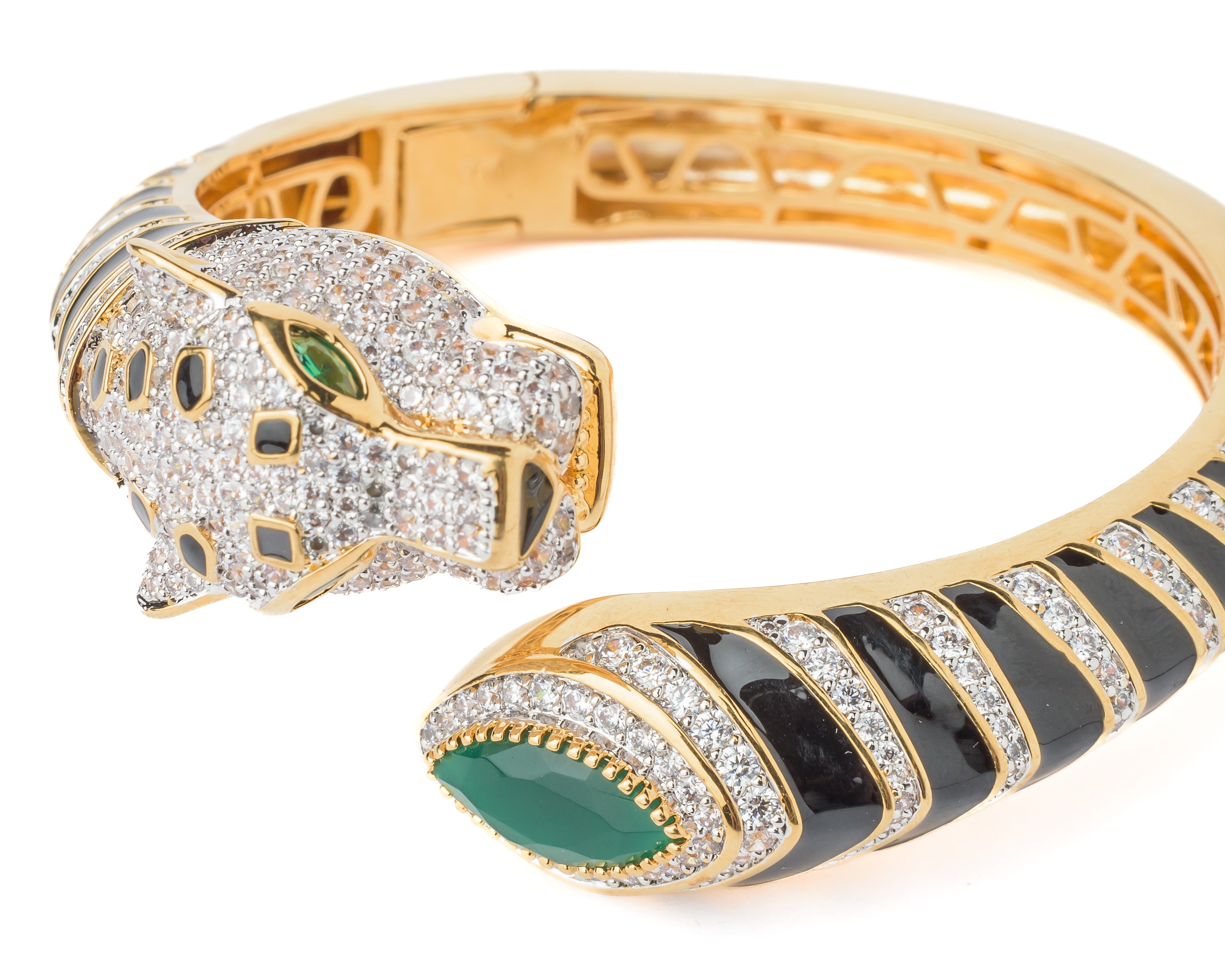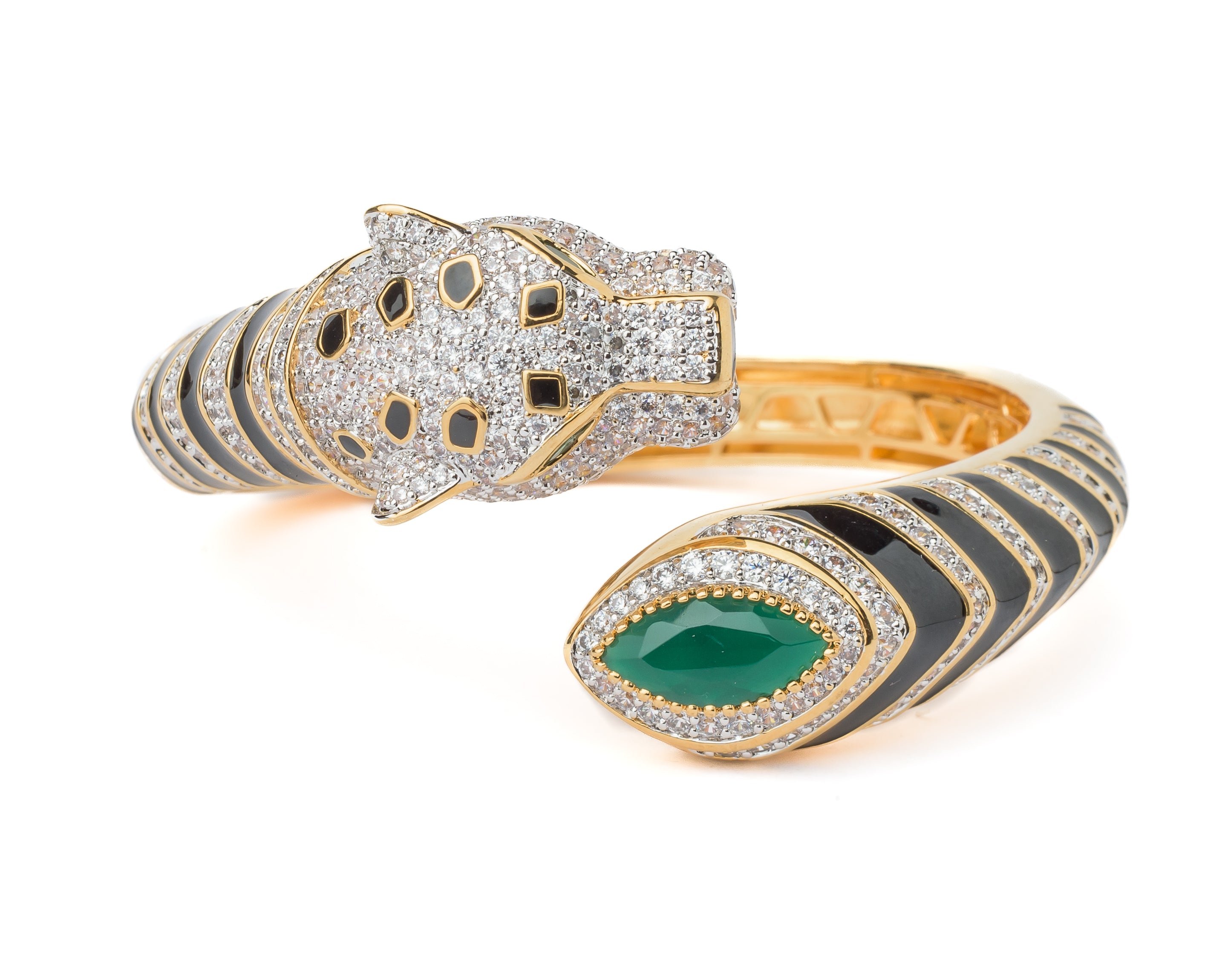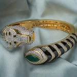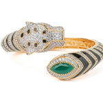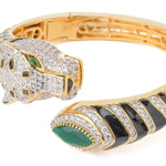A bold panther-inspired openable cuff bangle featuring sparkling white stones, black enamel detailing, and a striking green gemstone accent. A statement piece that exudes luxury and elegance for any occasion.