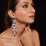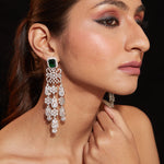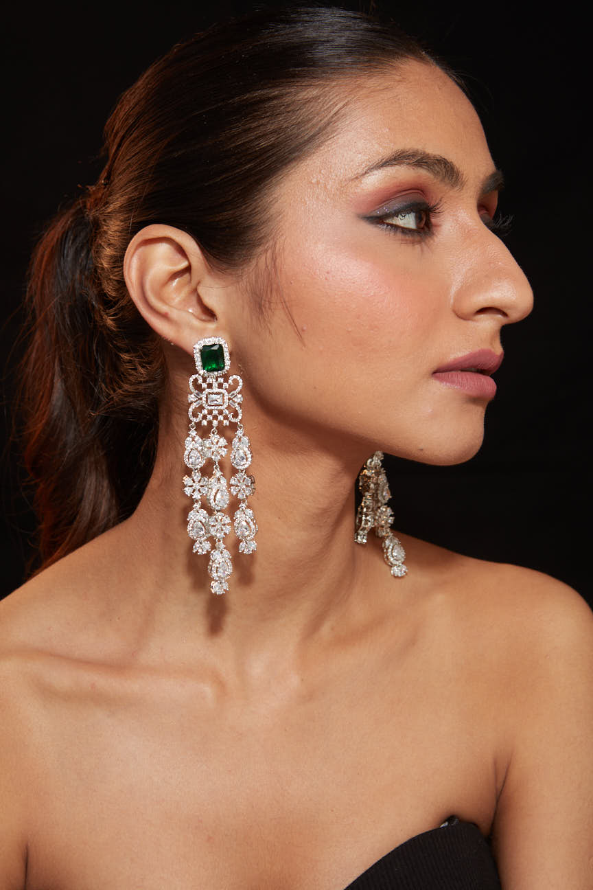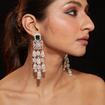 Elevate your elegance with these stunning statement earrings. Adorned with emerald green stones and cascading crystals, they exude timeless sophistication, perfect for special occasions or formal events.
