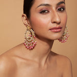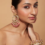 Elegant gold-plated earrings with intricate designs, adorned with pink beads and sparkling embellishments. Perfect for weddings and festive occasions, combining traditional charm with contemporary elegance.