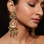 Exquisite handcrafted earrings featuring an intricate gold-toned design adorned with pink and green accents. Perfect for weddings or festive occasions, these earrings embody elegance and timeless beauty.