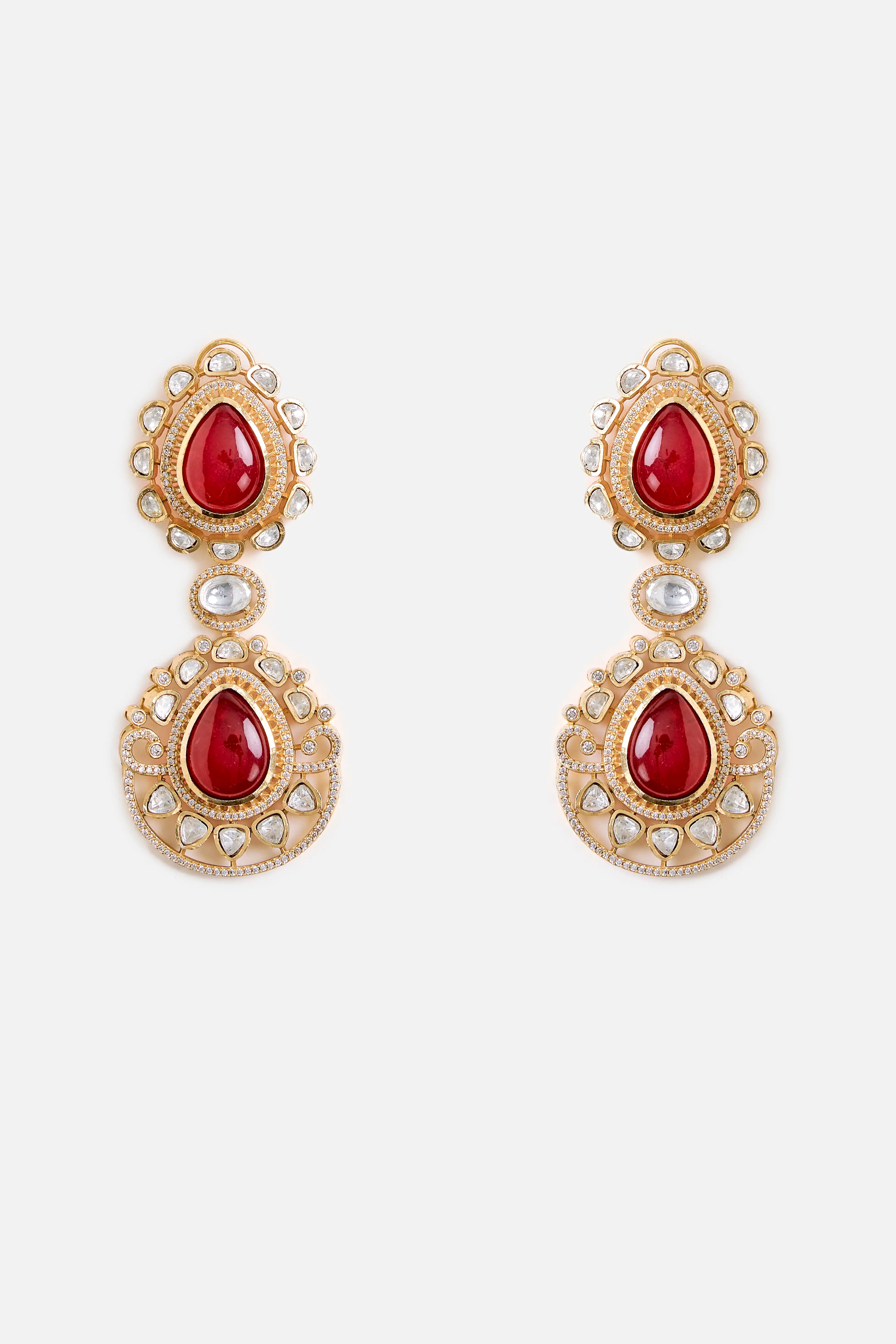 These Ruby Red Statement Drop Earrings showcase bold red stones framed in intricate gold detailing, creating a royal and glamorous look. Perfect for weddings, parties, or festive celebrations.