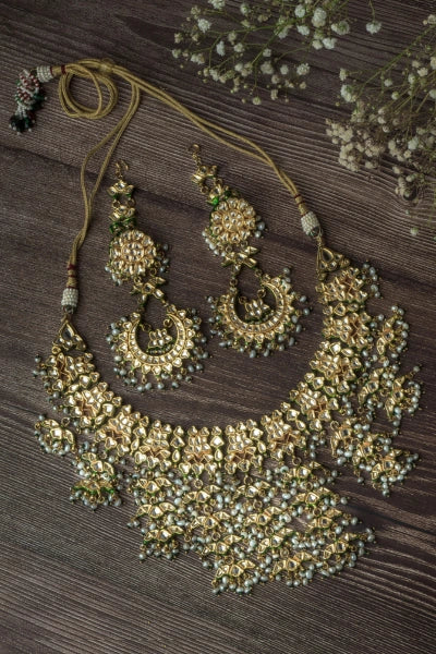 Stunning gold-toned Kundan jewellery set featuring an elaborate choker necklace and grand chandbali earrings. Embellished with pearls and green accents, perfect for bridal and festive occasions.
