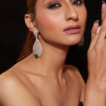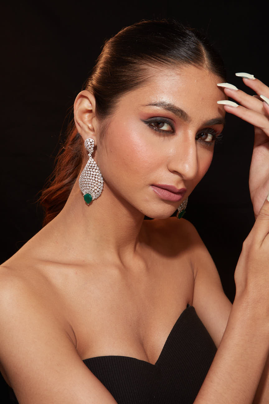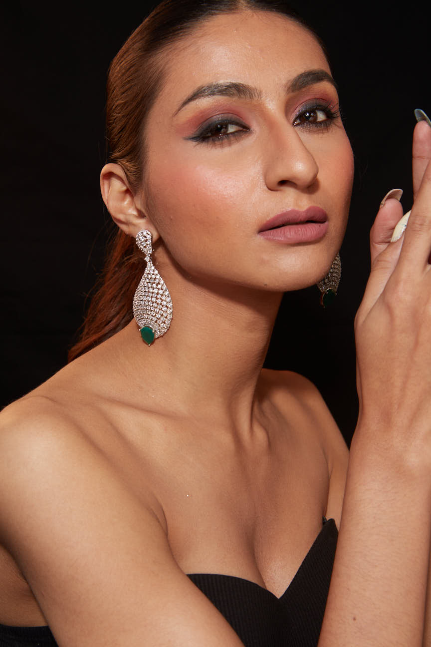 These striking teardrop earrings feature intricate detailing with sparkling stones and a touch of green accents, perfect for adding sophistication to any outfit. Lightweight yet bold.