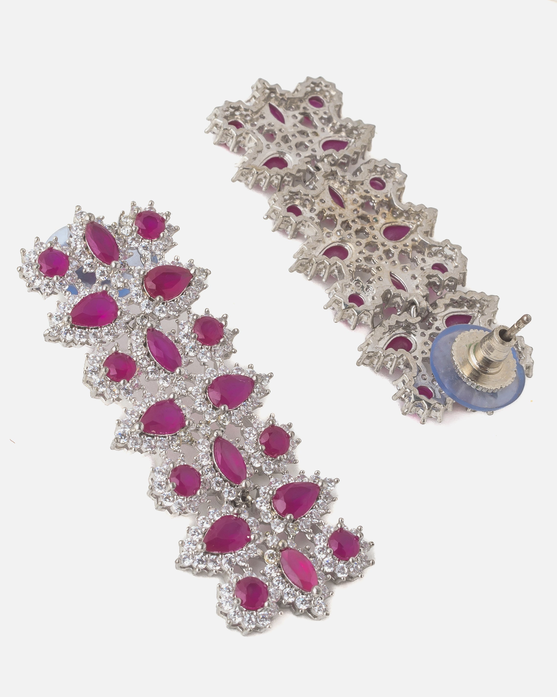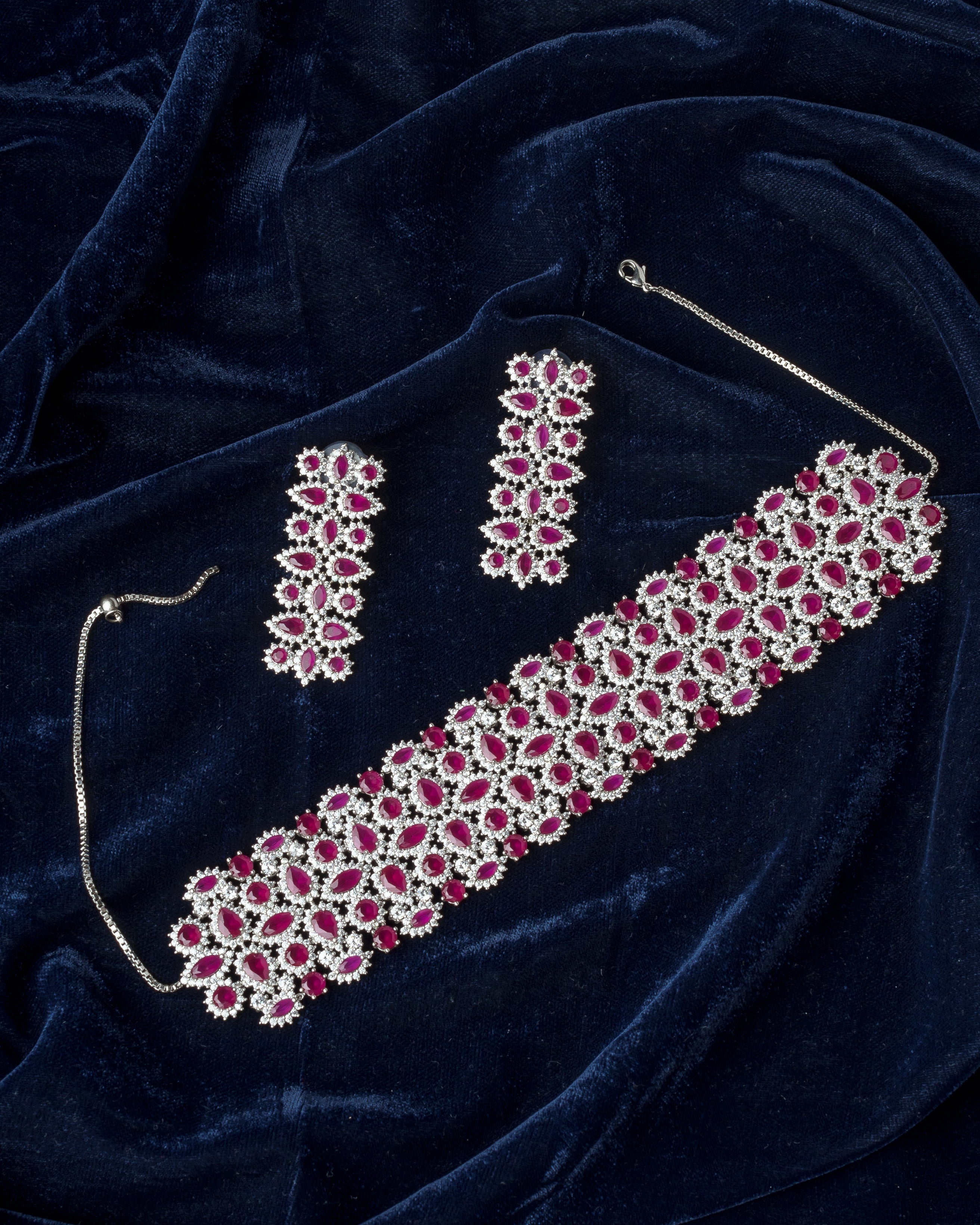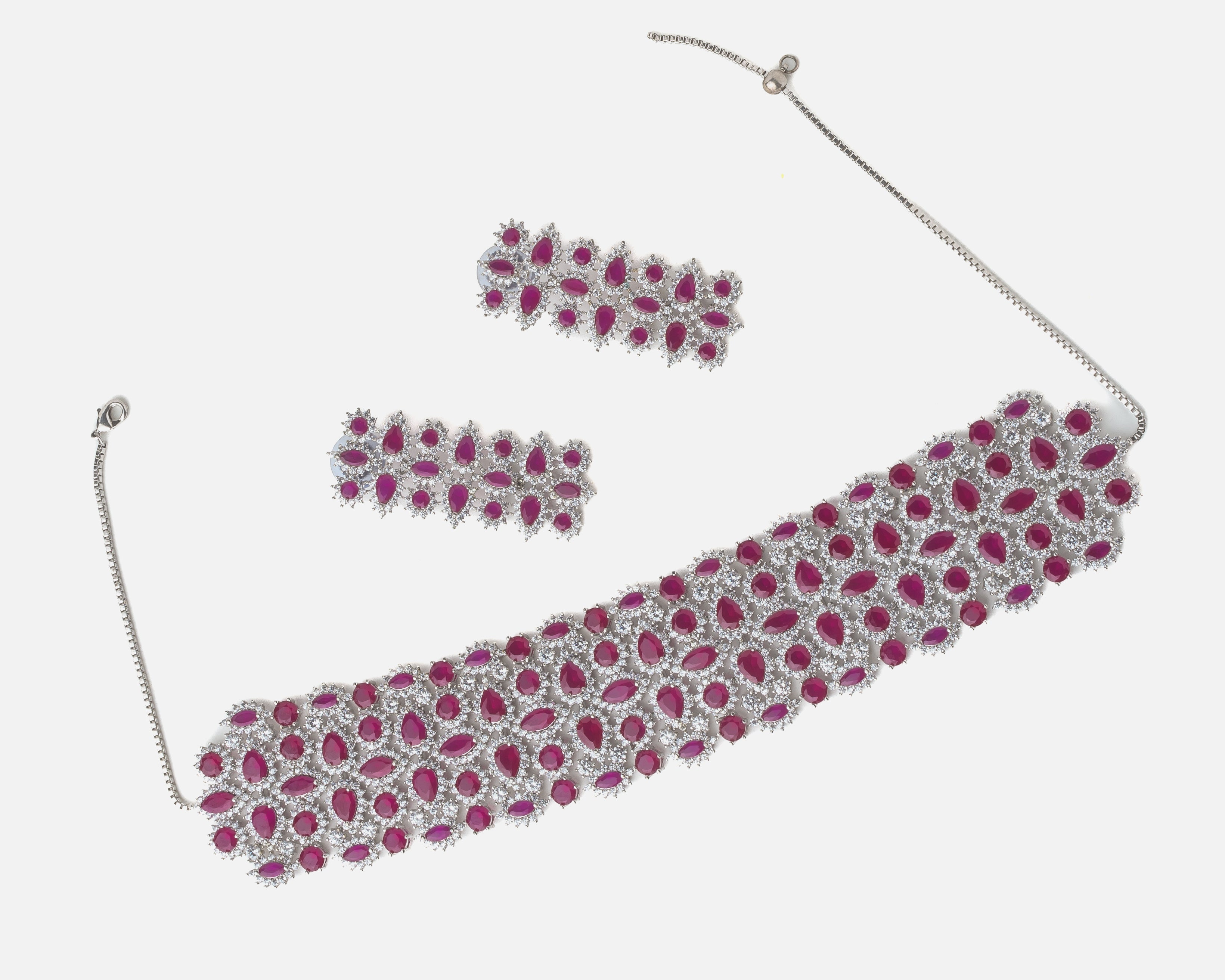 Elegant choker set adorned with ruby-red and white stones in floral motifs. Includes a wide, intricate necklace and matching long earrings perfect for weddings or festive occasions.