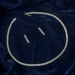 Elegant crystal choker necklace set with matching earrings, featuring a sleek silver-tone finish and uniform sparkling stones. Ideal for parties, weddings, or evening wear with a modern, glamorous touch.