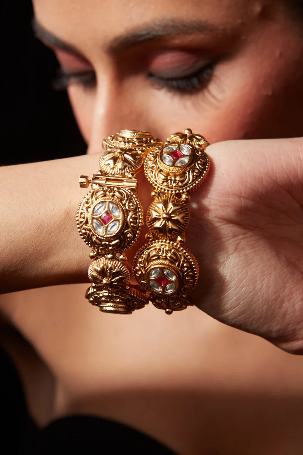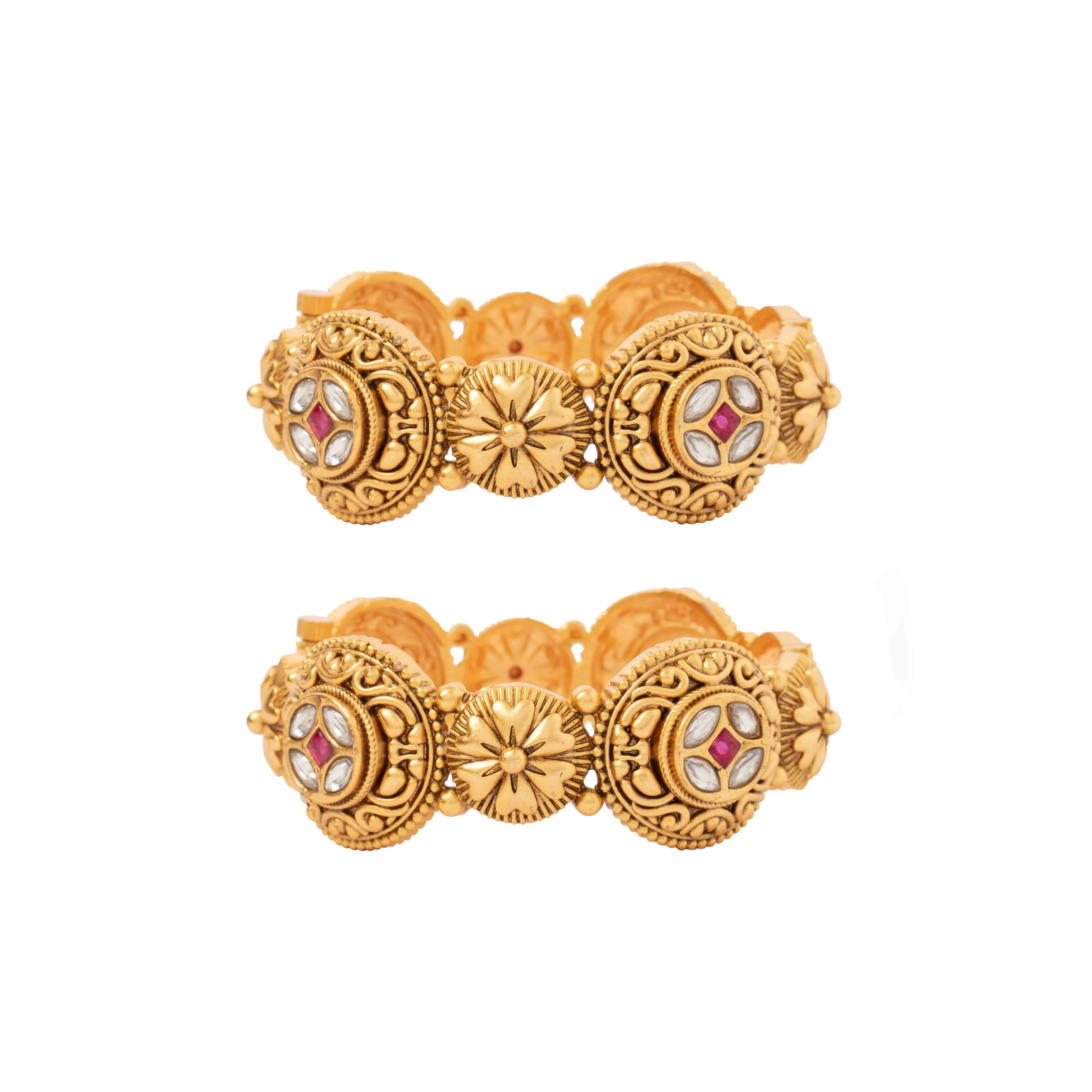 Luxurious gold-toned bangles with intricate detailing and embedded gemstones. A perfect fusion of tradition and elegance, ideal for weddings, festive occasions, or statement jewellery lovers seeking timeless charm!