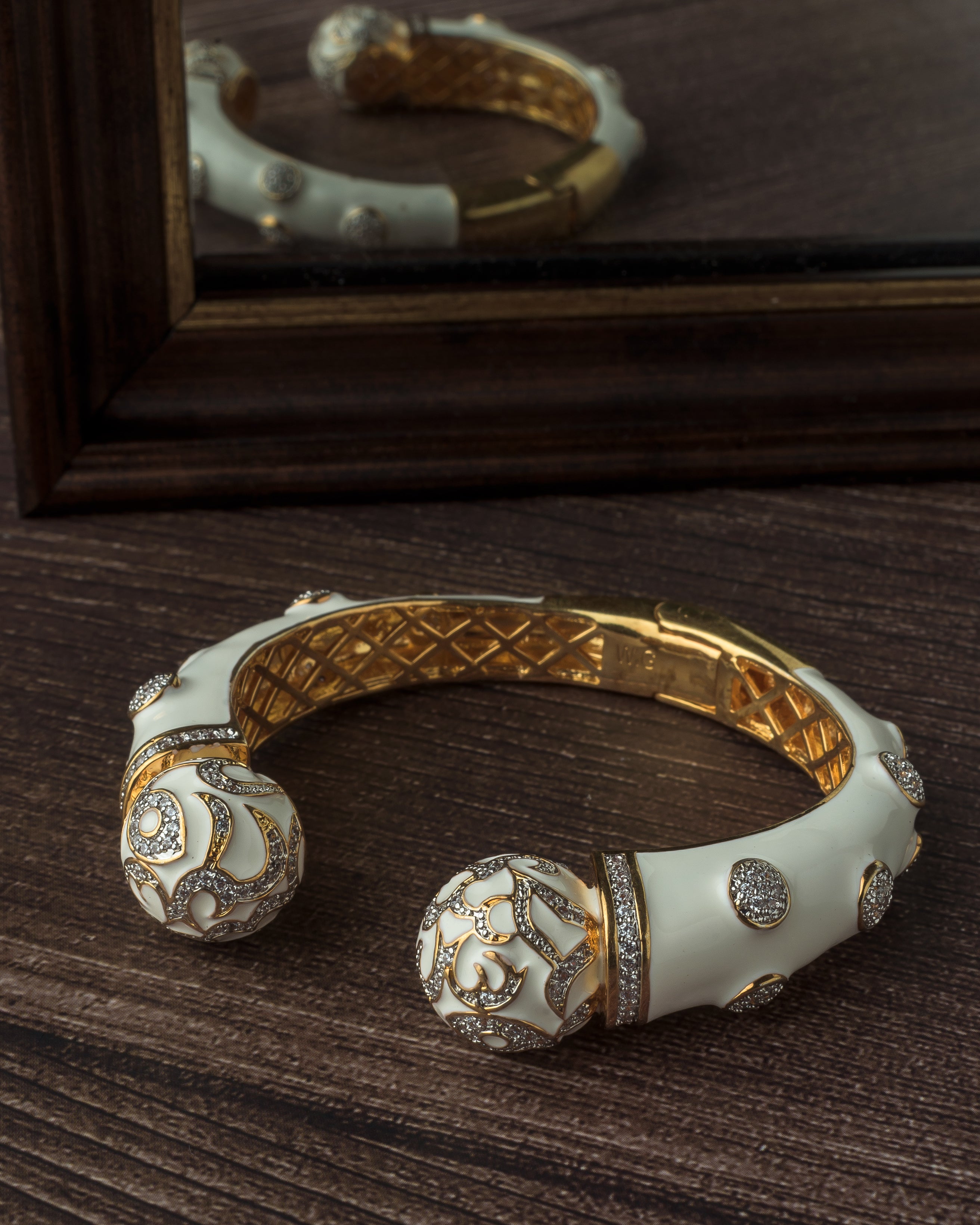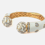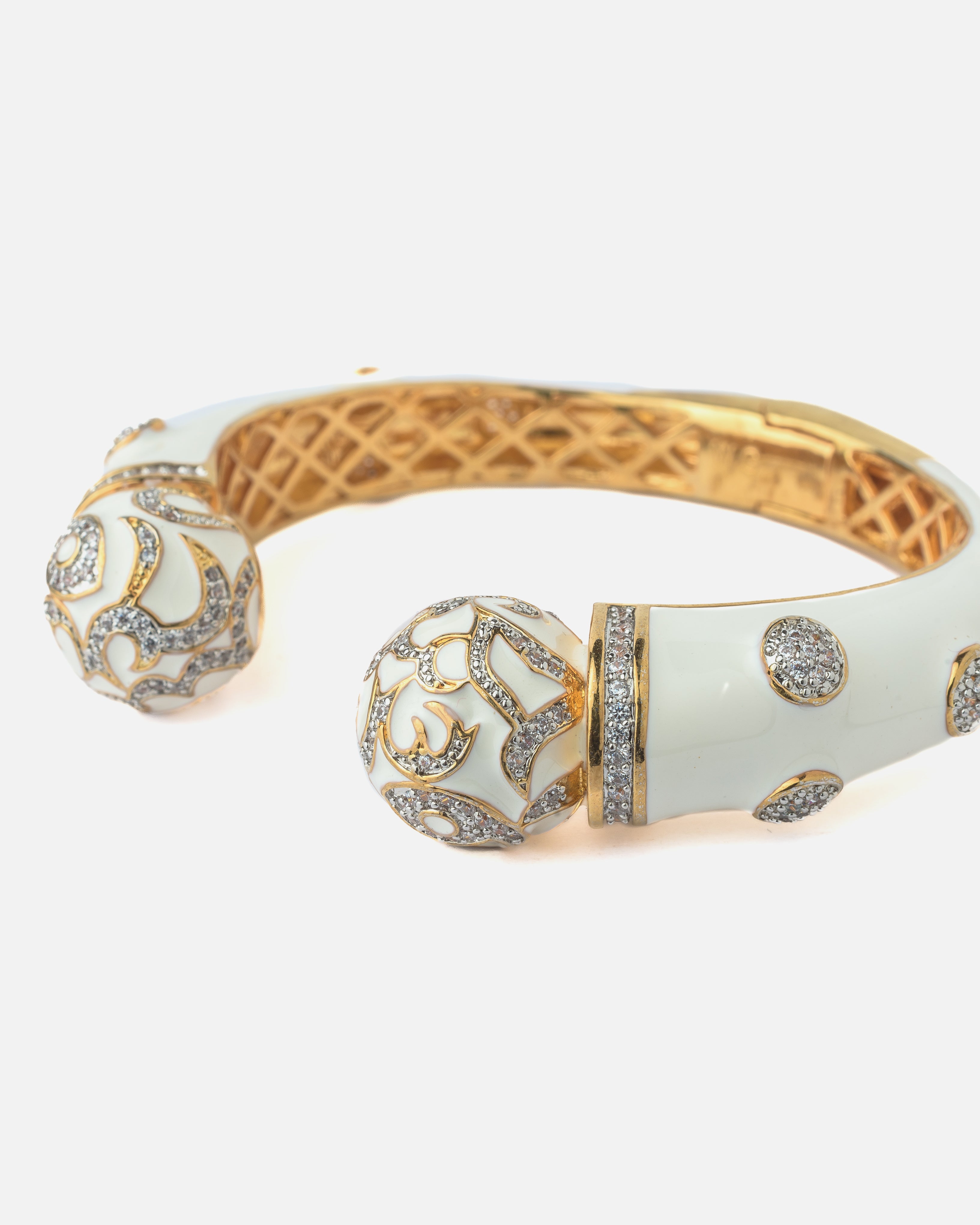 This luxurious gold-toned cuff bracelet features intricate white enamel work and dazzling crystal embellishments, finished with ornate domed ends for a regal, statement-making accessory.