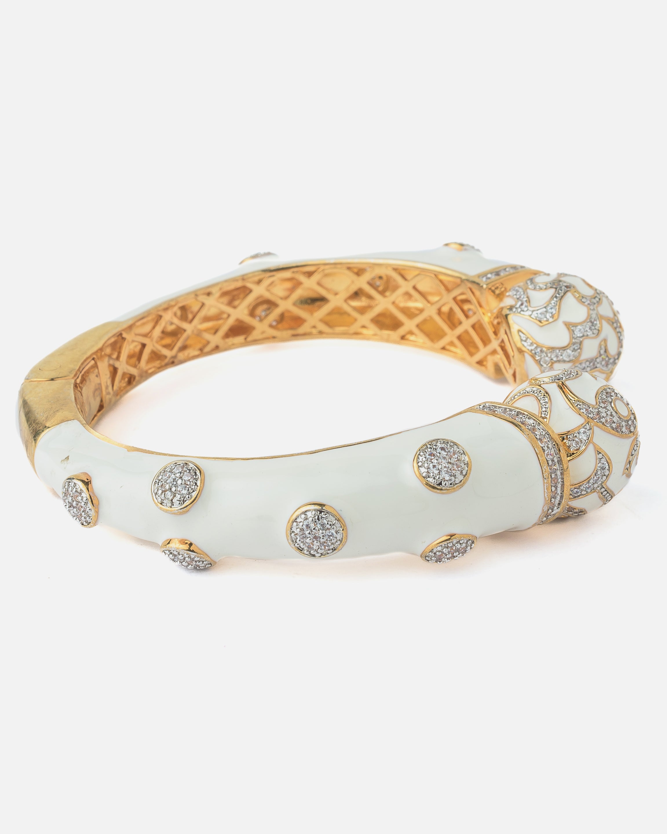 • Elegant Design: Gold-toned cuff adorned with smooth white enamel and intricate cutwork detailing.