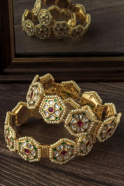 Elegant gold-plated bangles adorned with multi-coloured gemstones and delicate pearl detailing. These intricately crafted hexagonal-patterned pieces add a touch of traditional charm to any outfit.