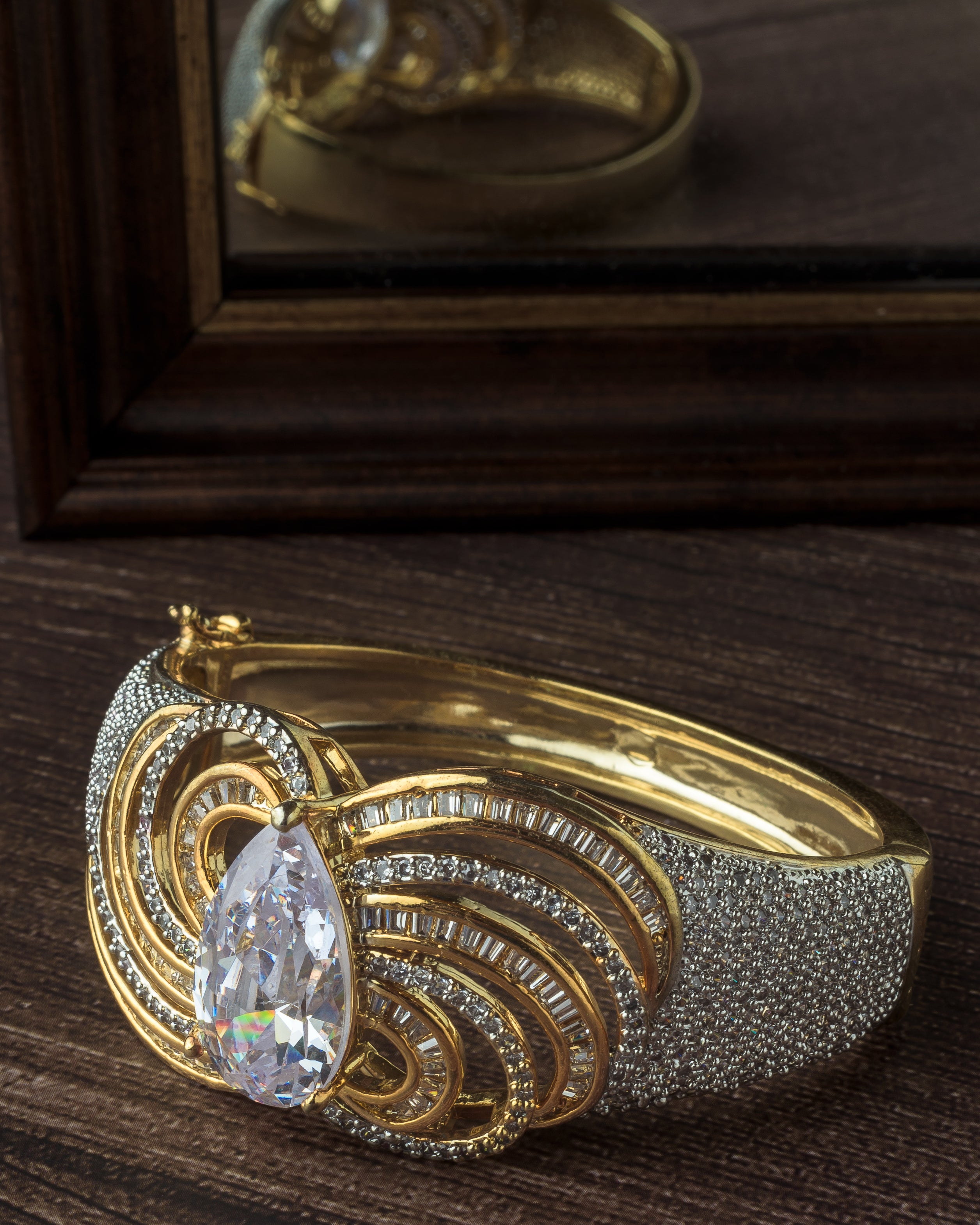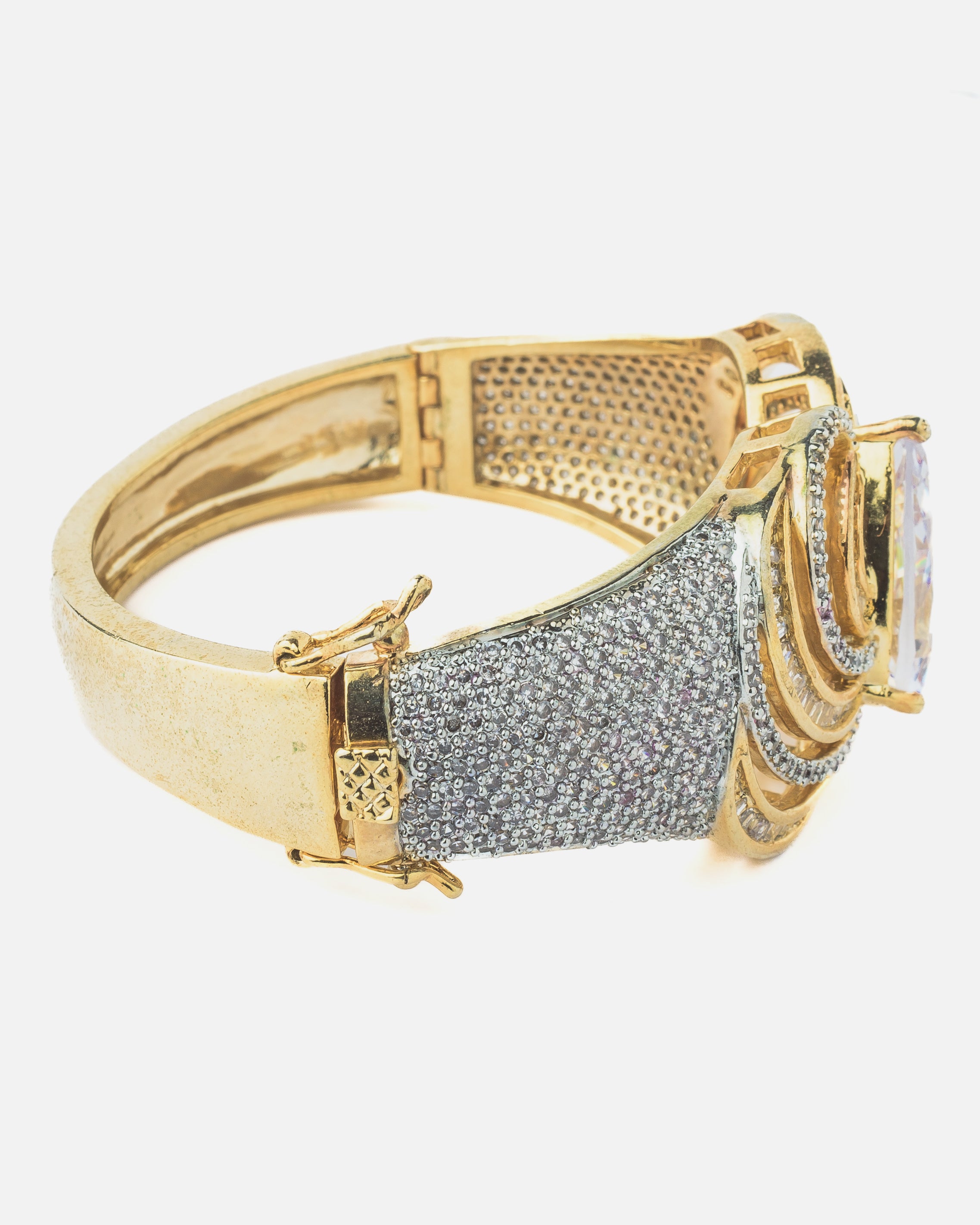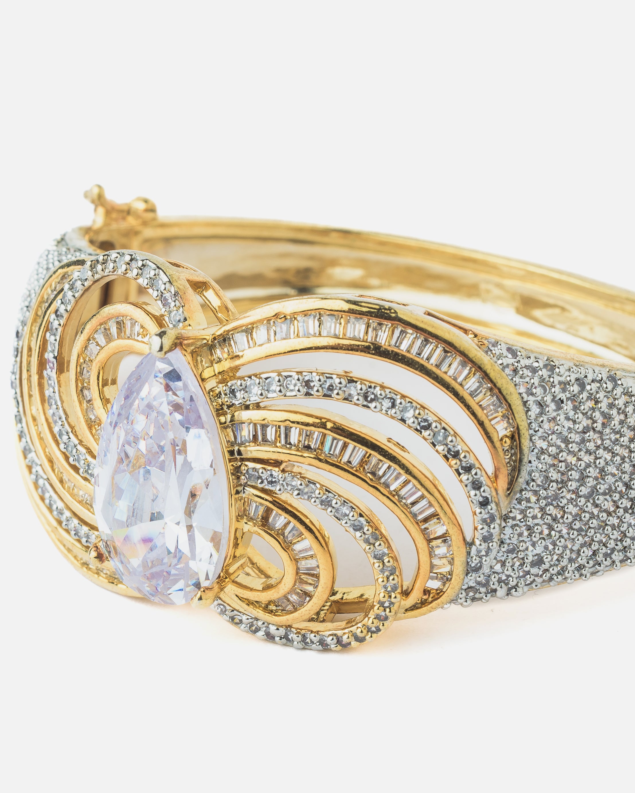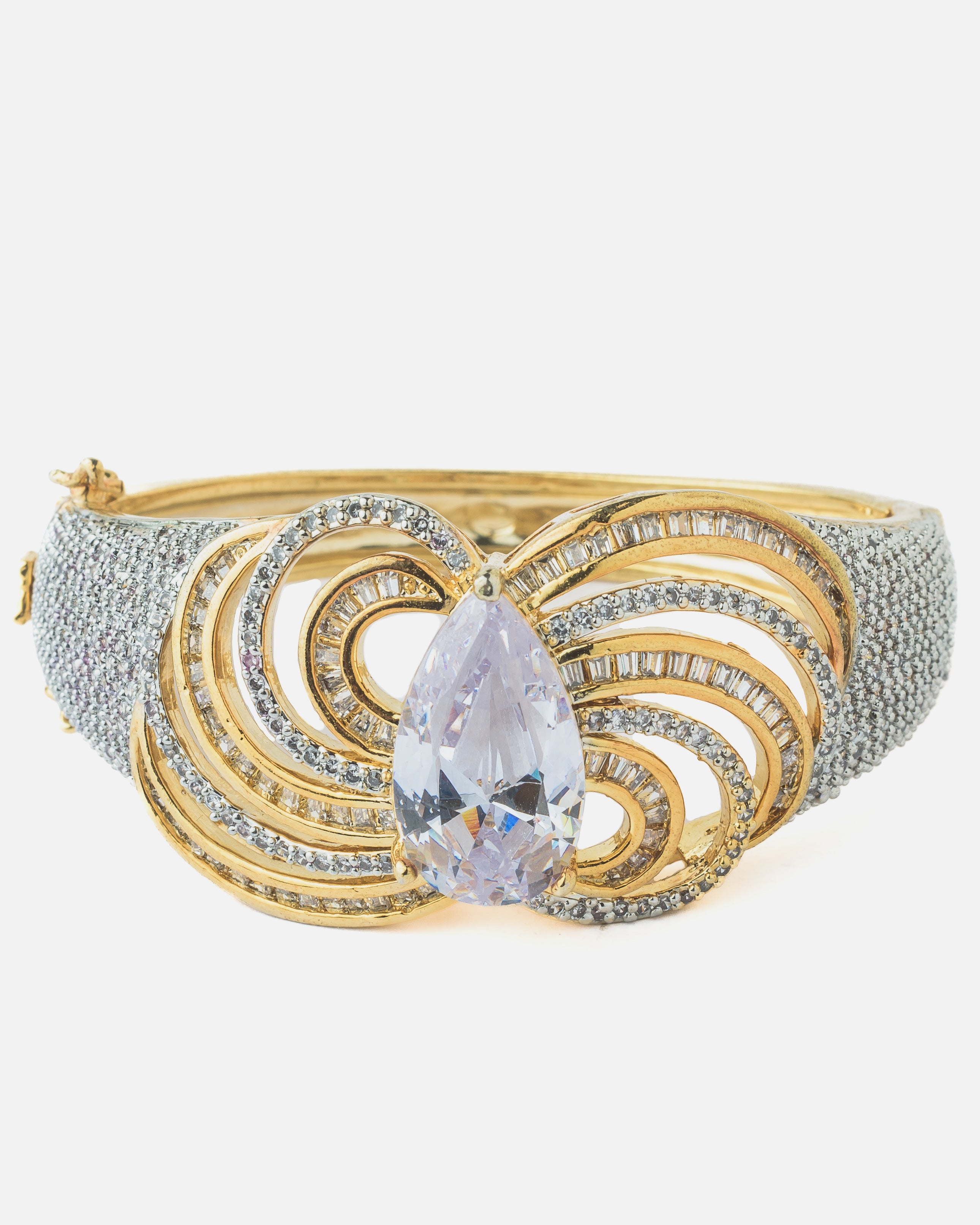 Make a bold statement with this gold-finish bracelet, featuring a dazzling teardrop-shaped stone and intricate swirl design encrusted with crystals. Perfect for weddings, parties, and festive events.