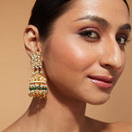 Elegant gold-plated jhumka earrings featuring intricate design with green stone accents and layered detailing. Perfect for weddings, festive occasions, and adding a touch of tradition to your look.
