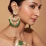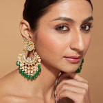 Elegant gold-tone earrings featuring intricate detailing and green gemstone embellishments. A perfect blend of traditional and modern design, ideal for weddings, festive occasions, or statement styling.
