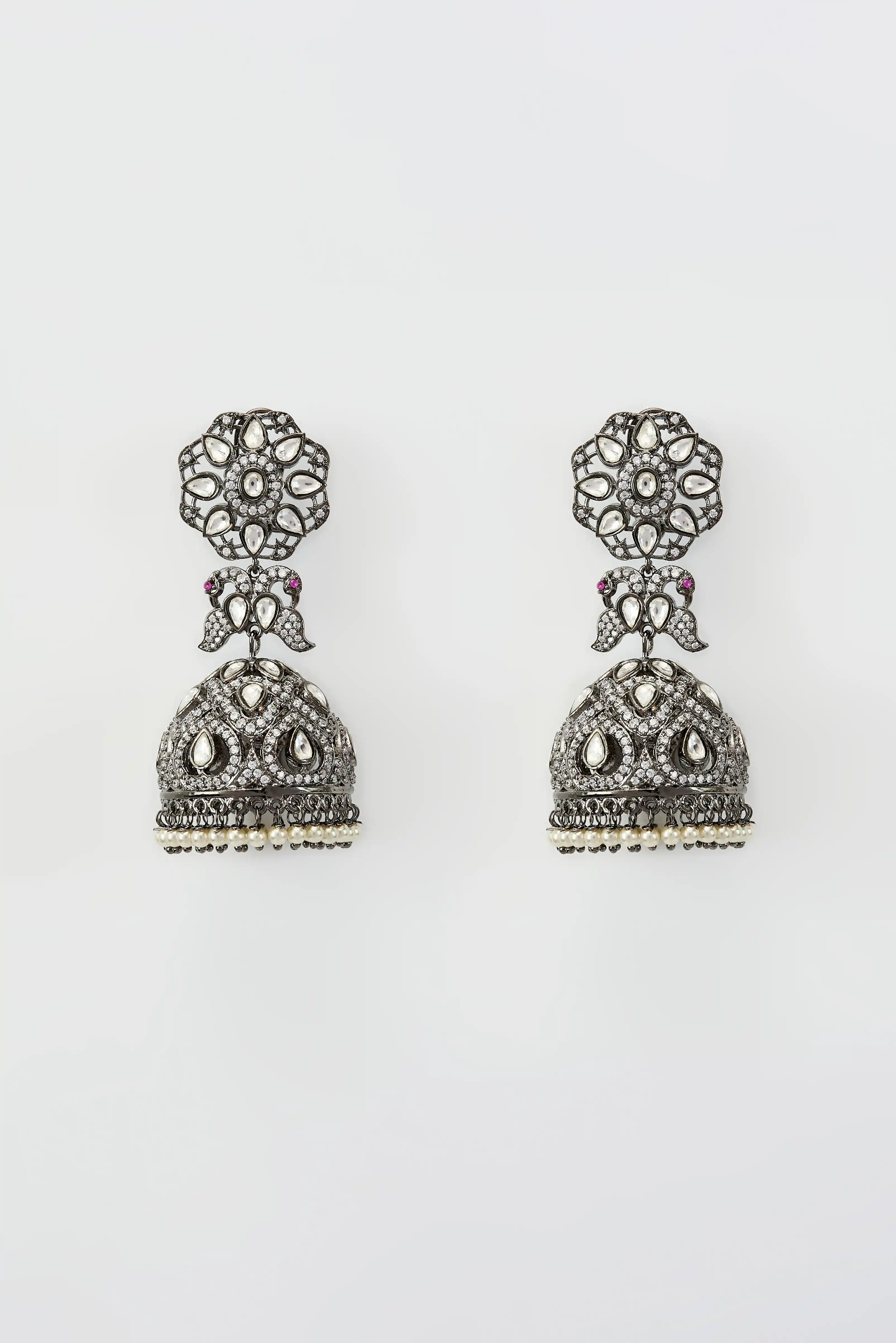 Elegant Jhumka earrings featuring intricate floral motifs & detailed dome-shaped drops,adorned with shimmering stones & delicate pearl accents. A timeless accessory for traditional & festive occasion.