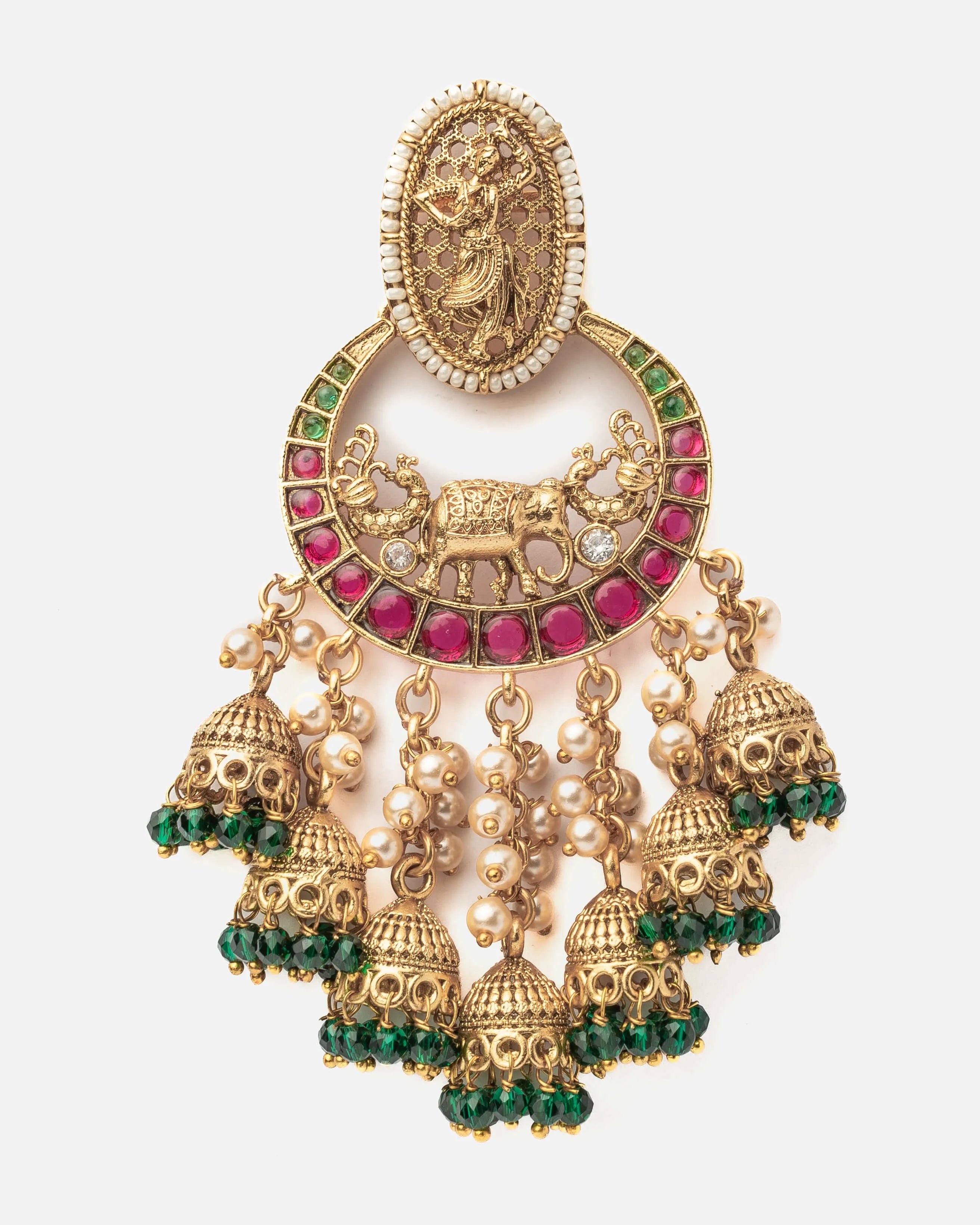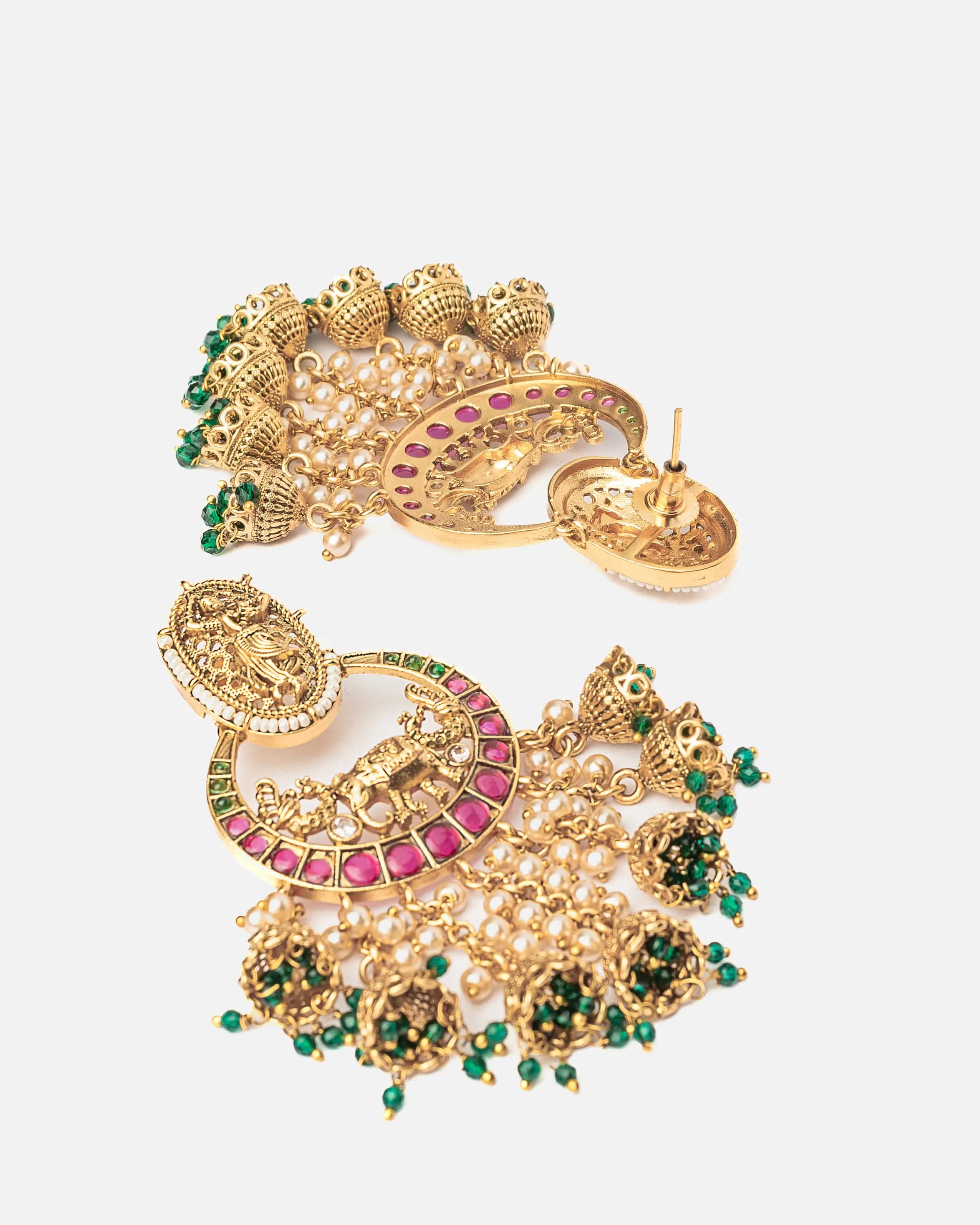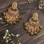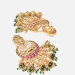 These are elegant gold-plated earrings with intricate pink & green detailing, featuring a floral motif & delicate beads. Perfect for traditional or festive wear, exuding charm & sophistication.