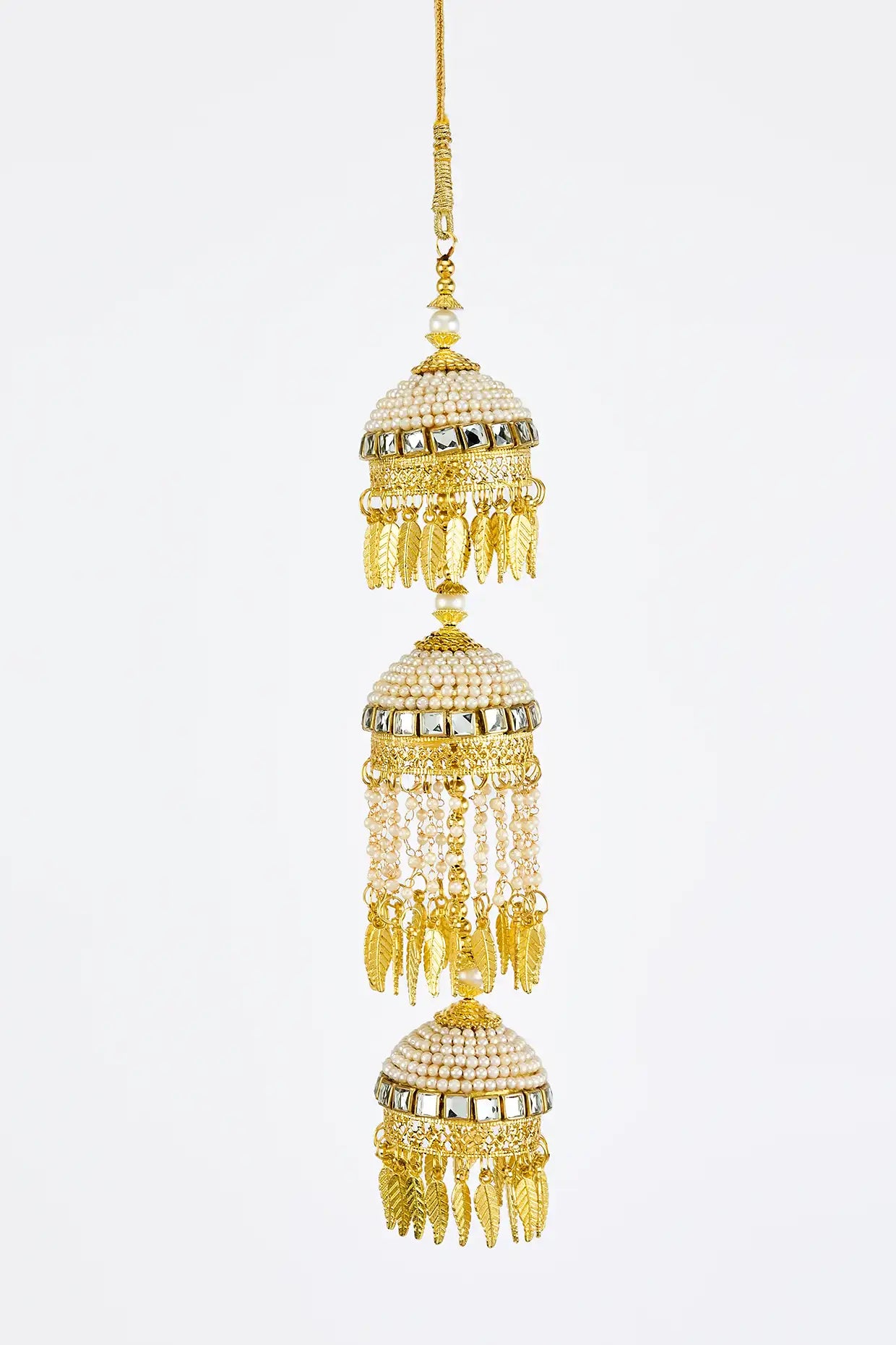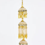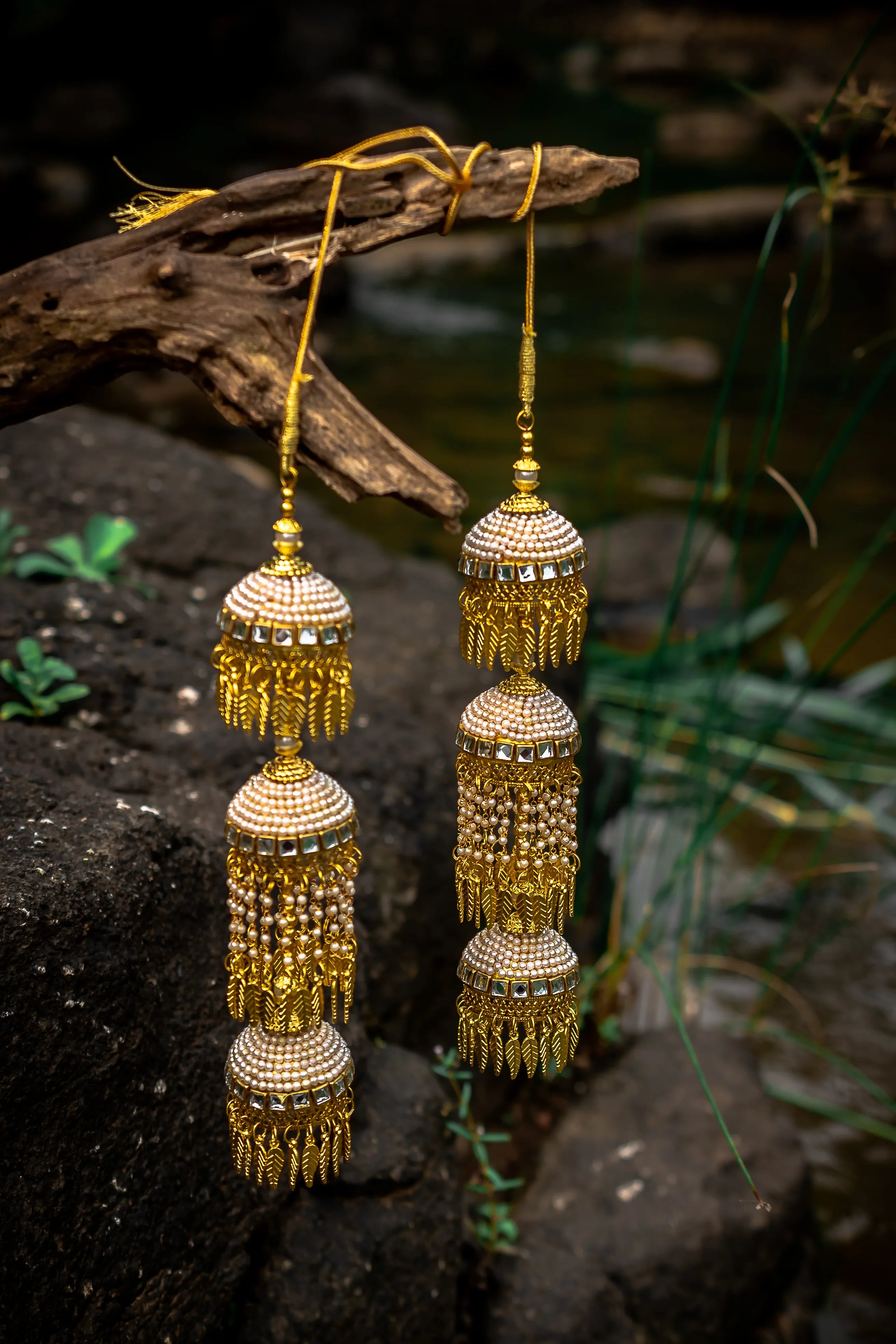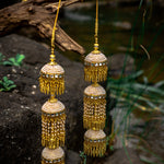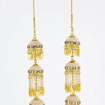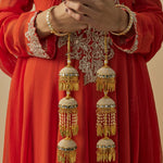 Elegant bridal kaleeras adorned with intricate golden detailing, pearl embellishments, and hanging charms. Perfect for completing your traditional wedding look with grace and sophistication.