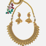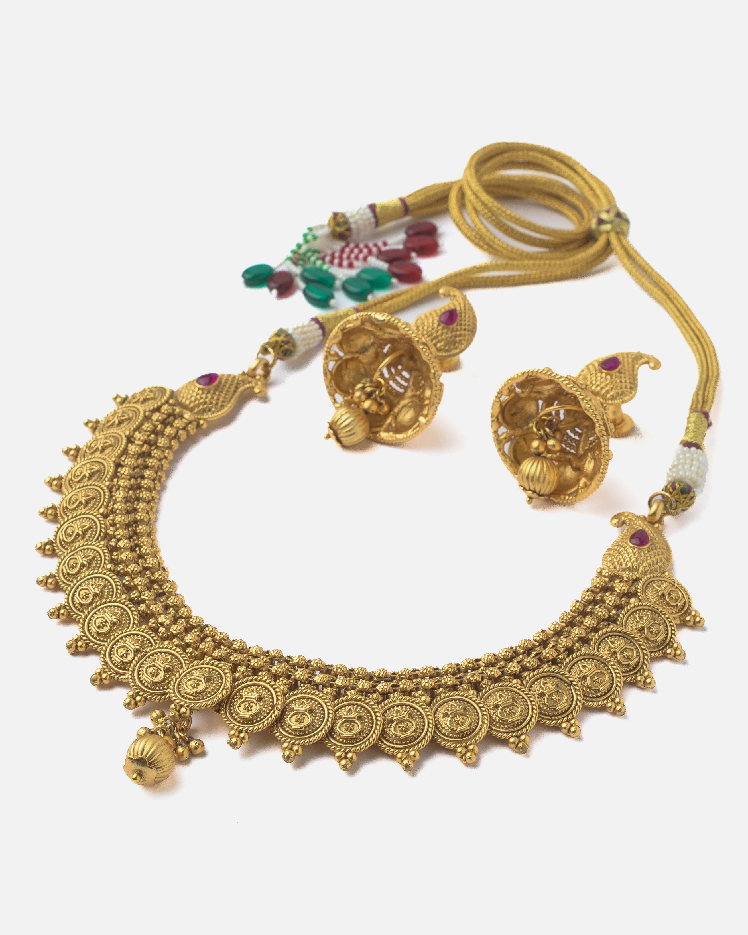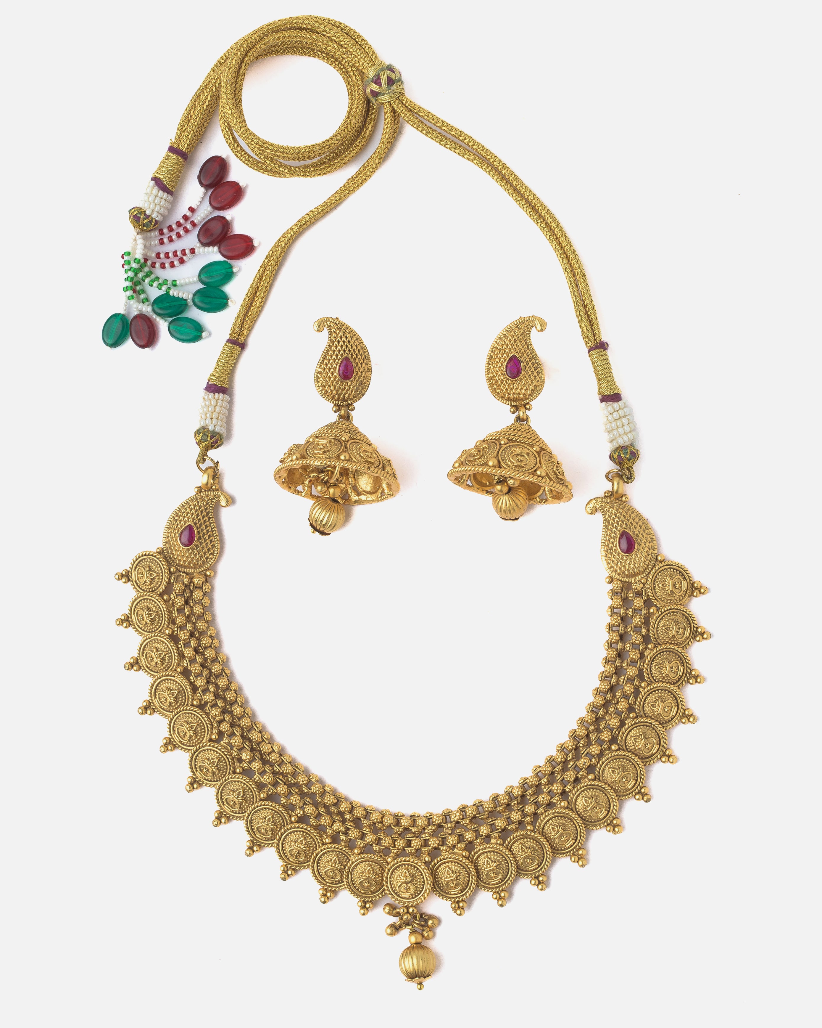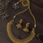 Traditional matte gold necklace set with intricate peacock motifs and matching jhumka earrings. A timeless piece perfect for weddings, temple wear, and festive occasions. Adjustable thread tie.