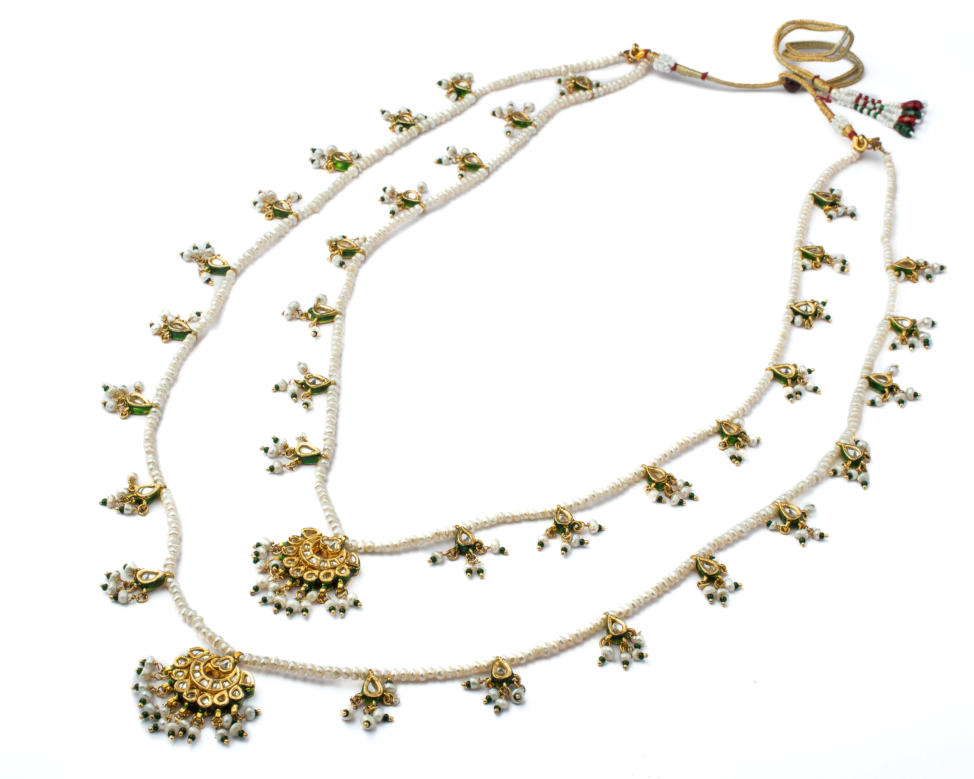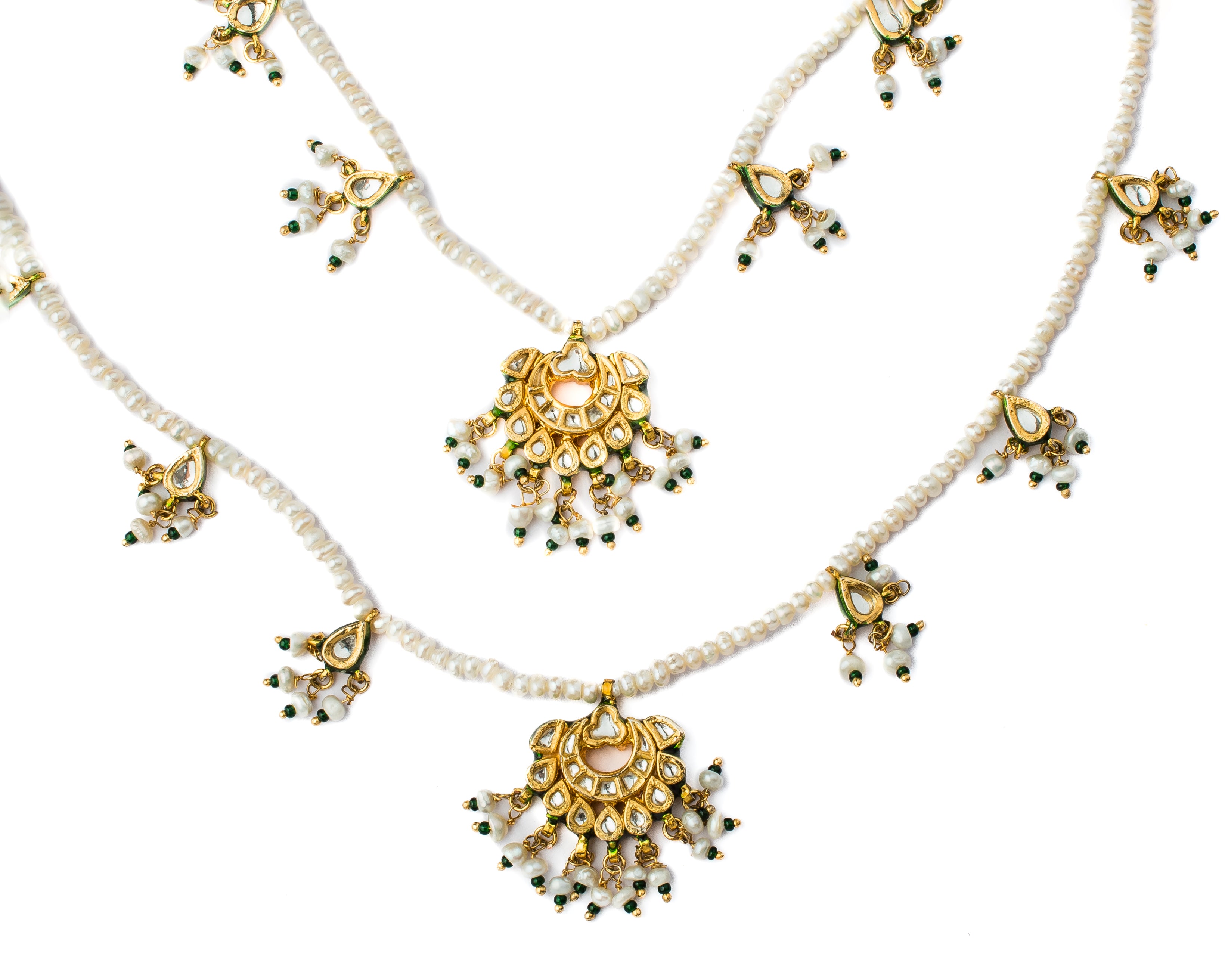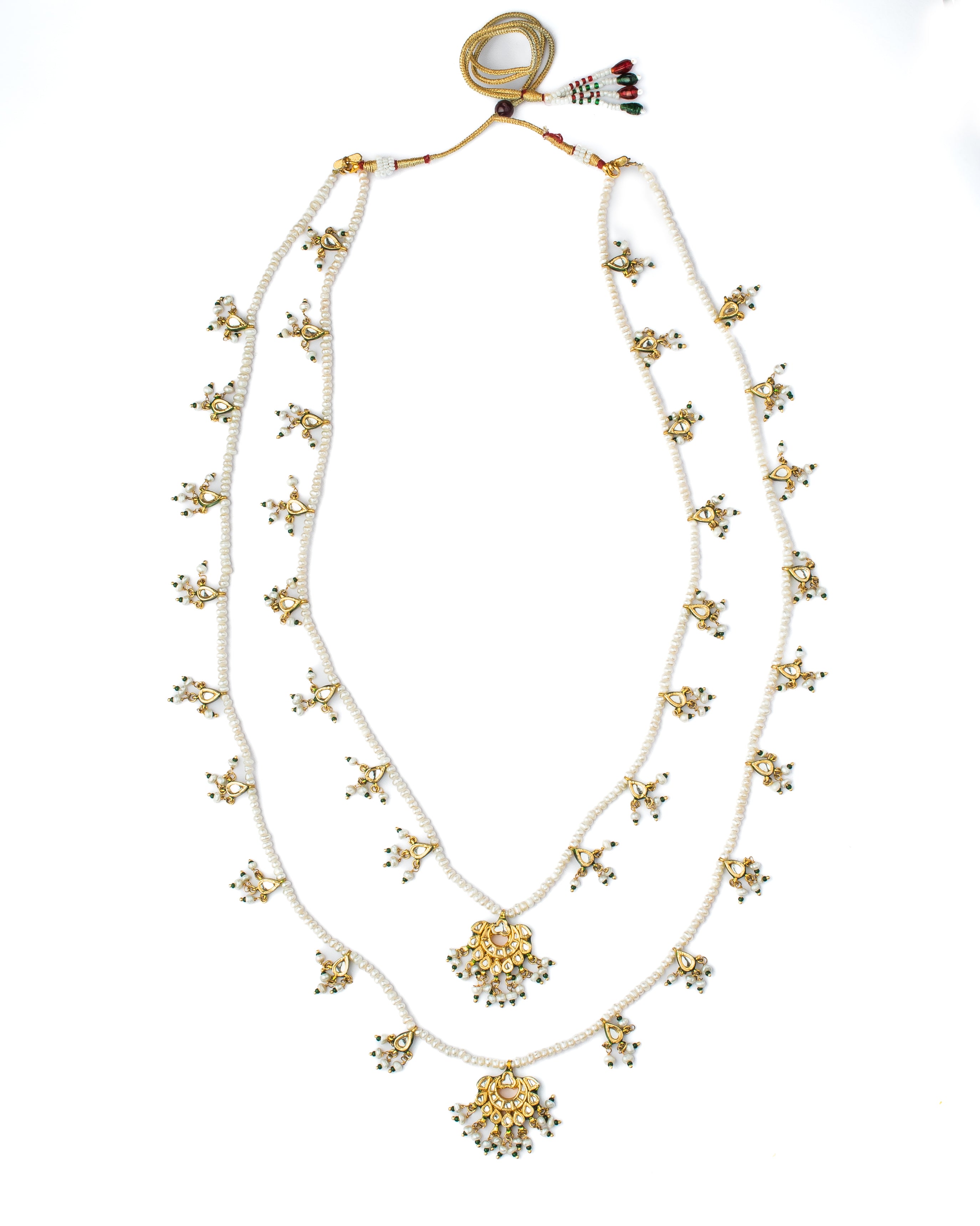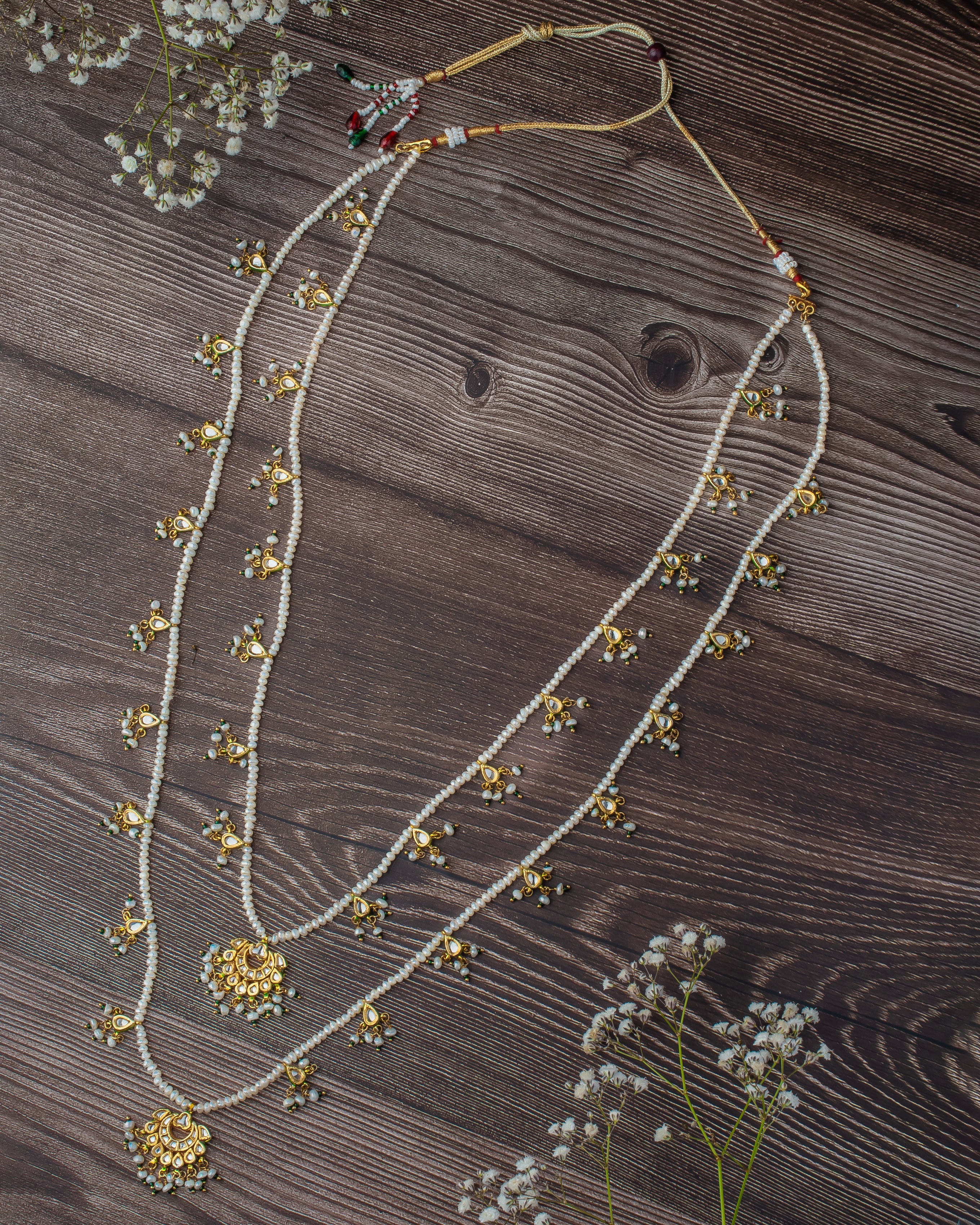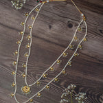 • Traditional Multi-Layer Design: A stunning layered necklace with intricate golden motifs and delicate pearl strands for a timeless, traditional appeal.