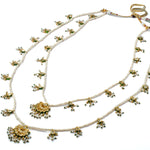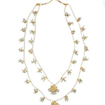 Elegant multi-layered necklace adorned with delicate pearls & golden motifs, featuring intricate craftsmanship and traditional design. A perfect statement accessory for weddings and festive occasions.