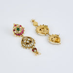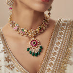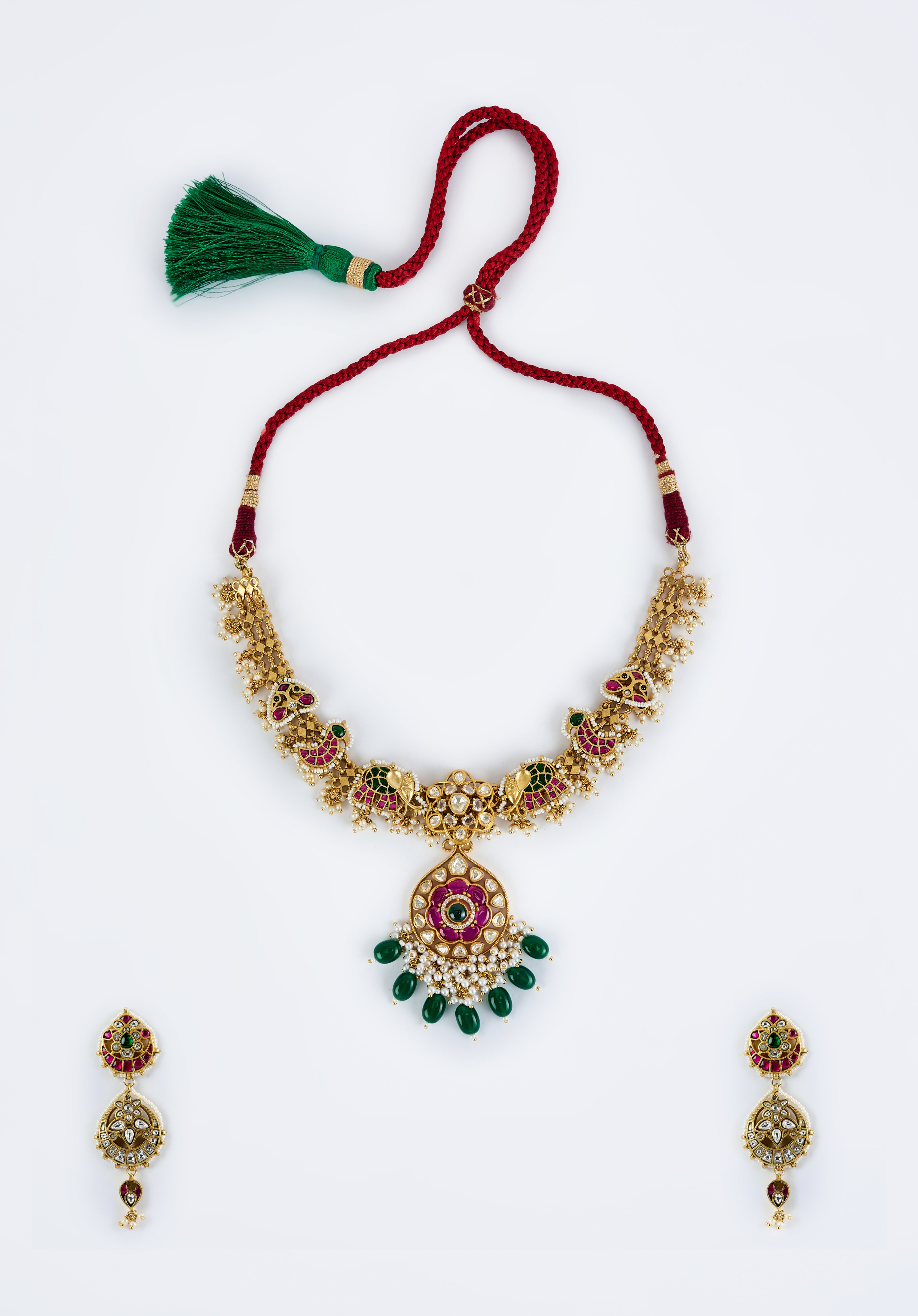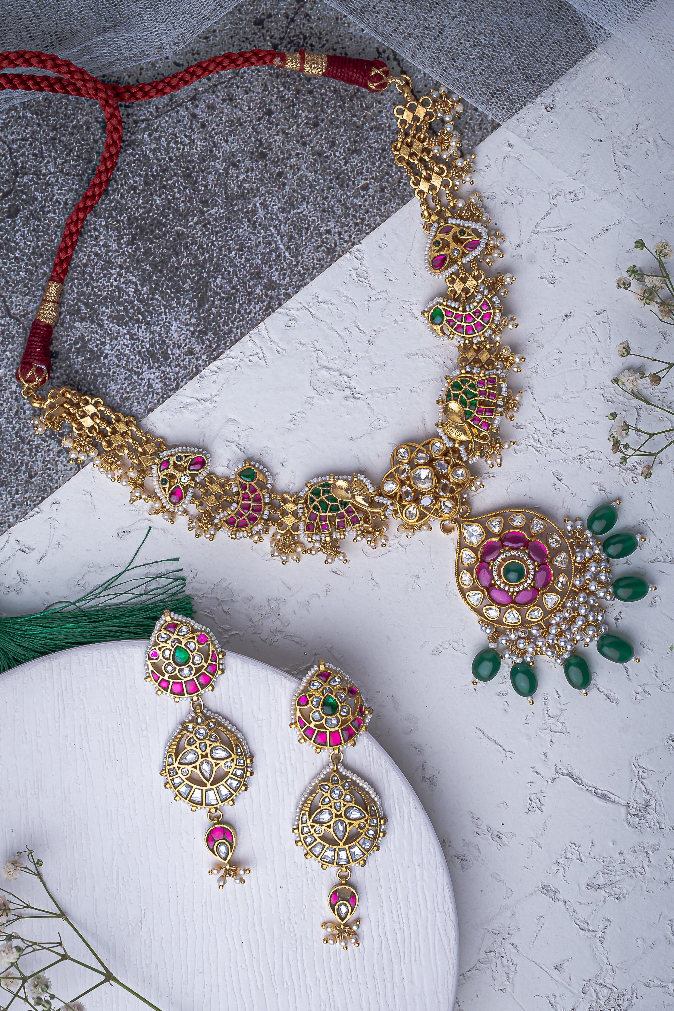 This elegant jewelry set features vibrant green & pink enamel detailing with intricate gold craftsmanship. The set includes a necklace & matching statement earrings, perfect for traditional occasions.
