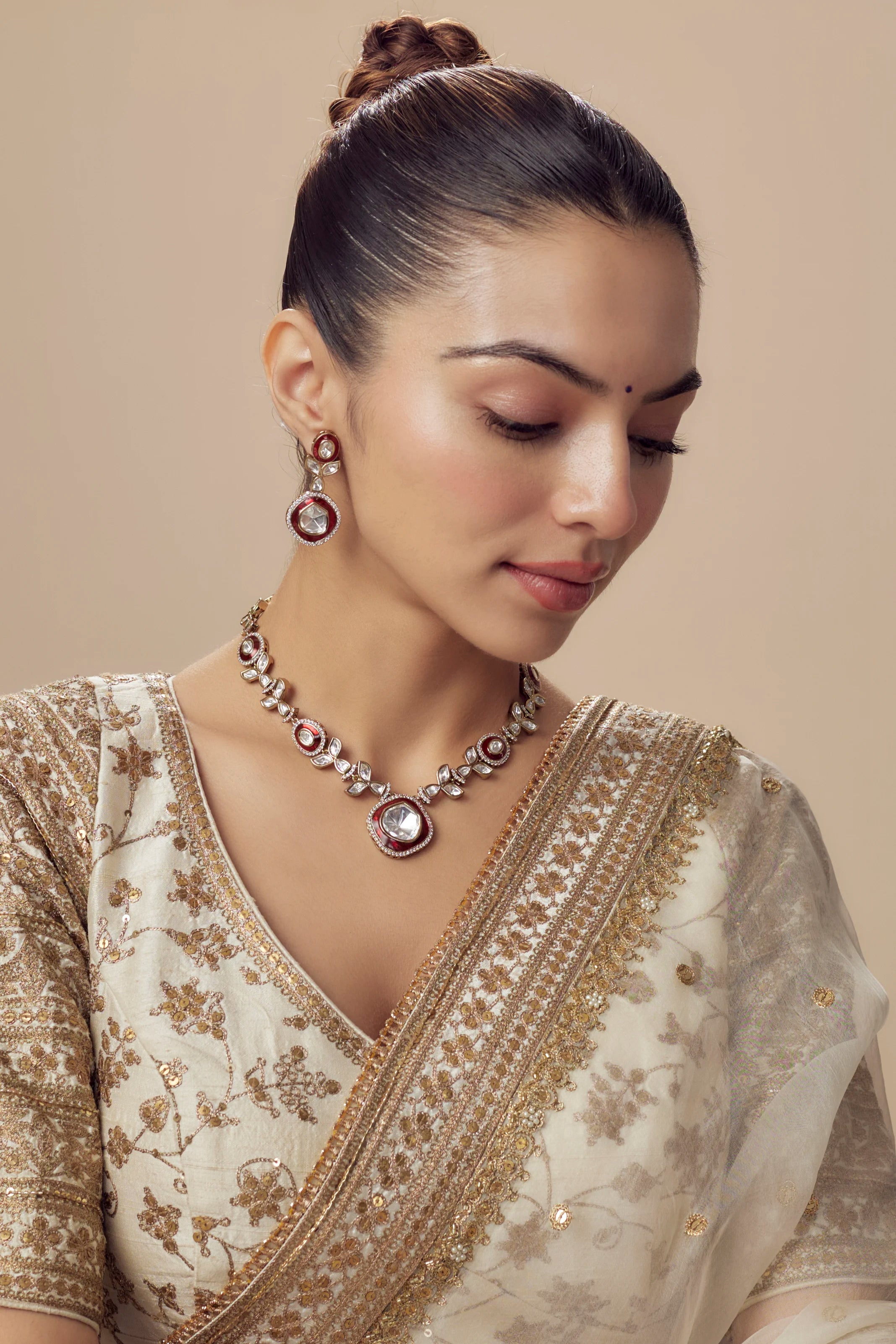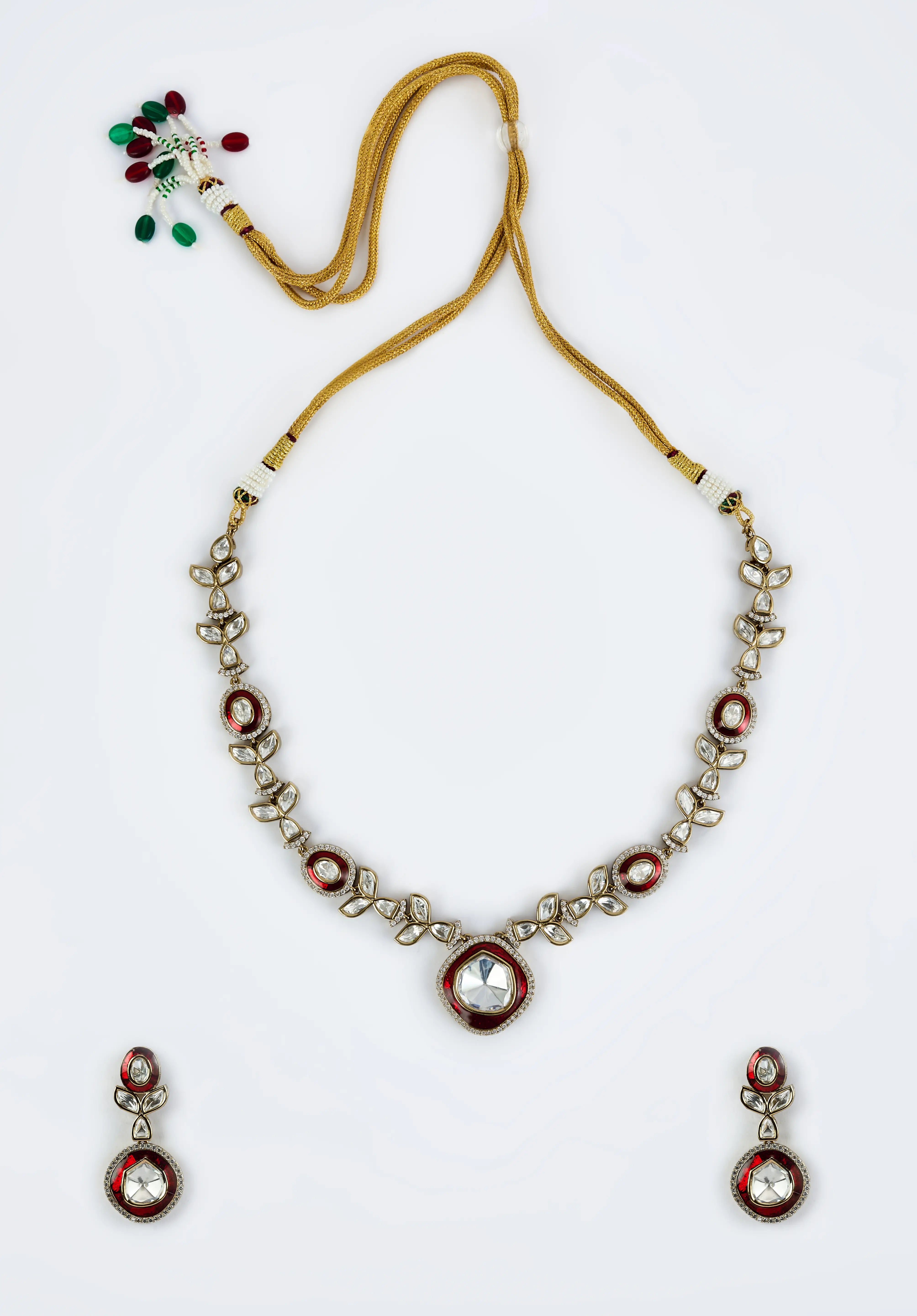 Elegant Kundan necklace set with red & white accents, featuring intricate craftsmanship. The set includes a matching pair of earrings, perfect for traditional or festive occasions. A timeless treasure!
