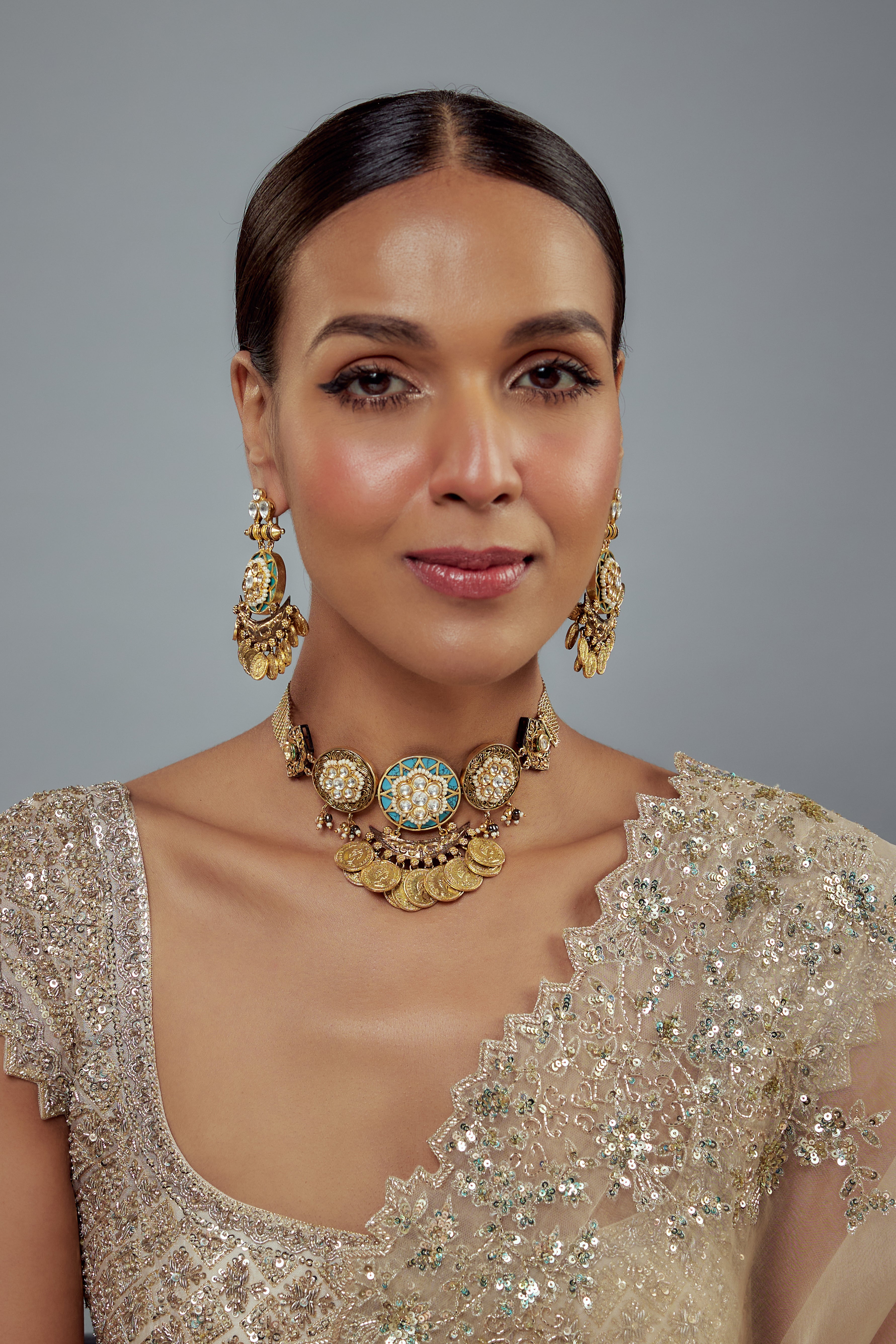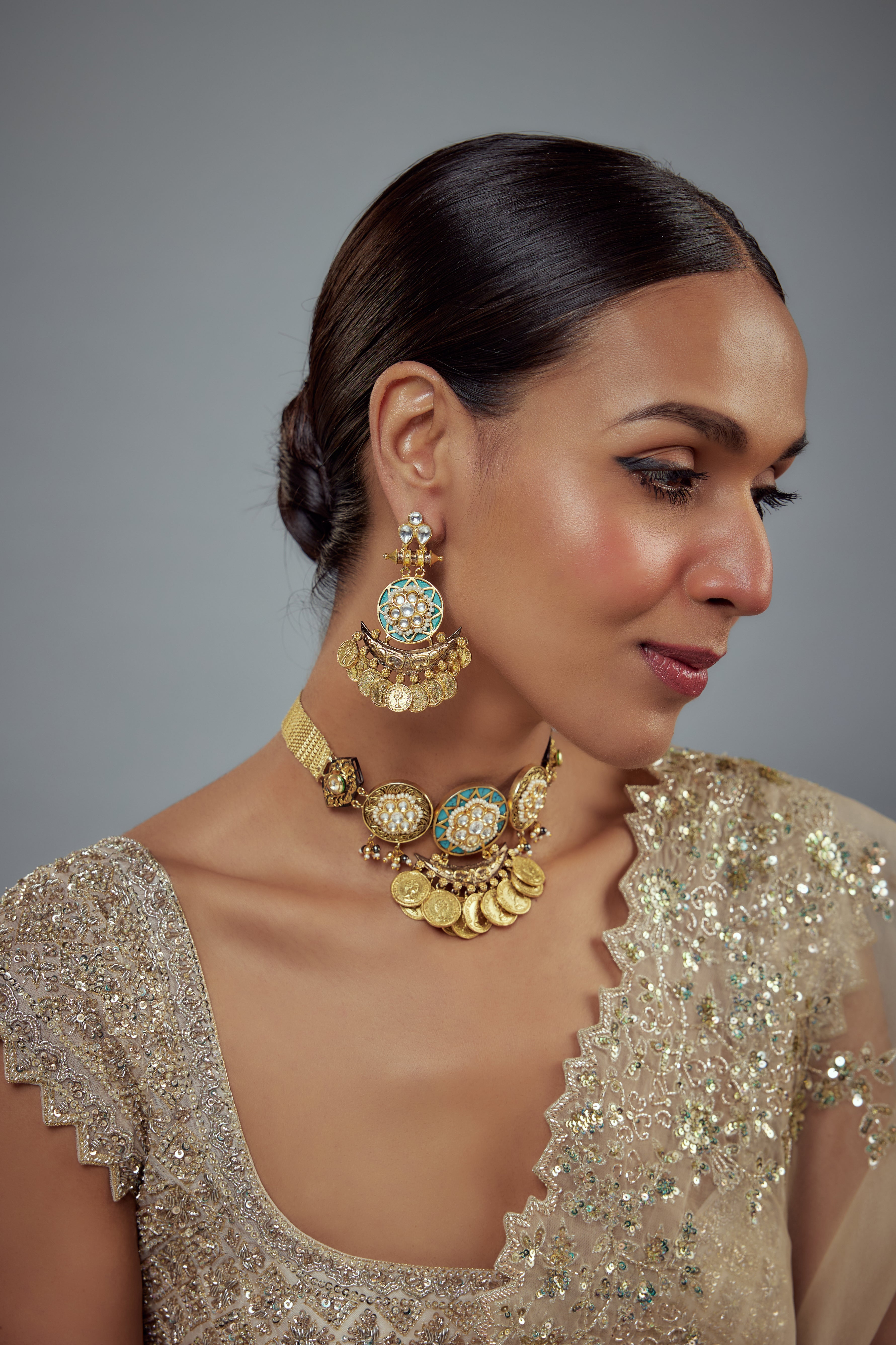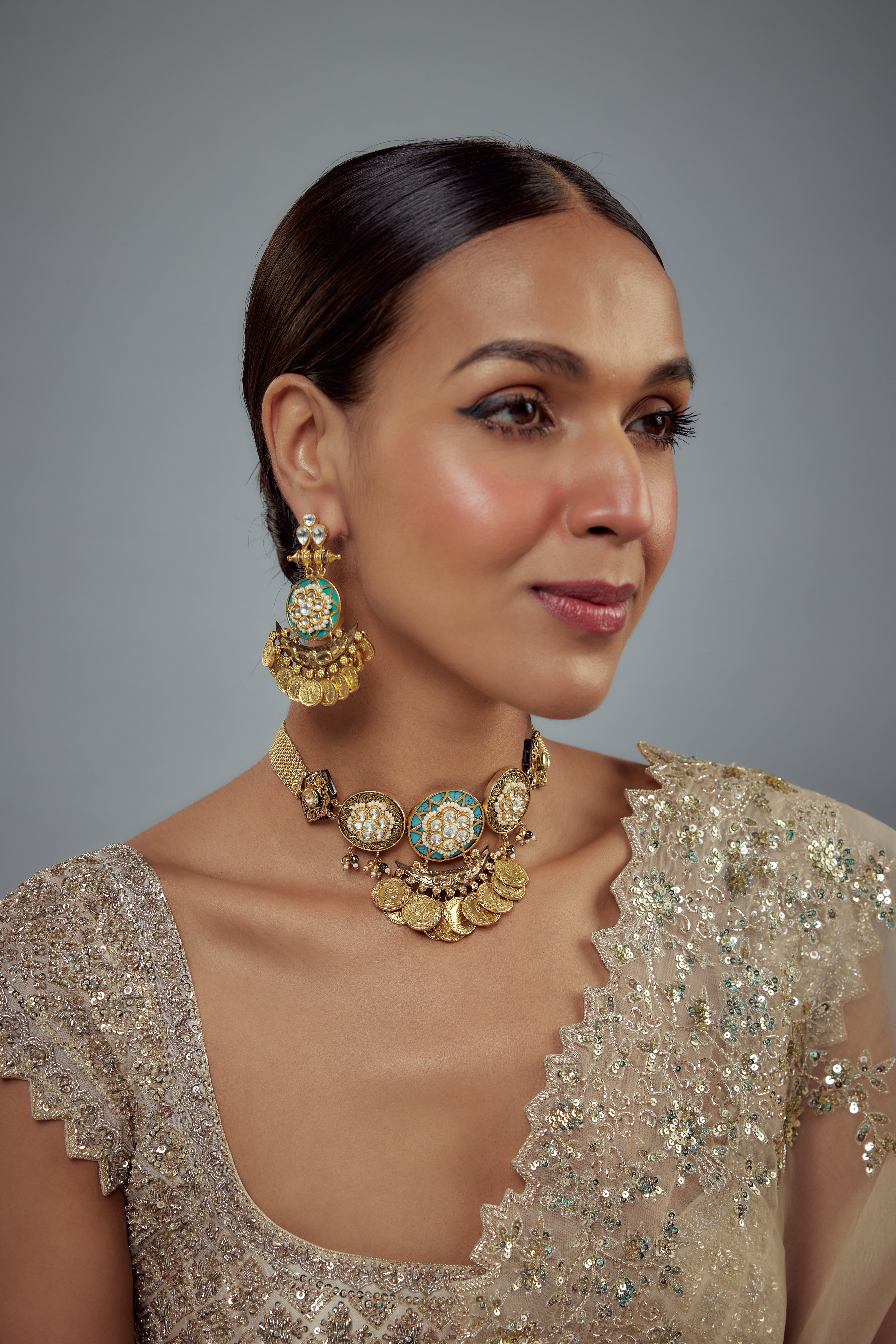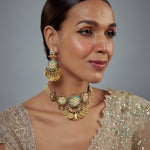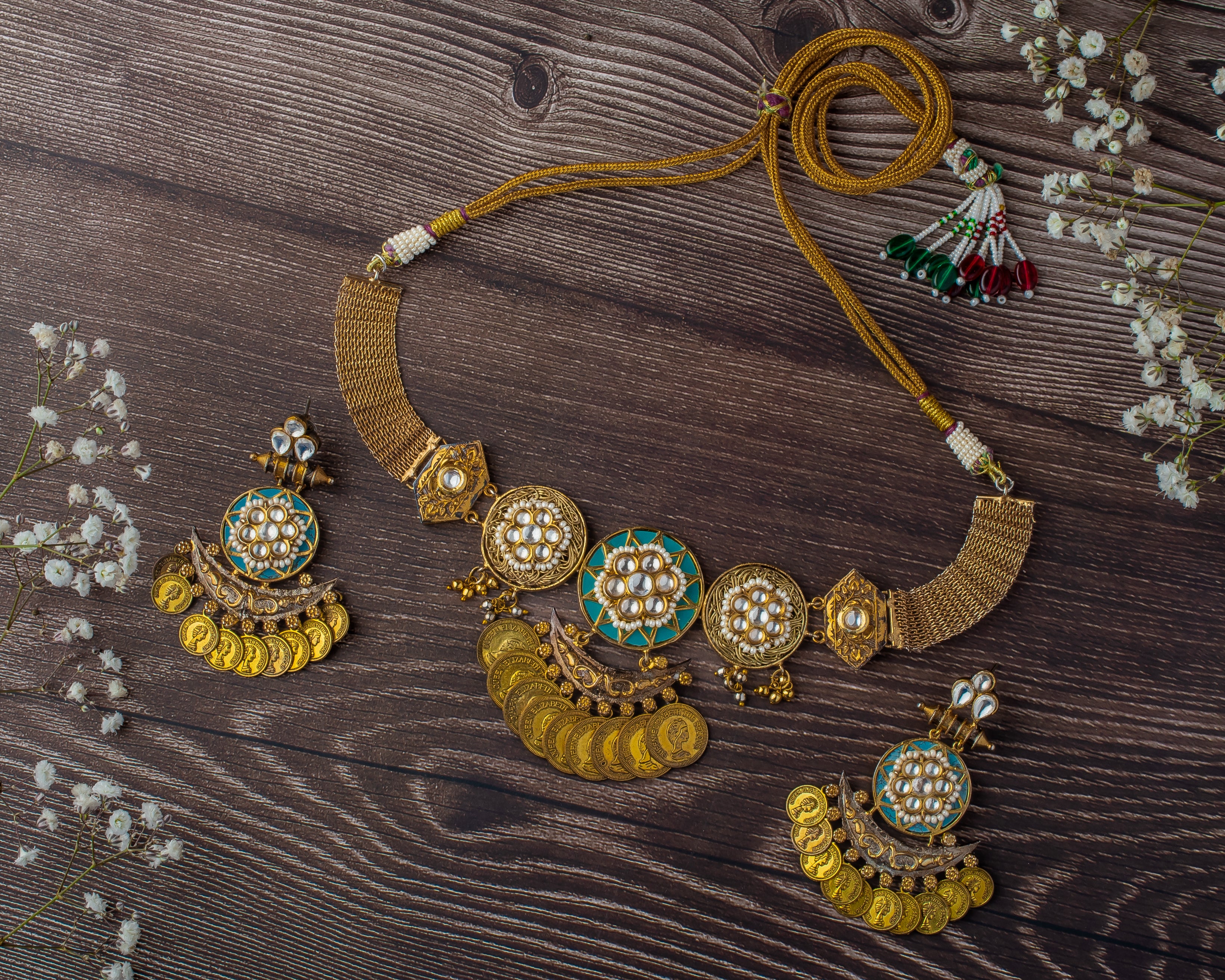 This antique gold-tone necklace set features intricate coin detailing,enamel accents & kundan work, paired with matching earrings. Perfect for festive occasions to make a bold style statement.