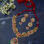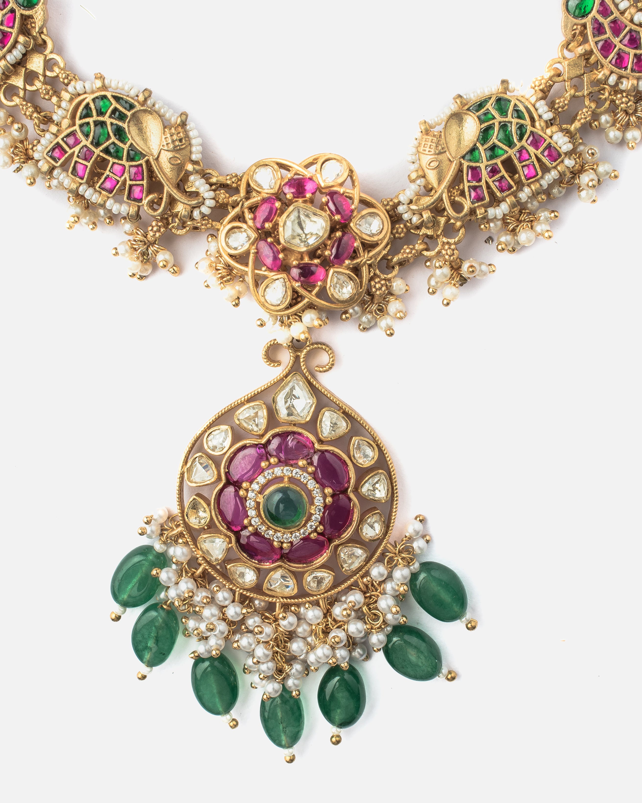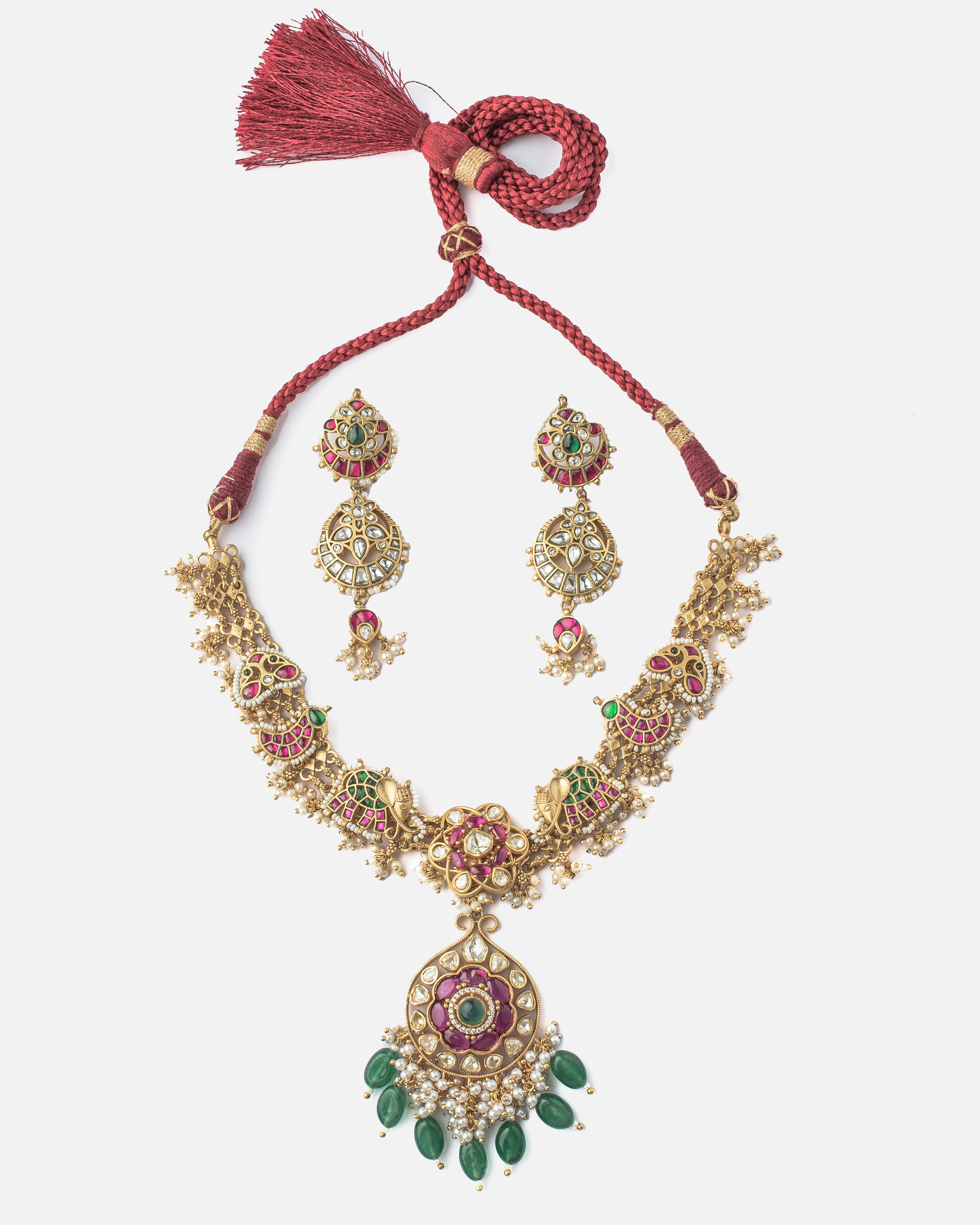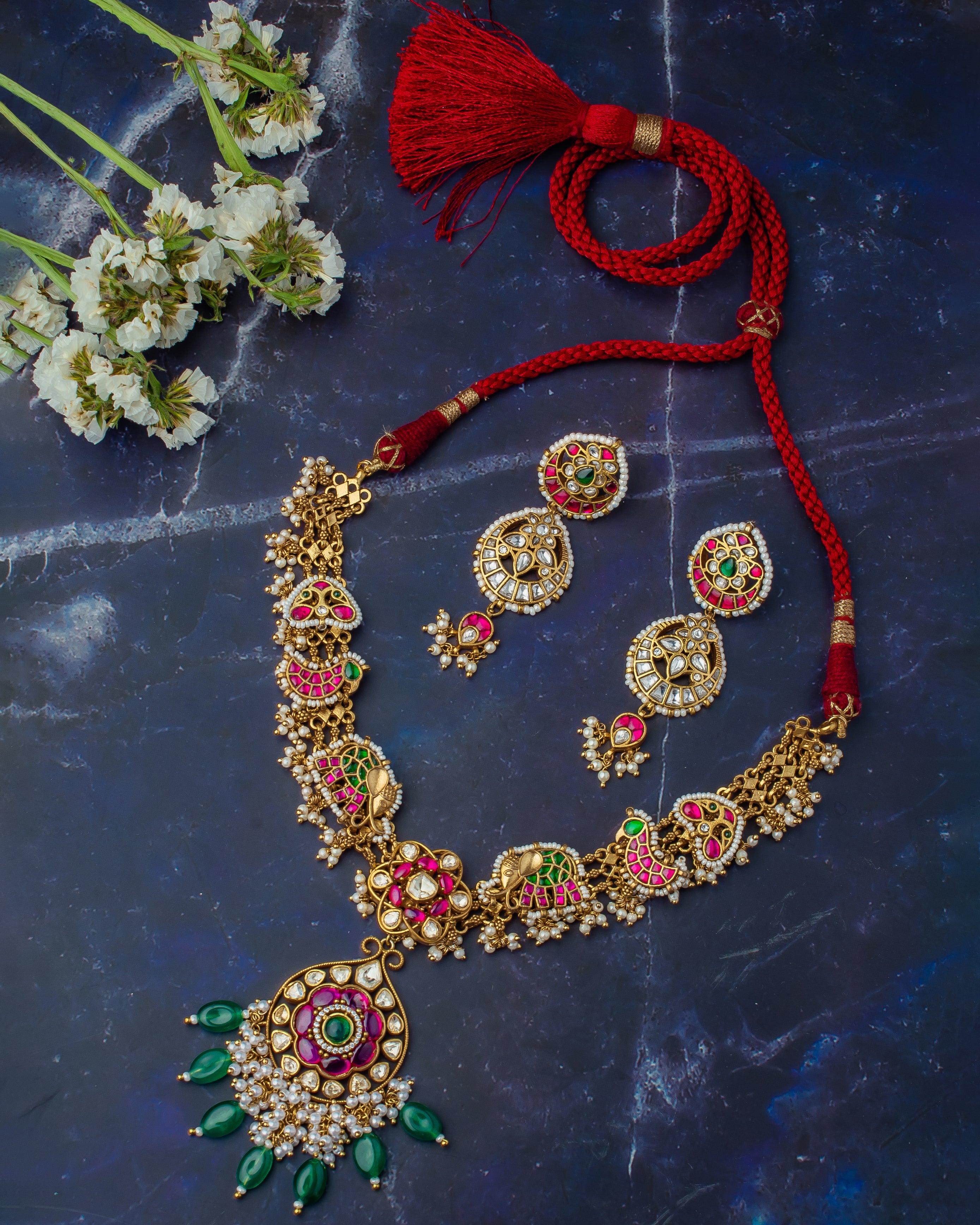 Exquisite handcrafted necklace set featuring vibrant gemstones, intricate gold detailing & matching earrings. A timeless piece perfect for special occasions. Elegance redefined for every celebration.